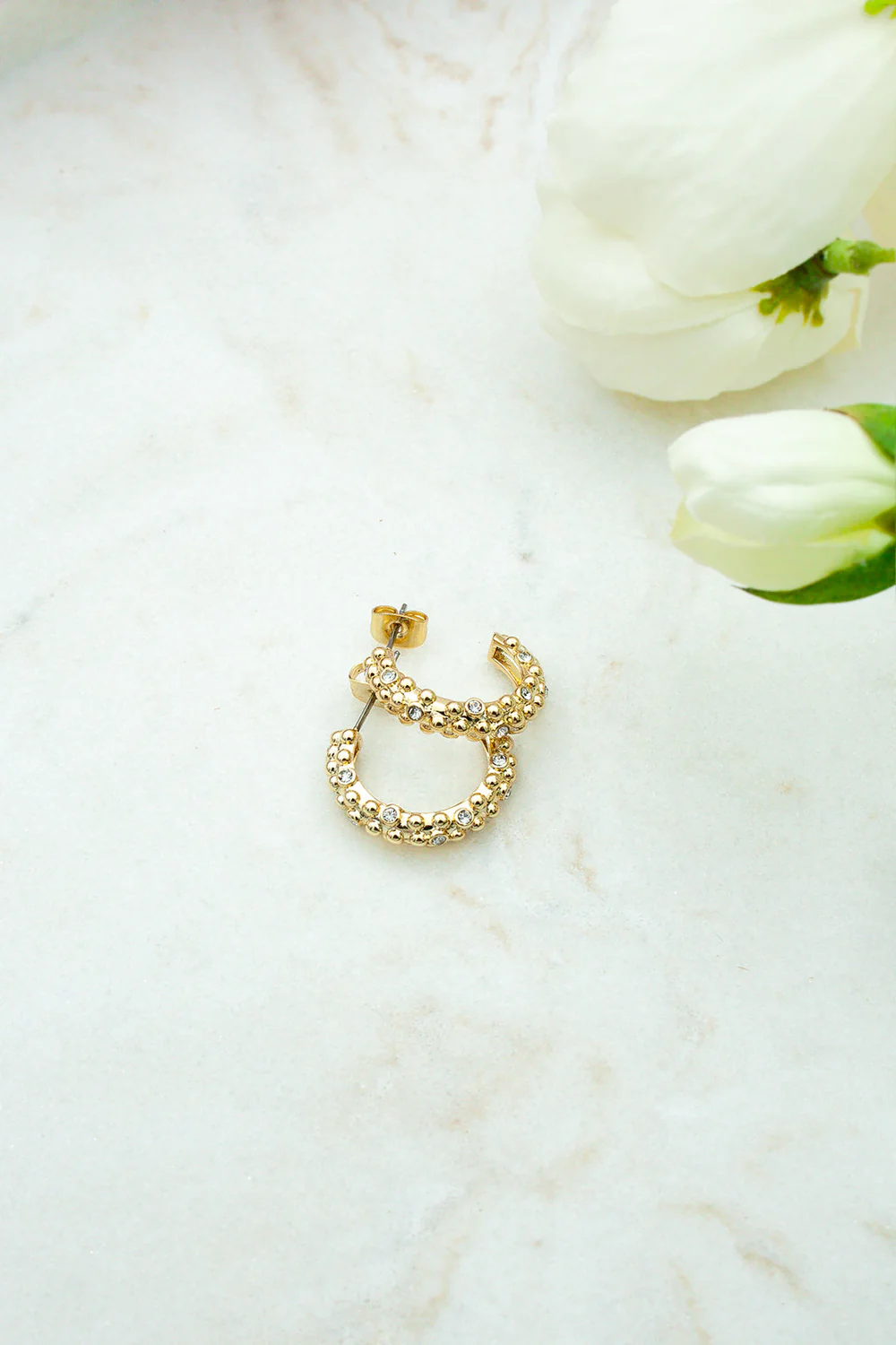 Disse elegante hoopsene kombinerer strukturert overflate med glitrende krystaller for et uttrykk som er både sofistikert og edgy. Den boblede formen gir liv og tekstur, mens de innfattede krystallene fanger lyset og tilfører et subtilt skinn.