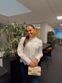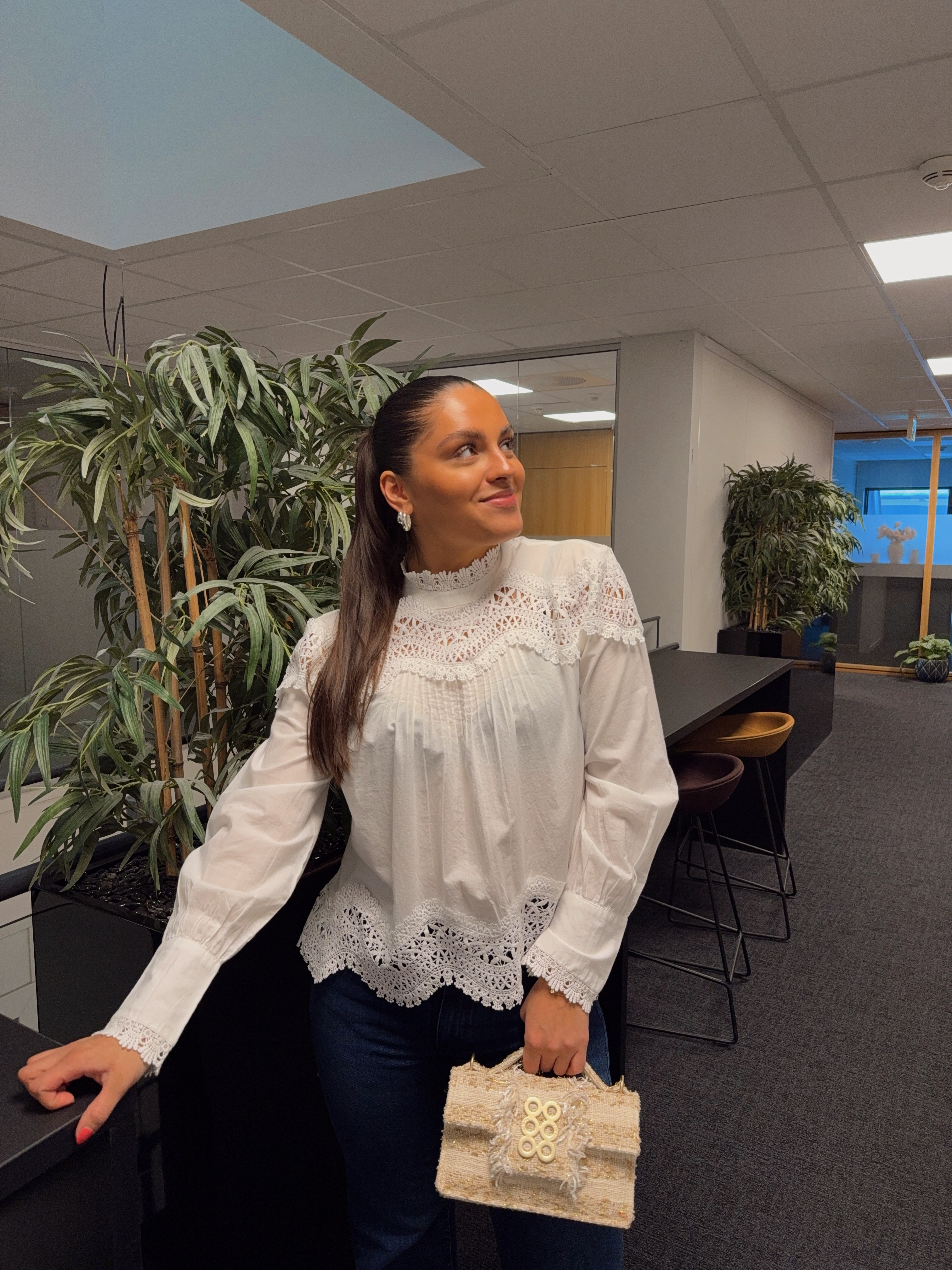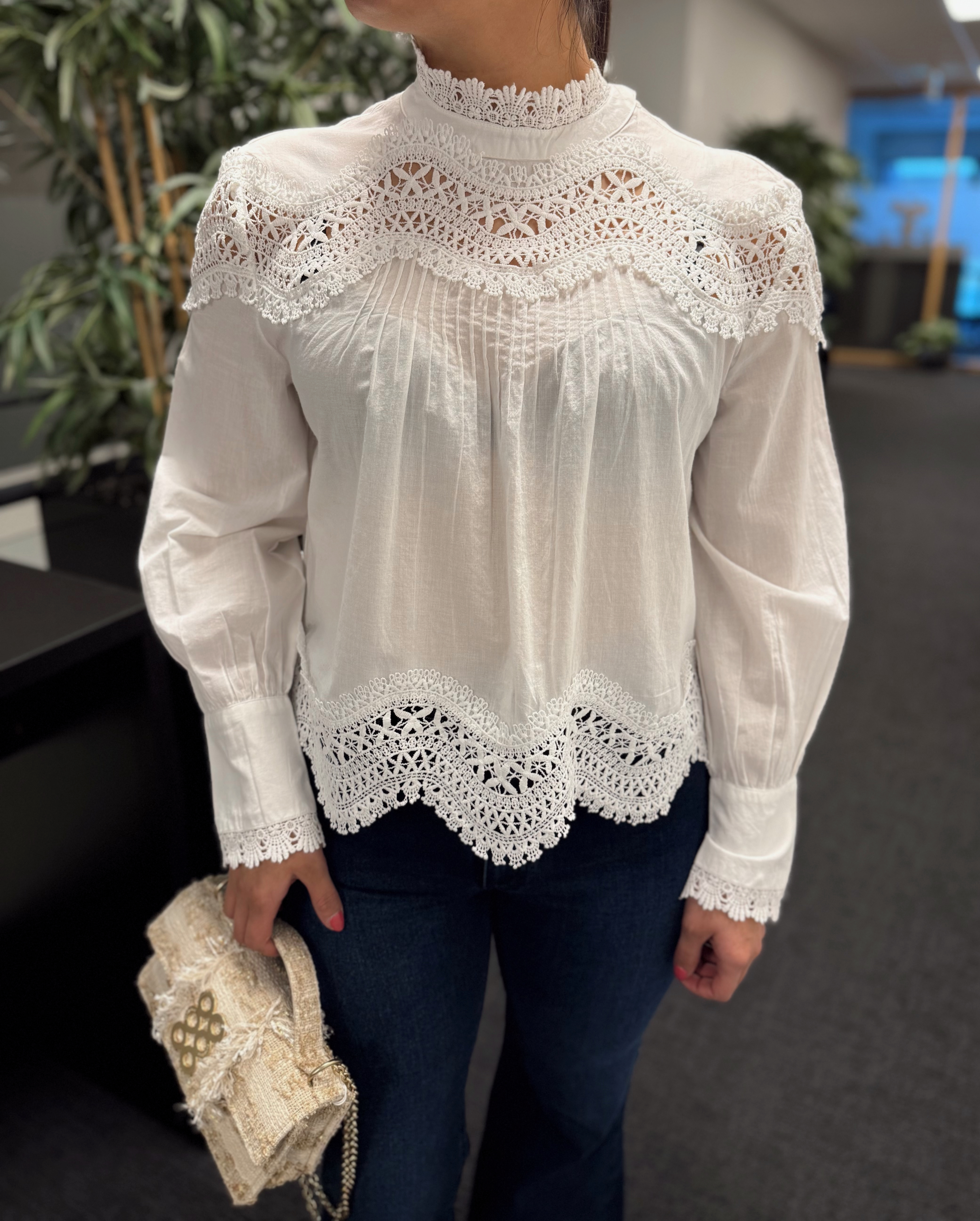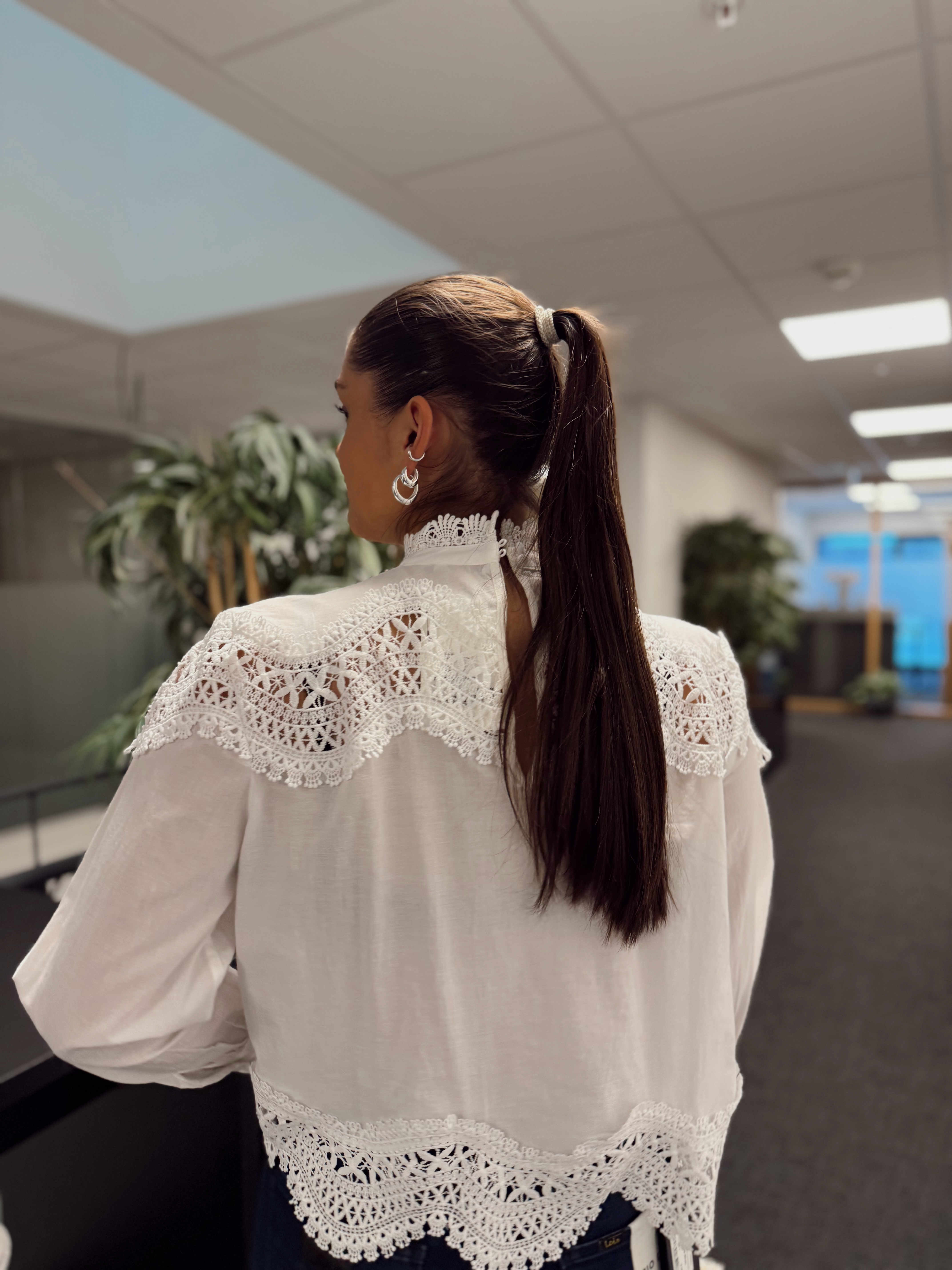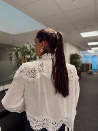 "Tria Blouse" fra Second Female er en bluse med blonder. Skjorten er laget i glatt, lett bomull med gjennomsiktige blondedetaljer. Har en høy rund hals med knappelukking bak. Lange ermer med knapper i mansjettene. Løs og luftig passform.