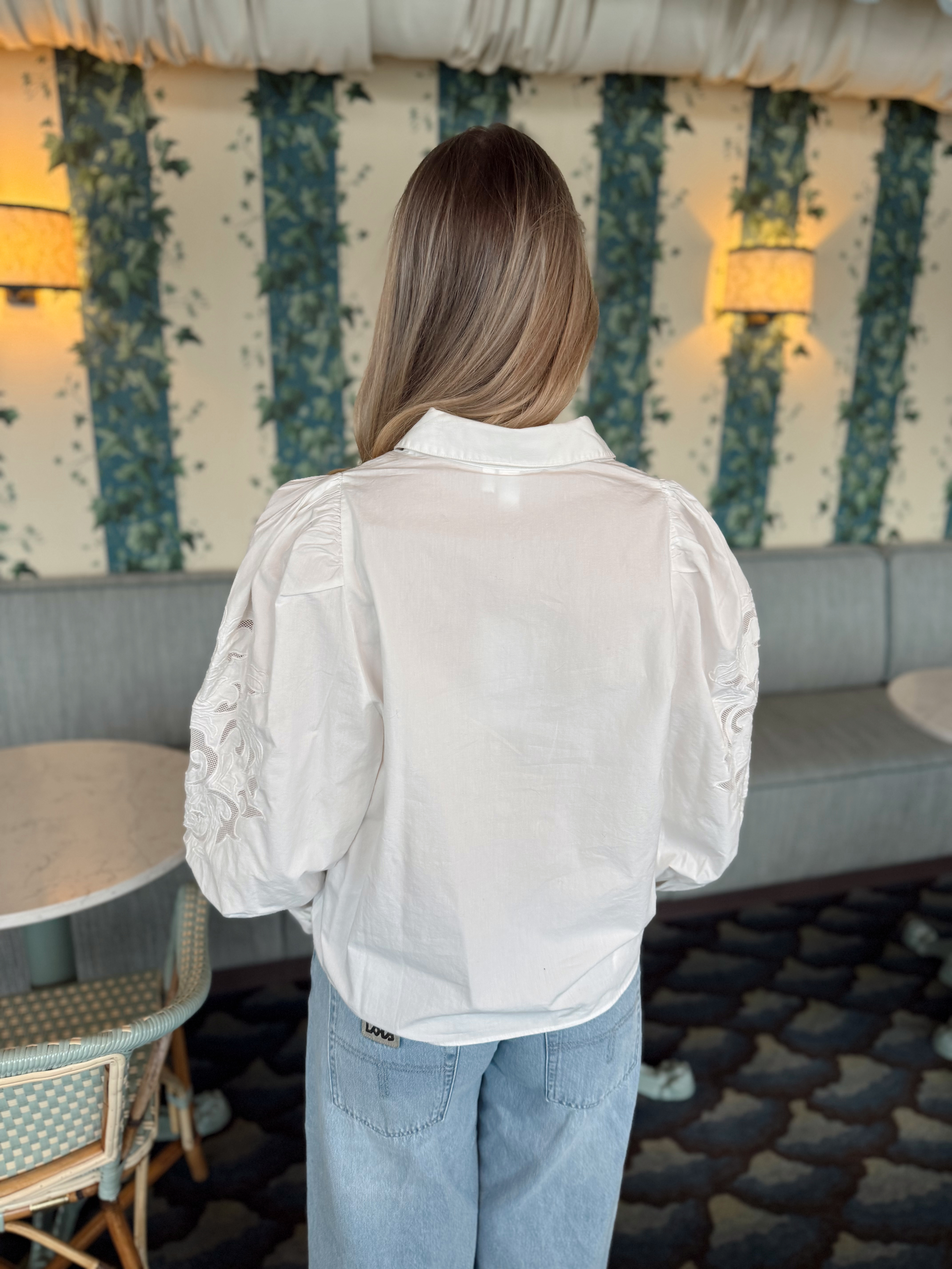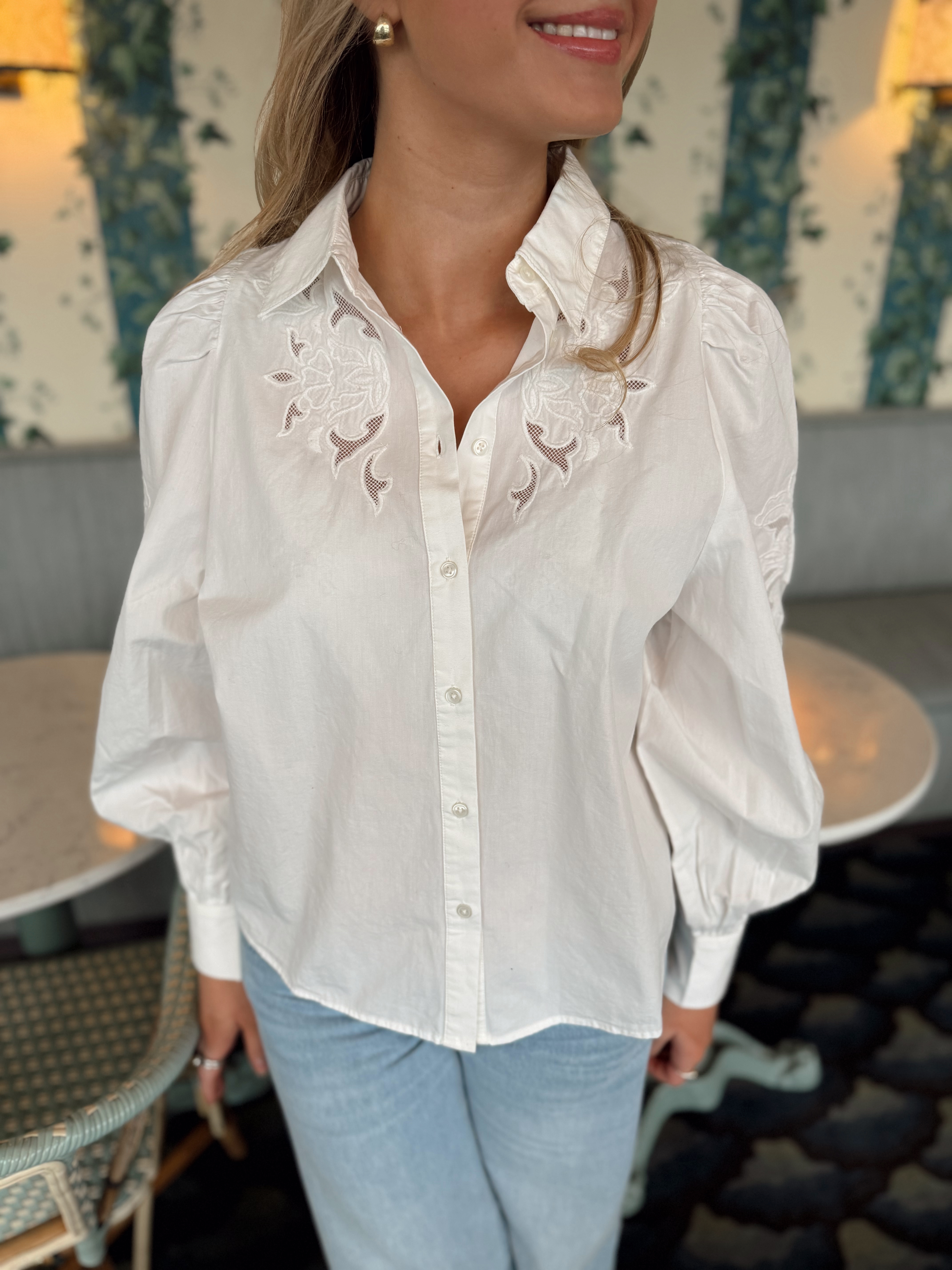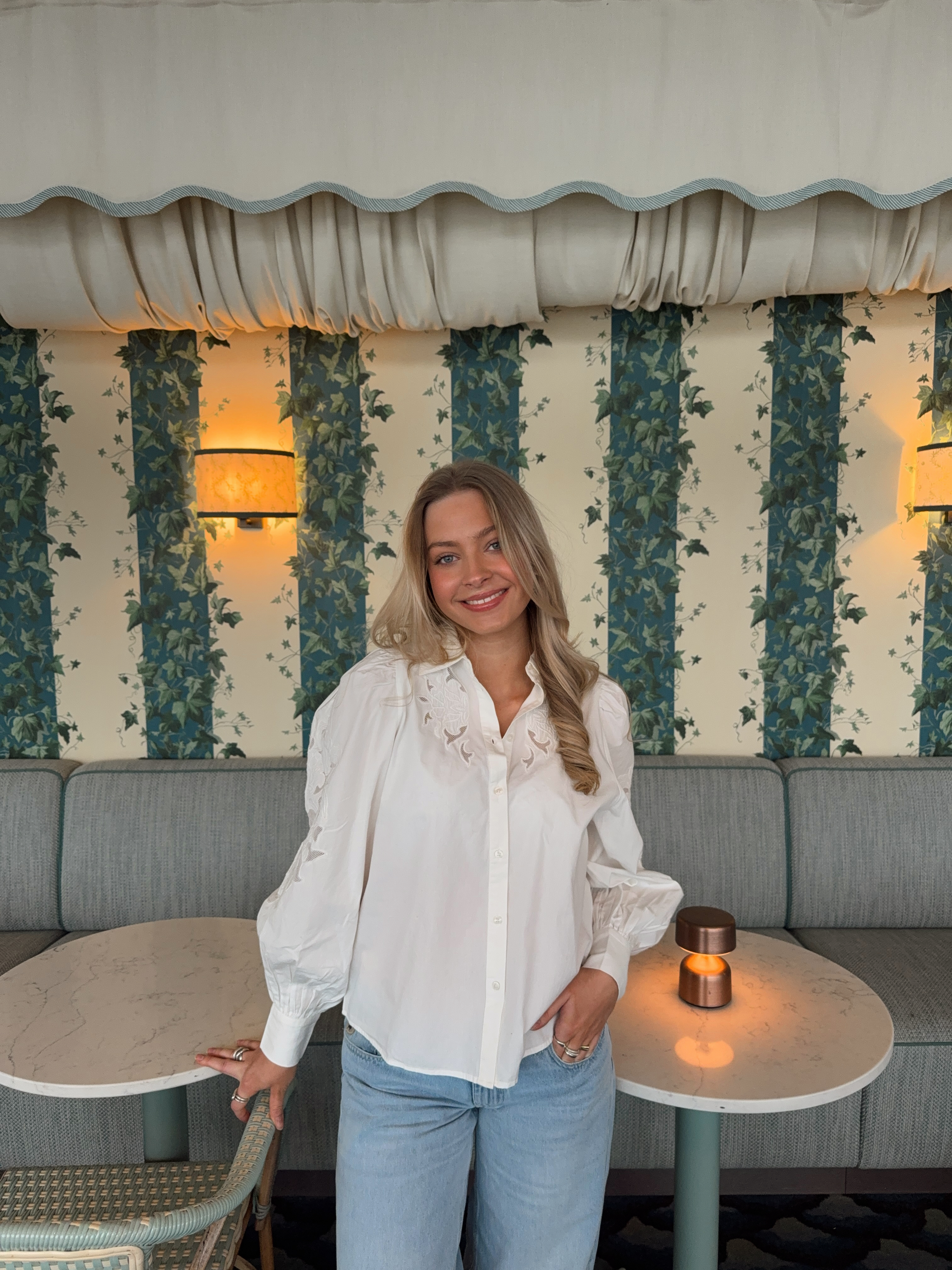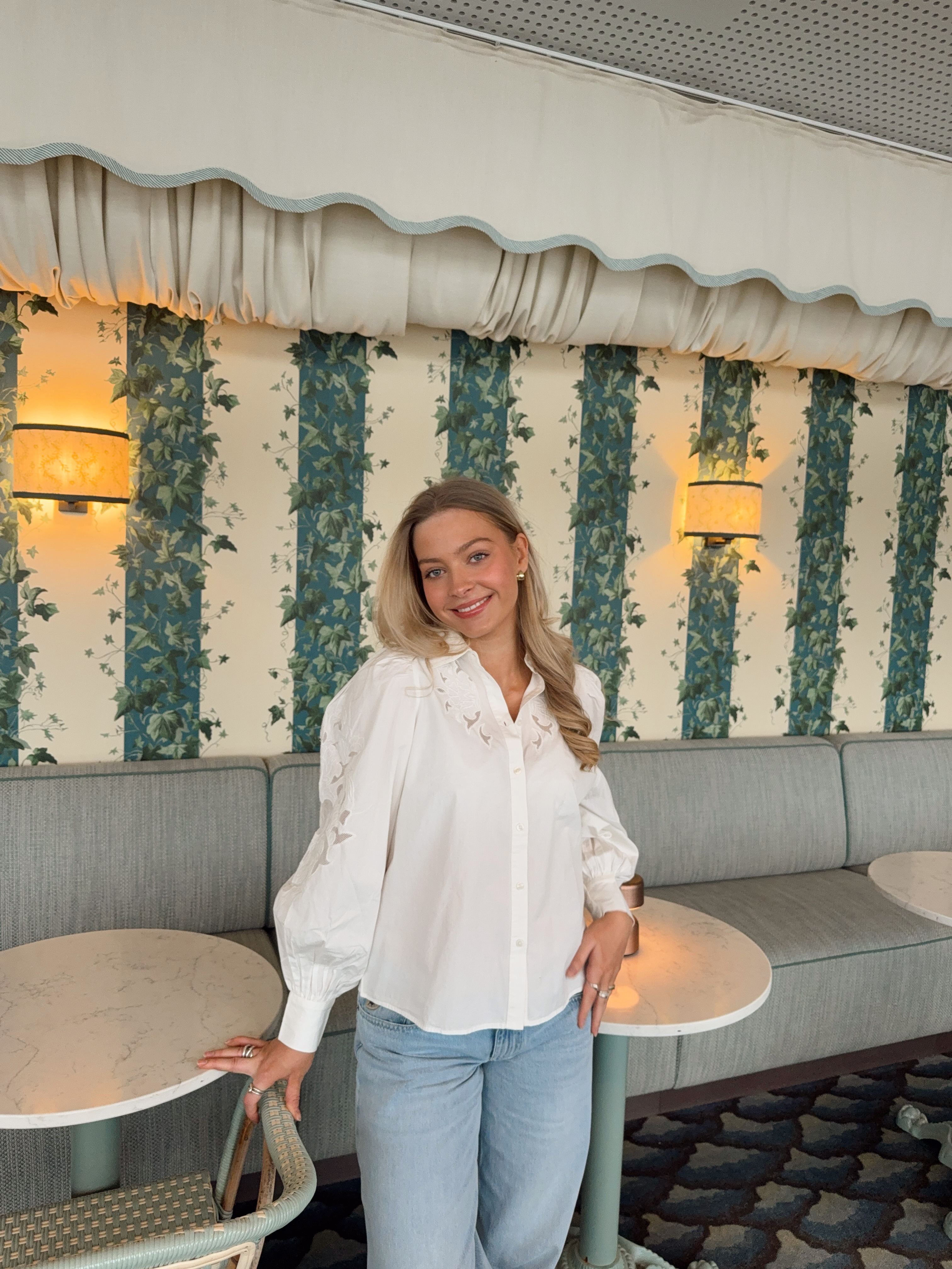«Zimia shirt» fra YAS er en nydelig skjorte med vakre broderier. Den har krage, ballong ermer og lukkes med knapper.