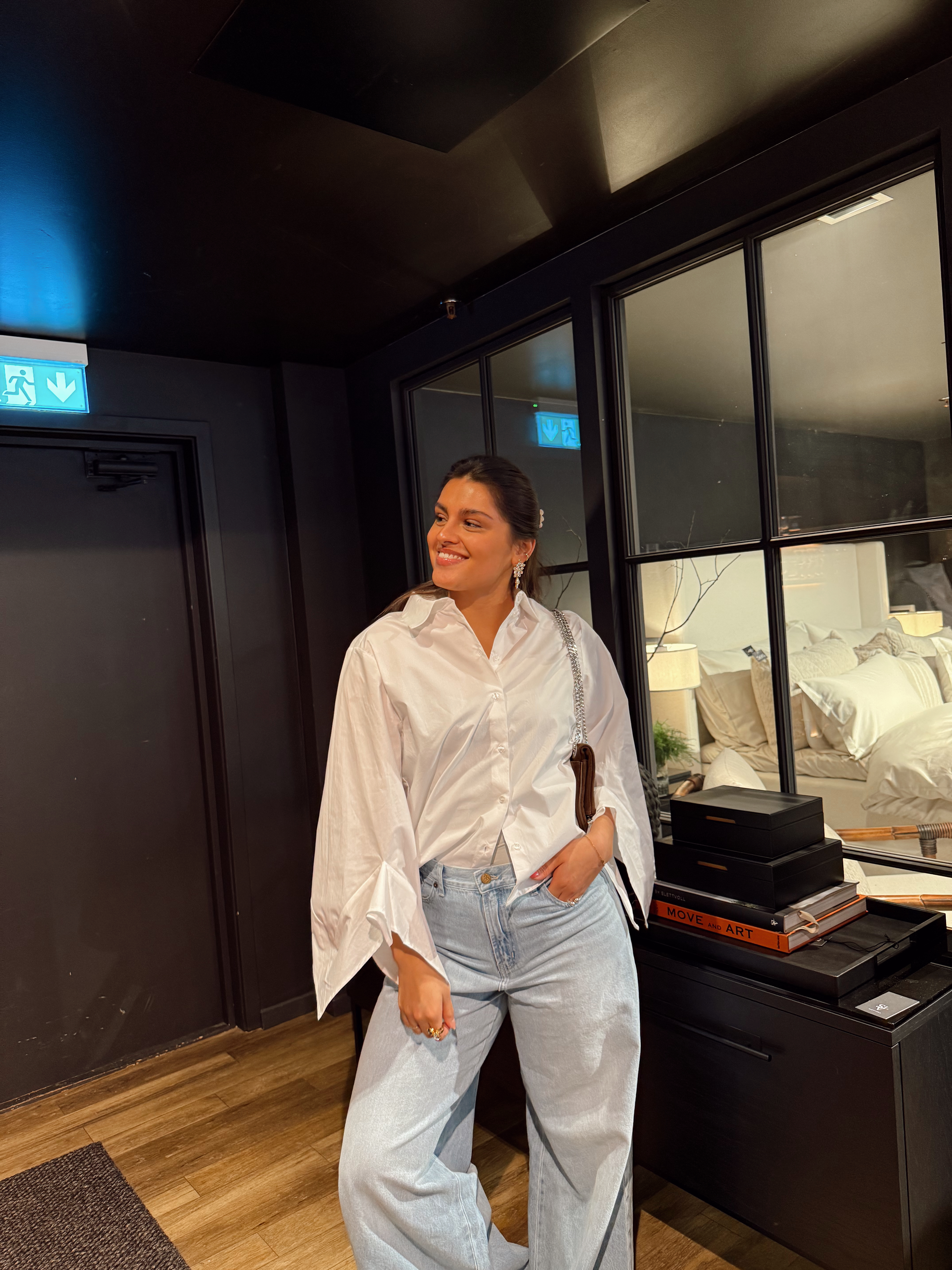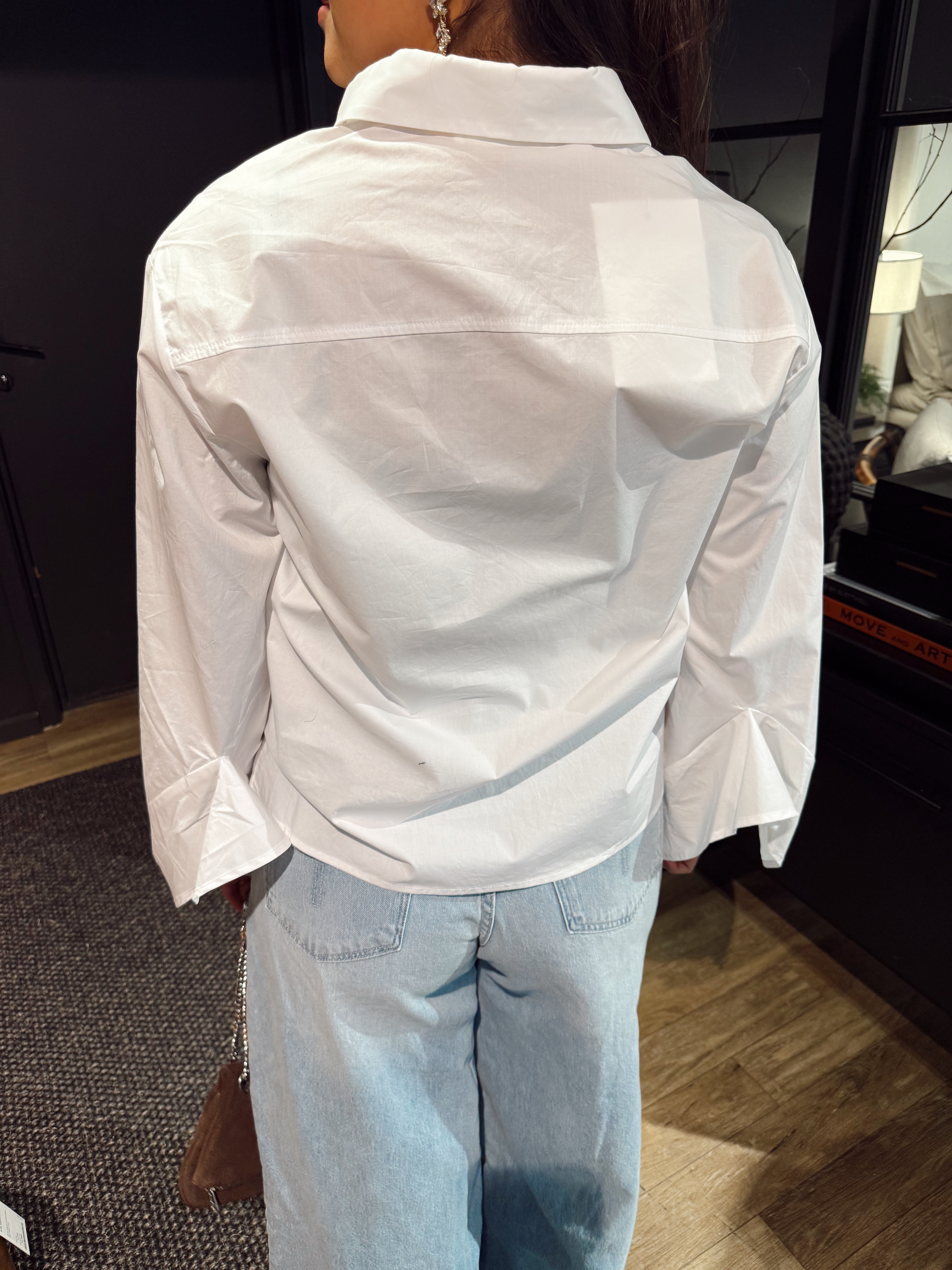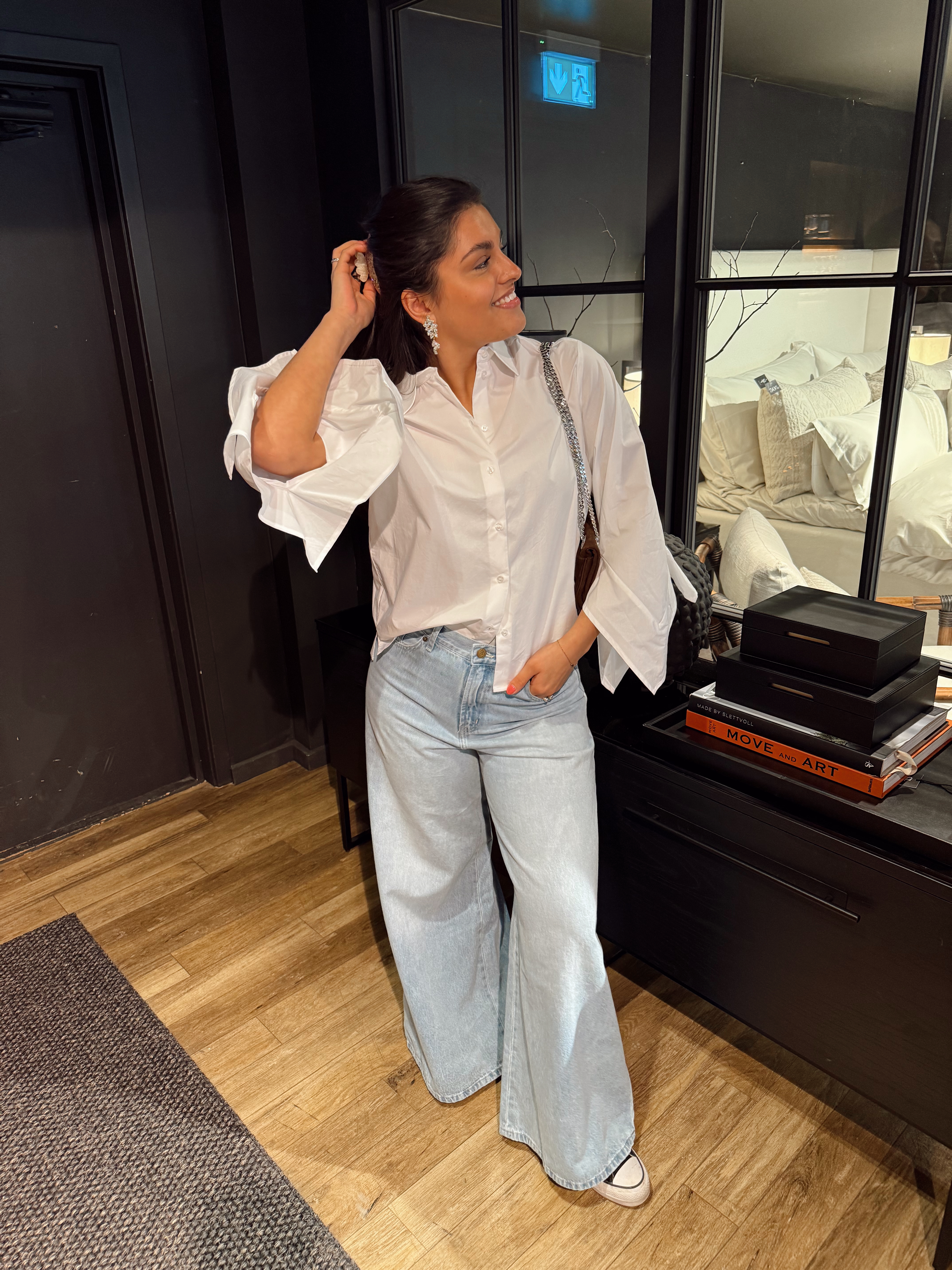 "Delia relaxed shirt founce shirt" fra Selected Femme er en oversized hvit skjorte med krage og store ermer med kule details.