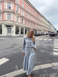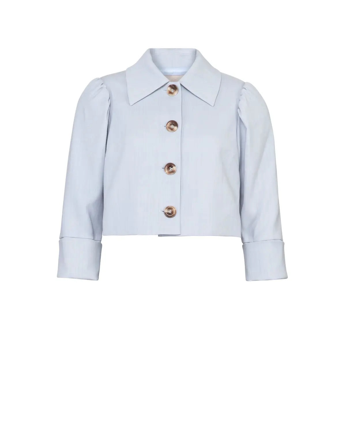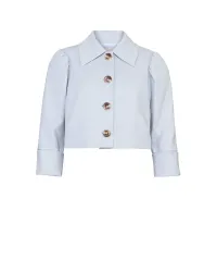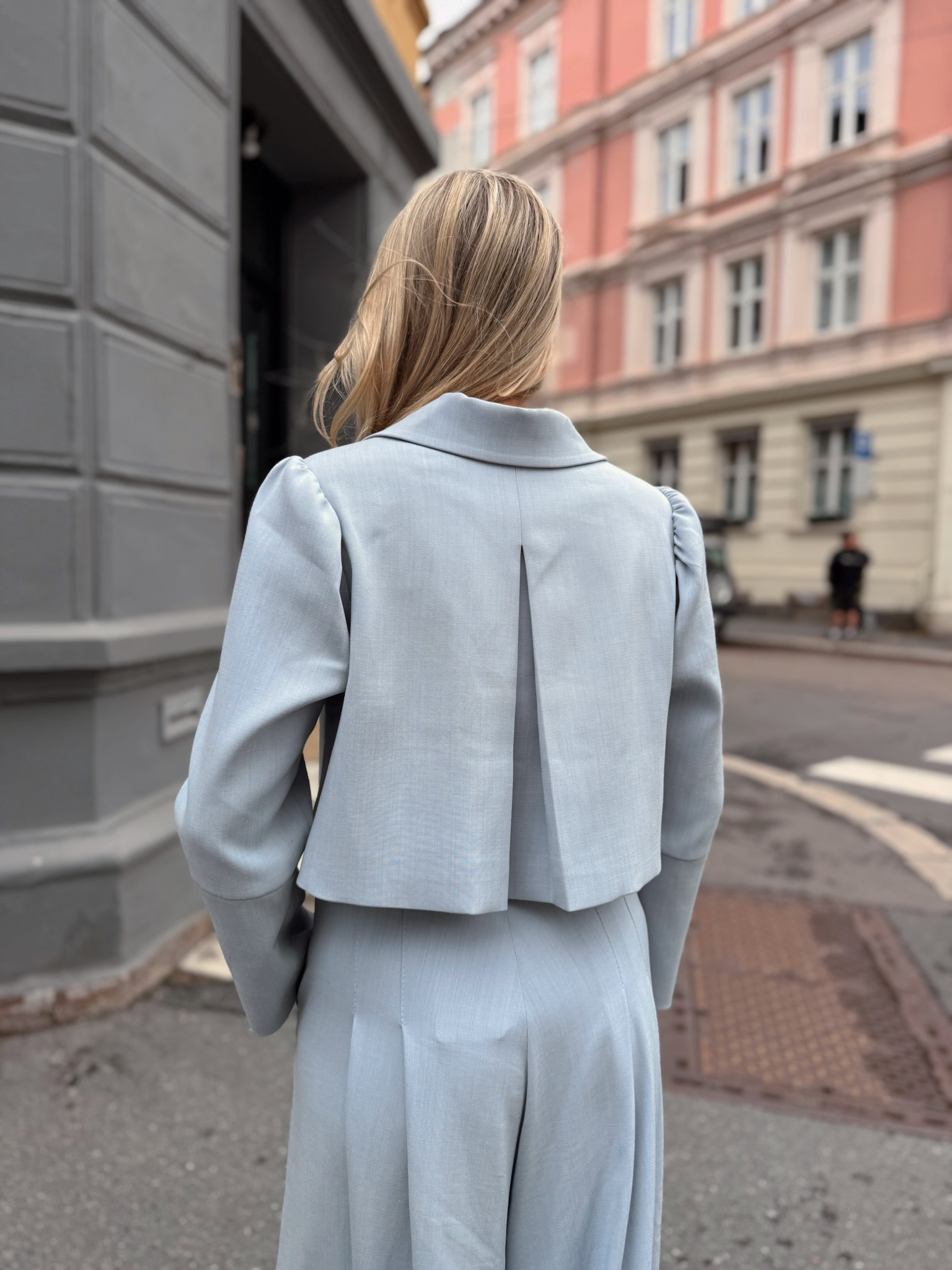 "Classique Jacket" fra byTiMo. Classique-jakken er laget i byTiMos luksuriøse og strukturerte kvalitet. Jakken har en rett og lett cropped passform, med lange ermer og puffede skuldre. Den har krage og knapper hele veien ned foran. Den perfekte lille jakken å bruke over dine favoritt kjoler eller å style med Classique Culottes for en komplett look!