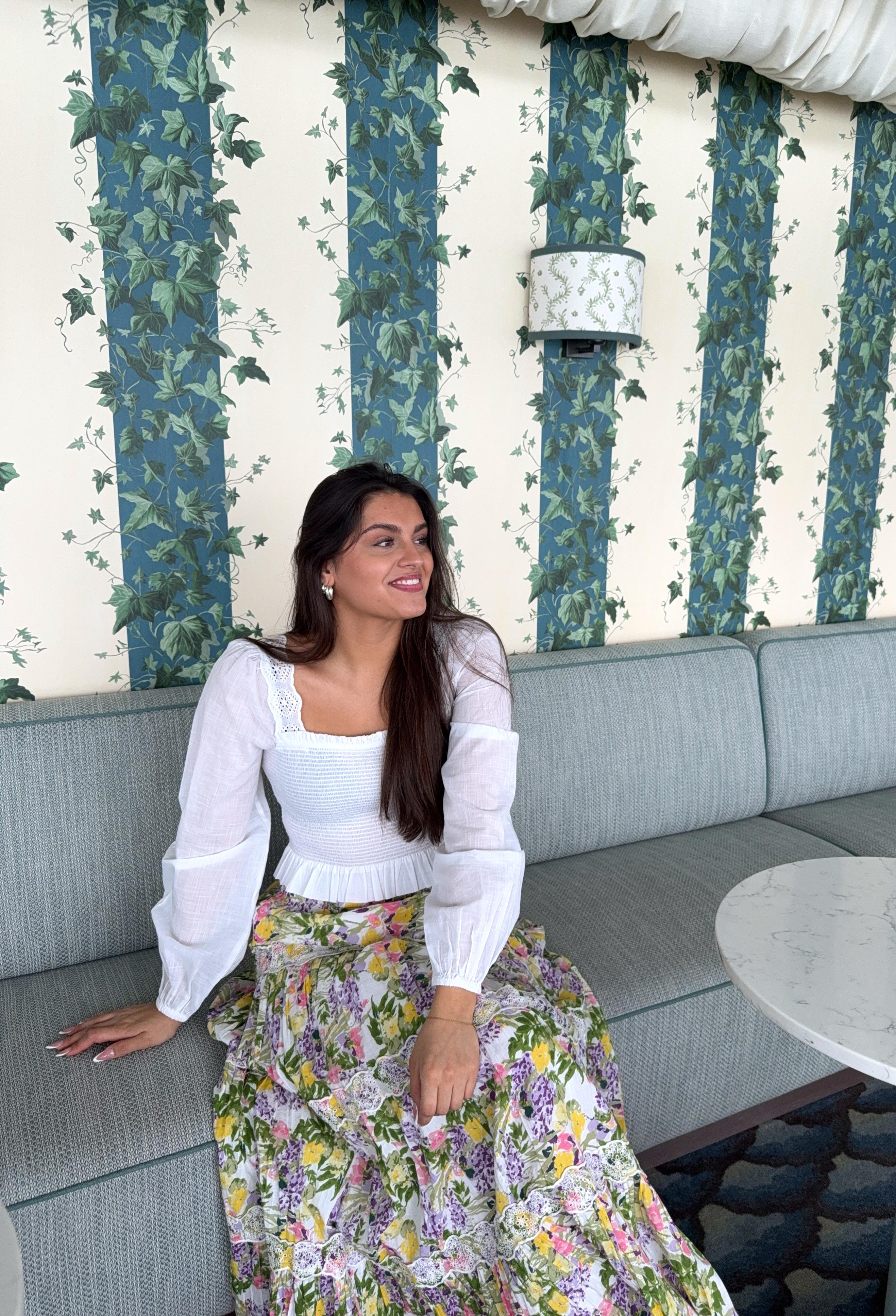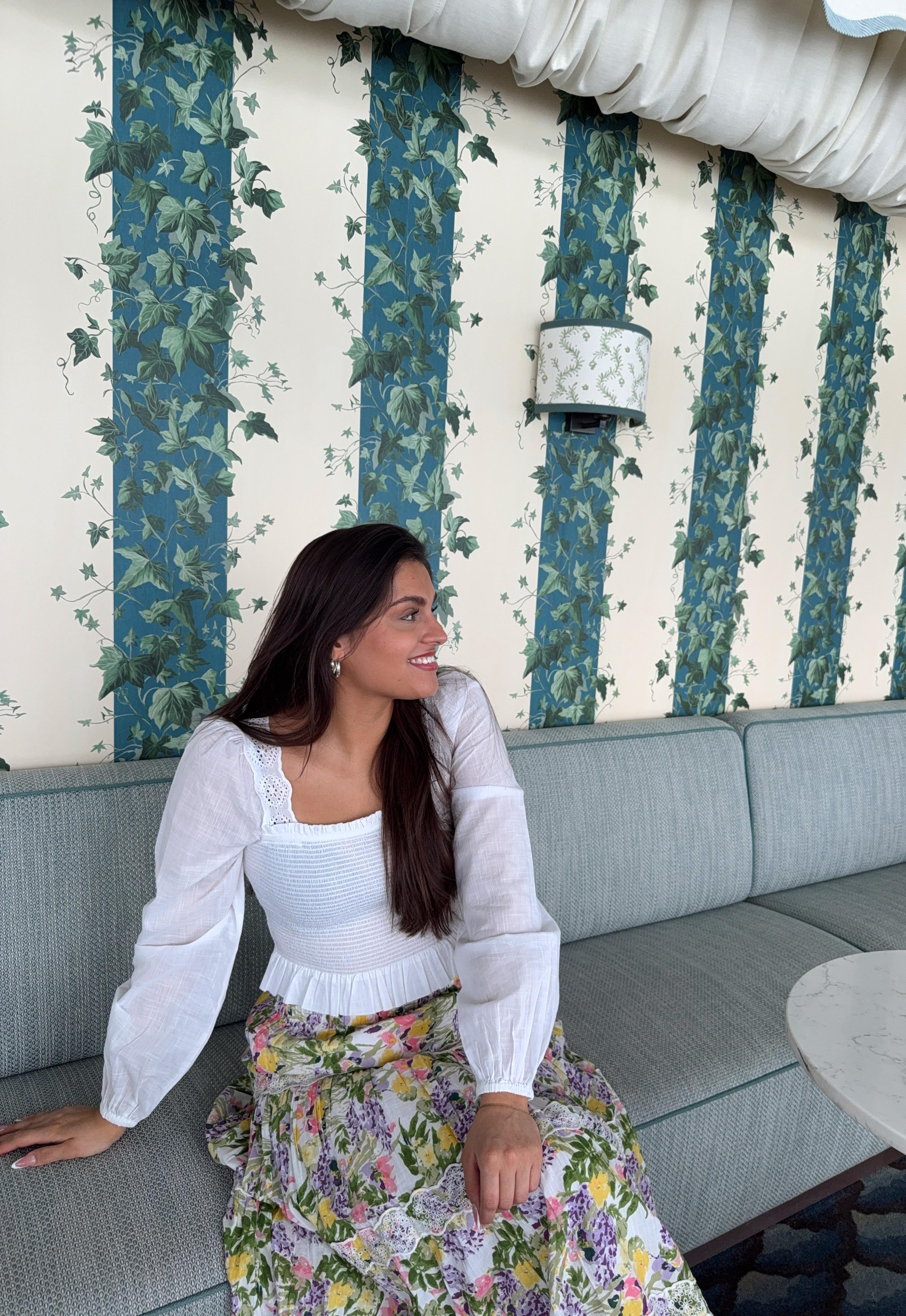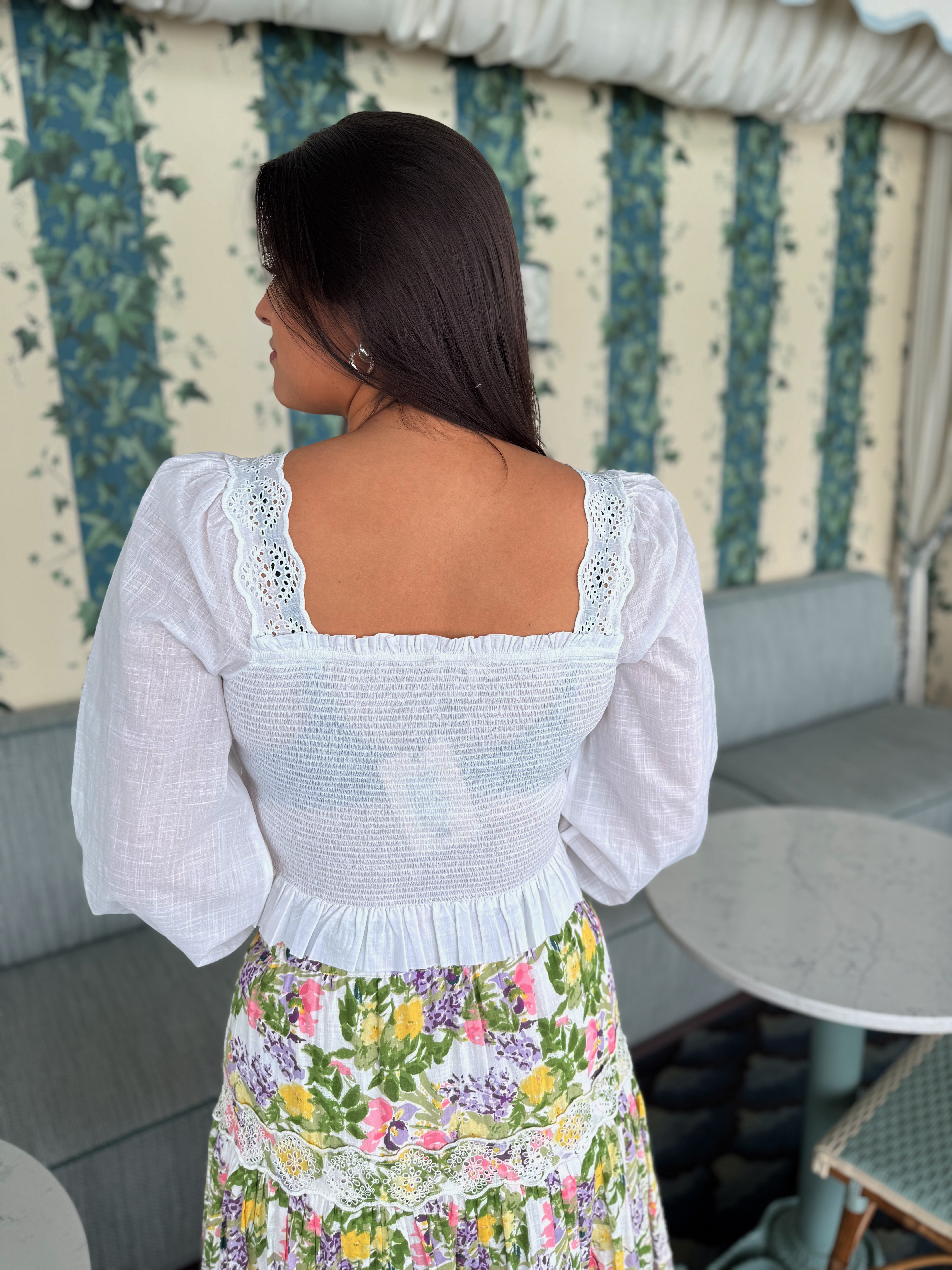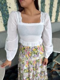 "Cotton Slub Top" fra byTiMo. Cotton Slub Top er laget i byTiMos lette og myke, GOTS-sertifiserte kvalitet, med slub-detaljer i stoffet. Toppen har en tettsittende silhuett med smock, firkantet utringning og en kort lengde med volangkant nederst. Den har lange, voluminøse ermer med elastiske mansjetter, samt vakre innsatser med broderie anglaise på skuldrene.