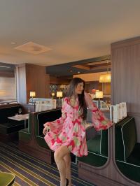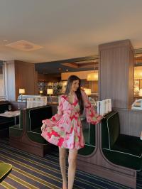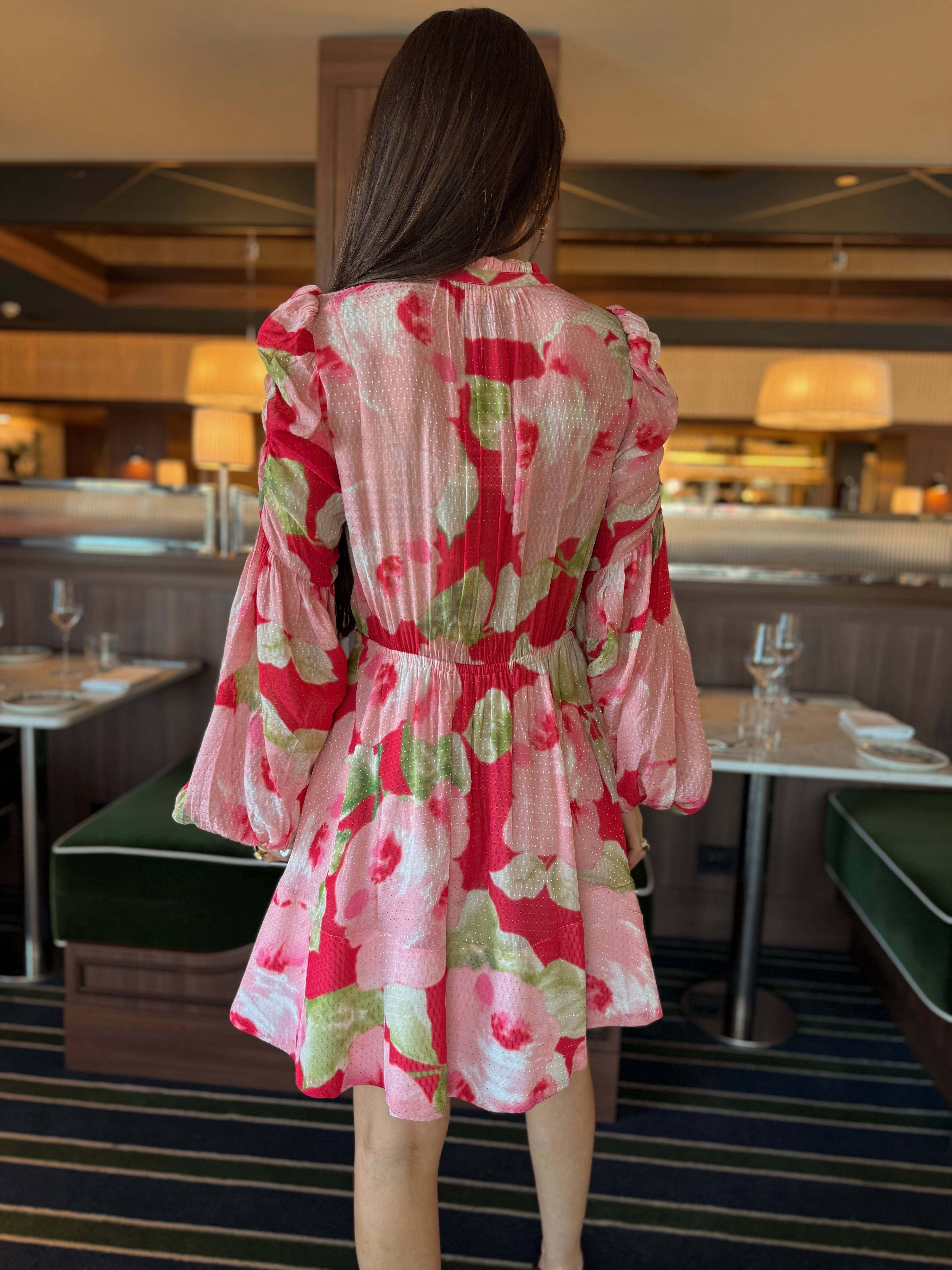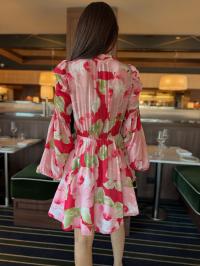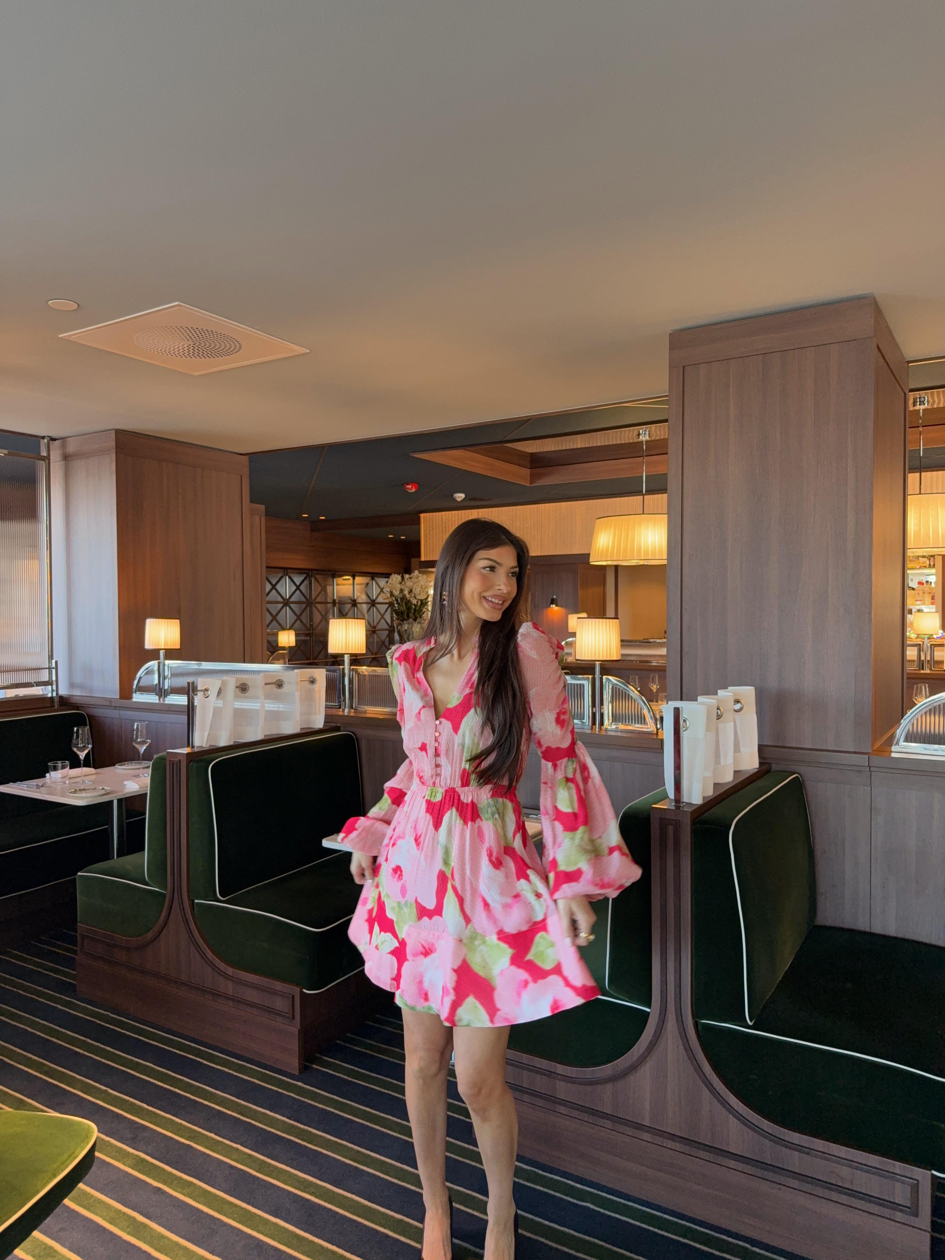 "Dotted Georgette V-Neck Dress" fra byTiMo er laget i byTiMos delikate og lett transparente, FSC-sertifiserte viskosegeorgette. Kjolen har minilengde og en definert midje med elastikk. Den har mandarinkrage, dyp V-utringning med knapper i overdelen, A-formet skjørt og lange, voluminøse ermer med elastiske mansjetter. Overarmene har rynkedetaljer, og kjolen lukkes med glidelås i siden.