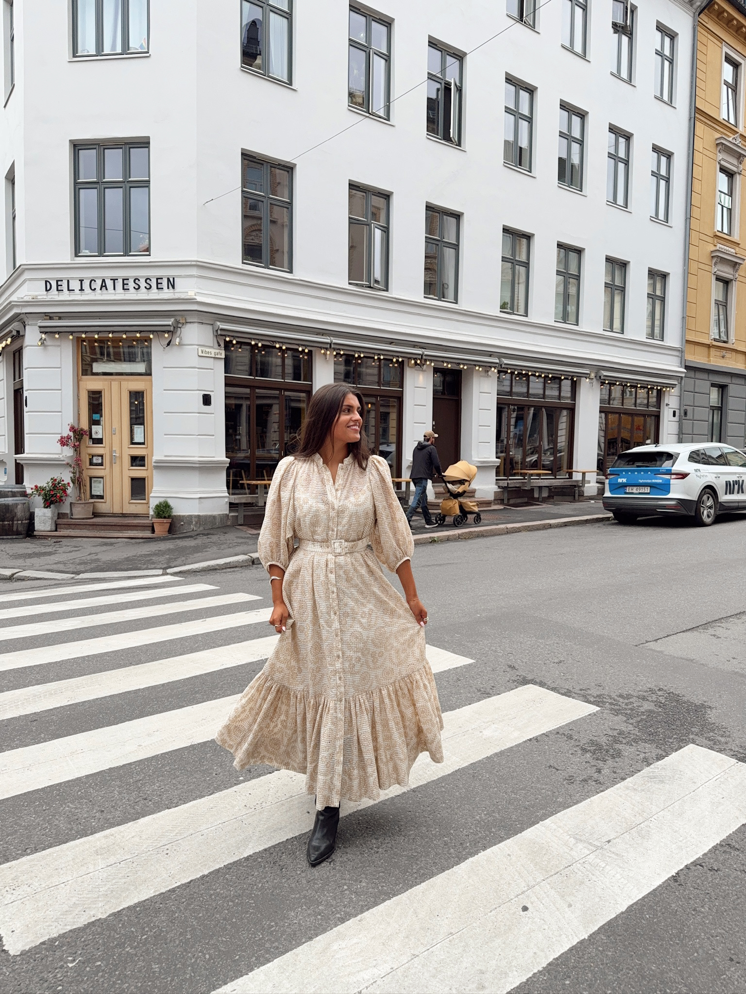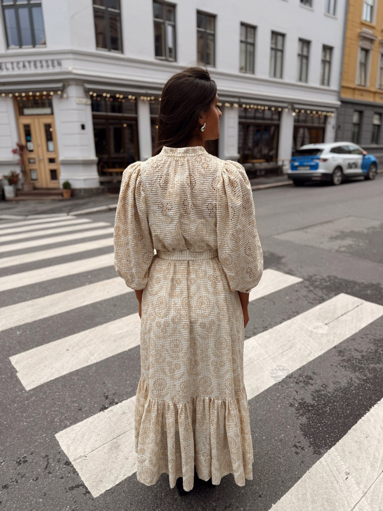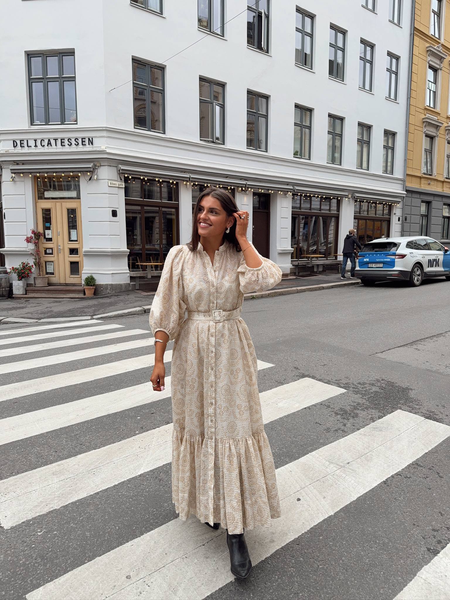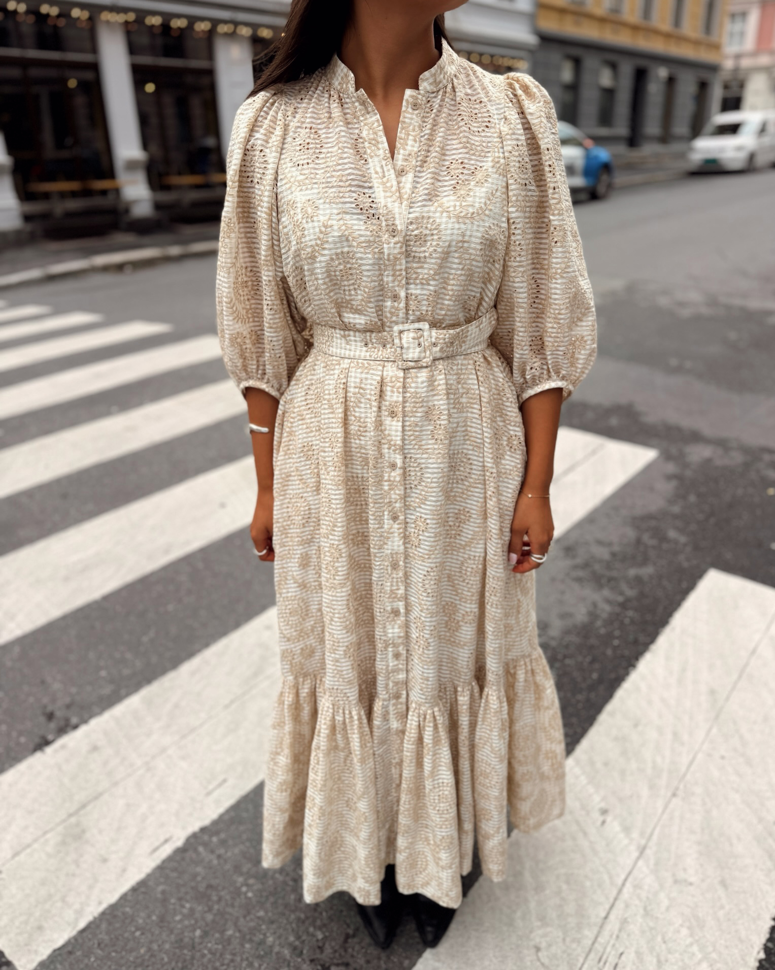 "Checks Belt Dress" fra byTiMo. Super lekker midi kjole med nydelige broderi detaljer. Kjolen har trekvart puffermer med stramme mansjetter. Tidløst og avtagbart belte i midjen. Lukkes med elegante knapper.