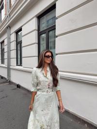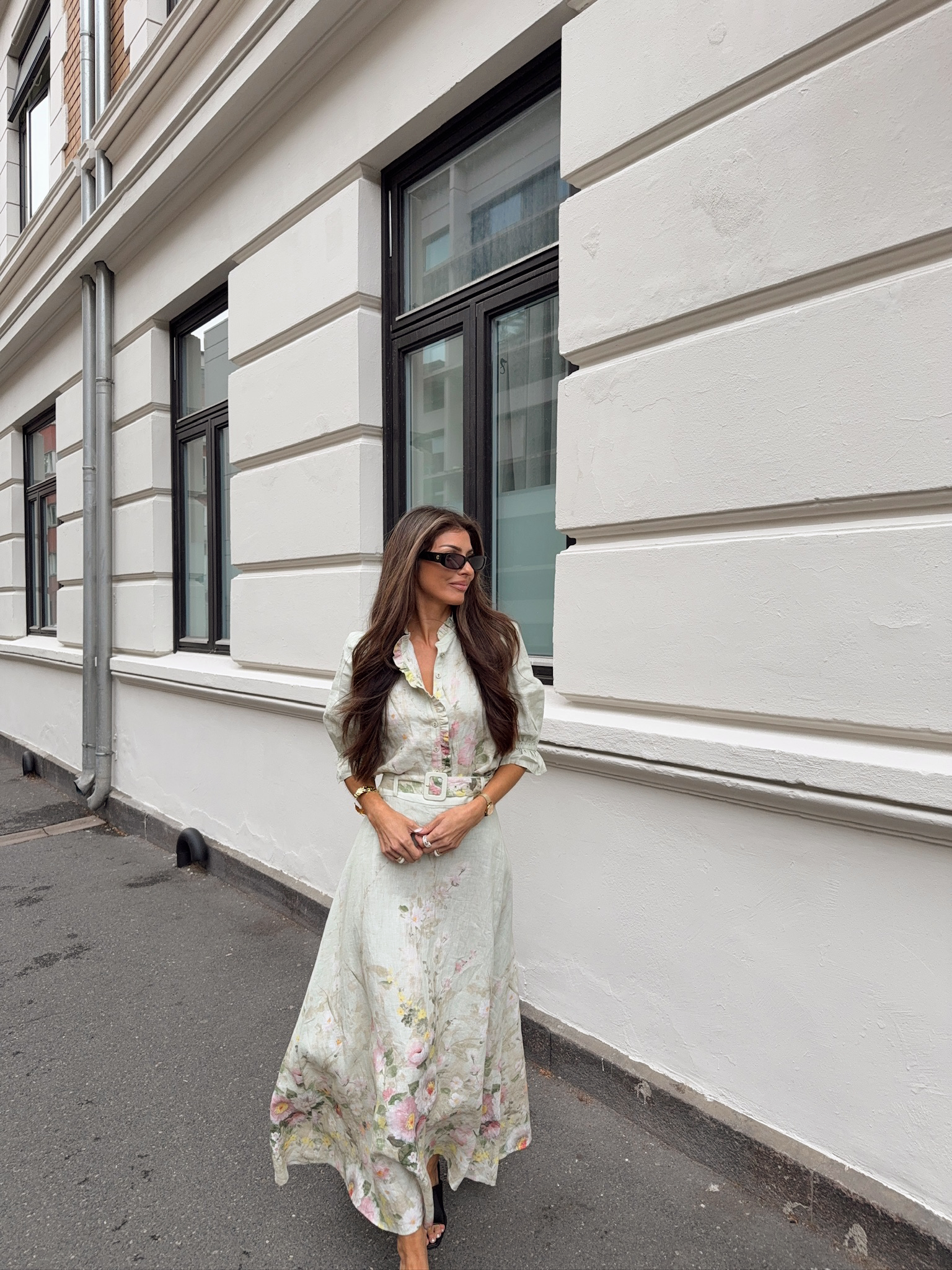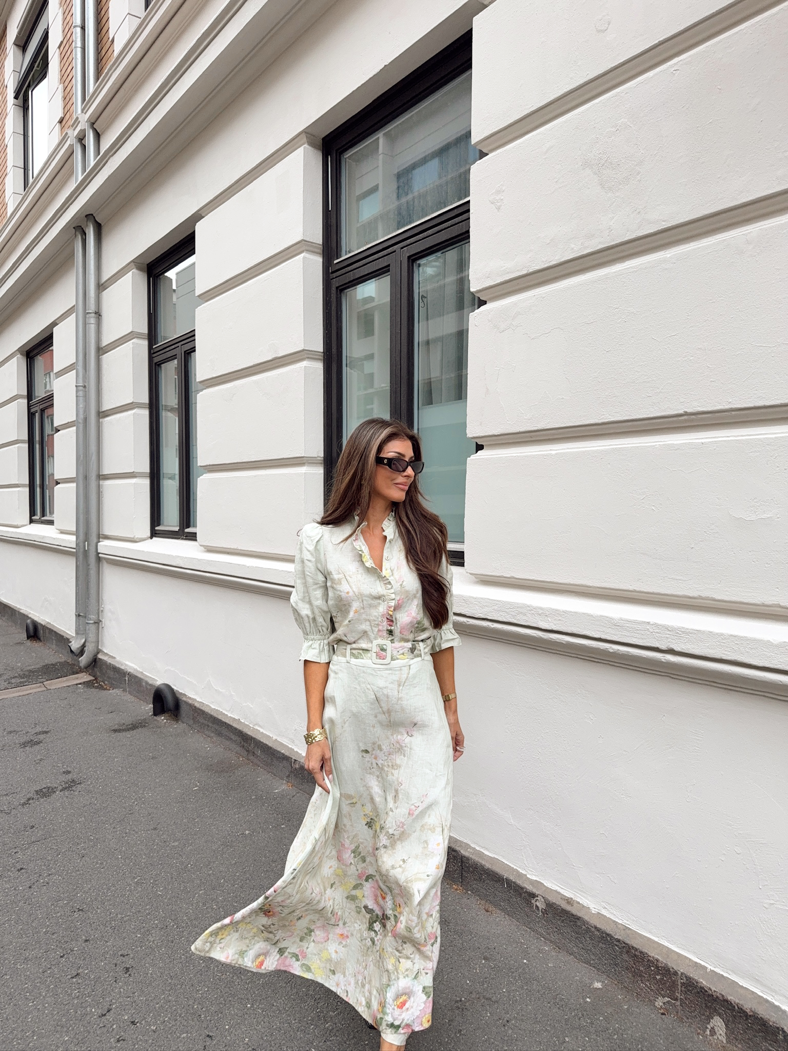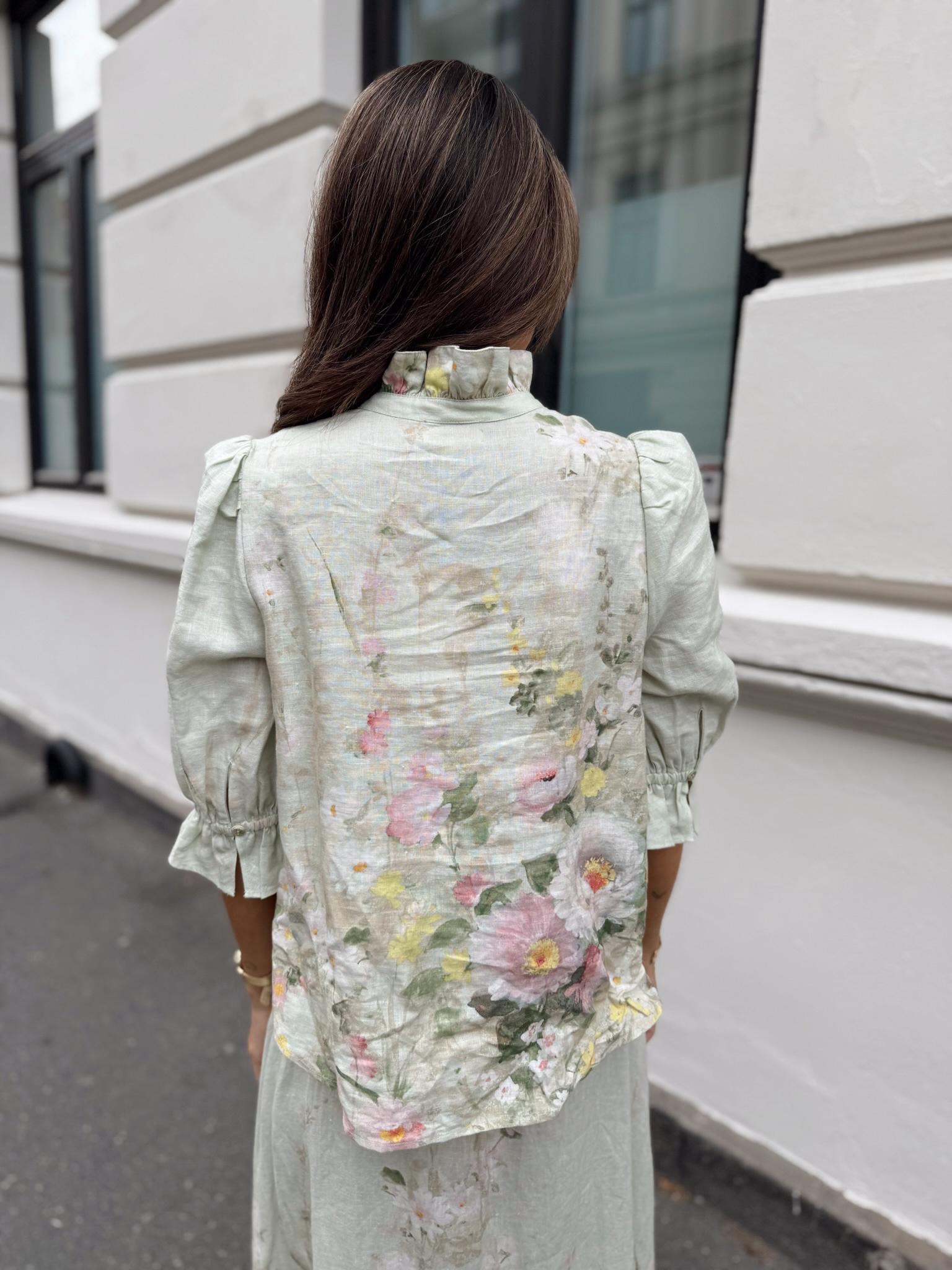"Linen Blouse" fra byTiMo er laget i byTiMos fine kvalitet av OEKO-TEX®-sertifisert lin. Blusen har en rett silhuett, mandarinkrage og ermer i trekvart lengde med elastiske mansjetter. Den har volangdetaljer på mansjettene og rundt halsen, samt knapper ned foran.