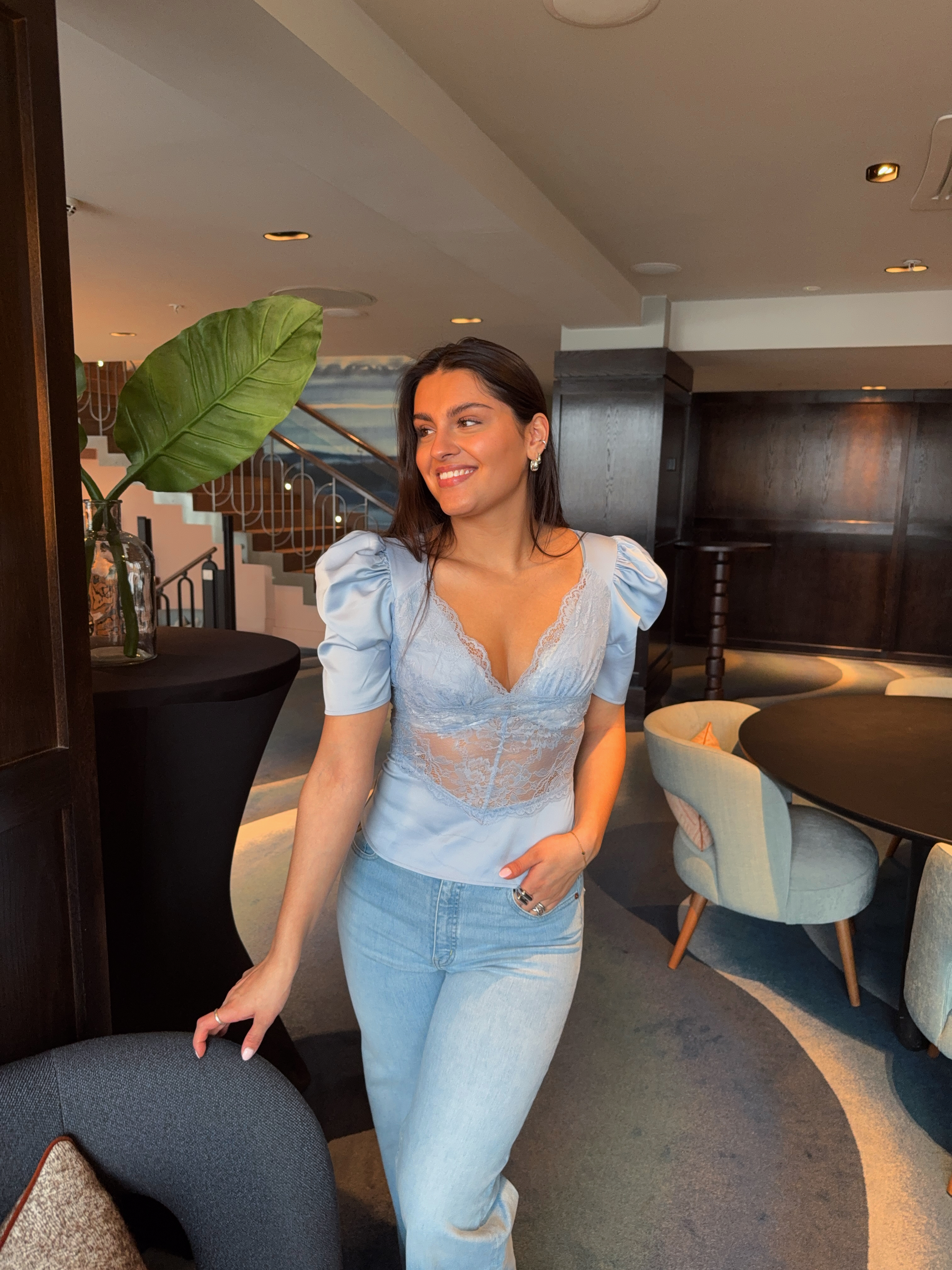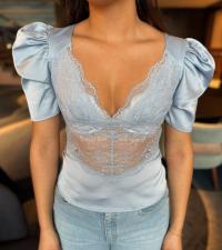 «Francis Lace Top» fra Love Lolita rålekker top. Toppen har en gjennomsiktig midje som tilfører en touch av mystikk, puffede ermer med skulderputer for en dose glamour, og en dyp V-hals som fremhever den sofistikerte stilen. Kombiner toppen med dine favorittjeans eller skjørt for en komplett look.