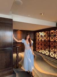 "Francis Lace Midi Dress" fra LoveLolina. Denne løfter sommer garderoben til nye høyder. Kjolen er gjennomsiktig i midjen og har puffede ermer med skulderputer. Den har en dyp v-hals og a-formet silhuettskjørt. Kombineres med et par elegante siletter for et komplett antrekk!