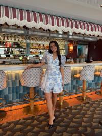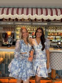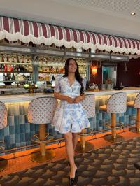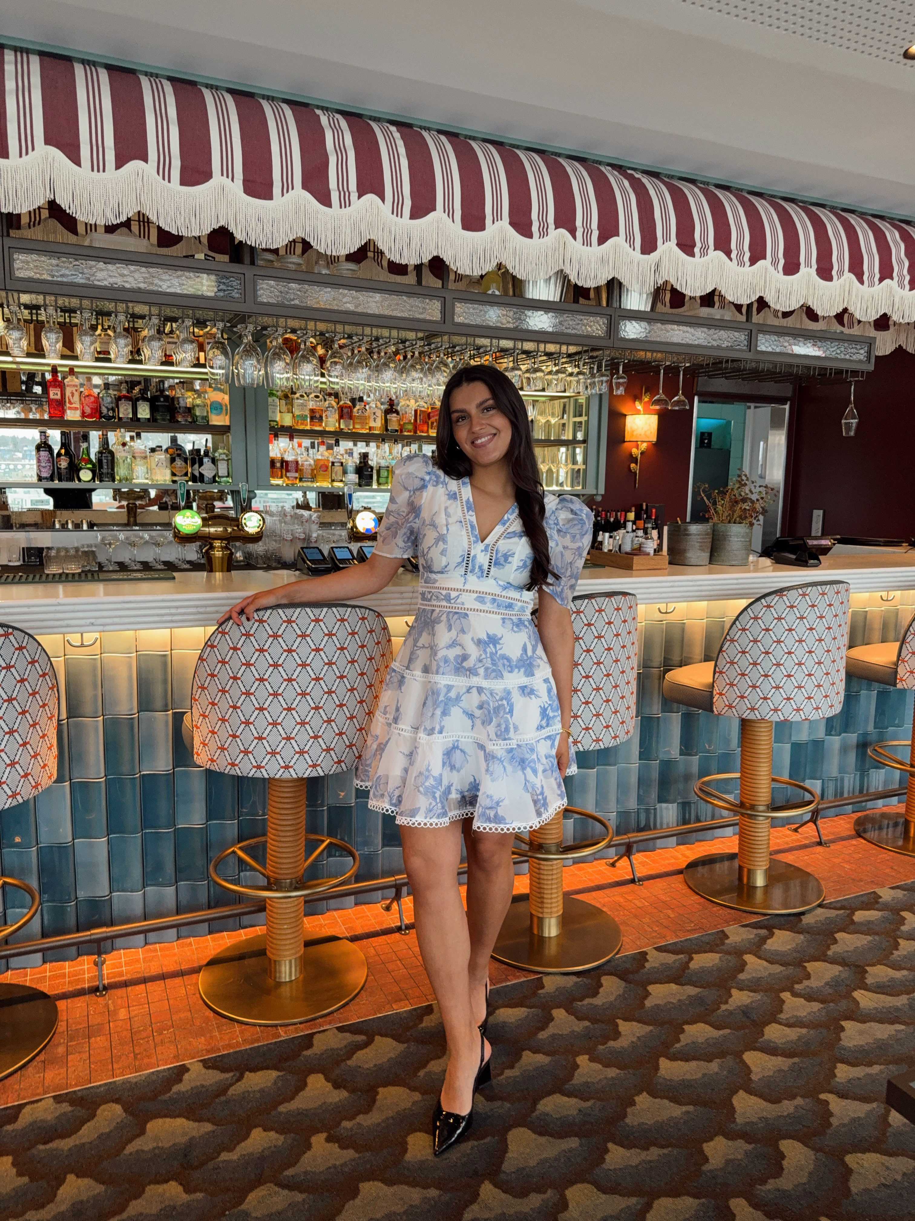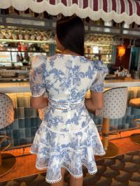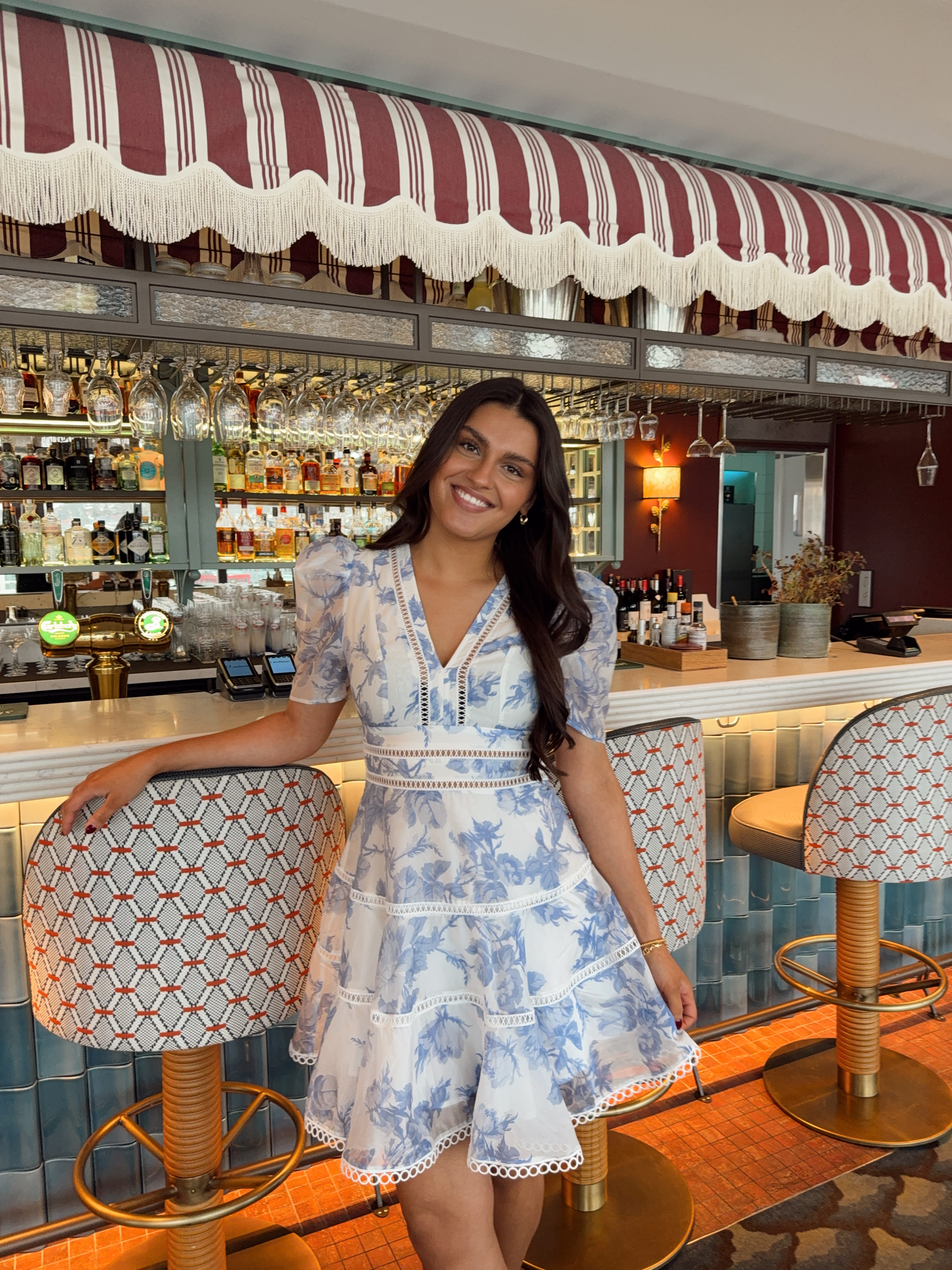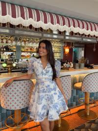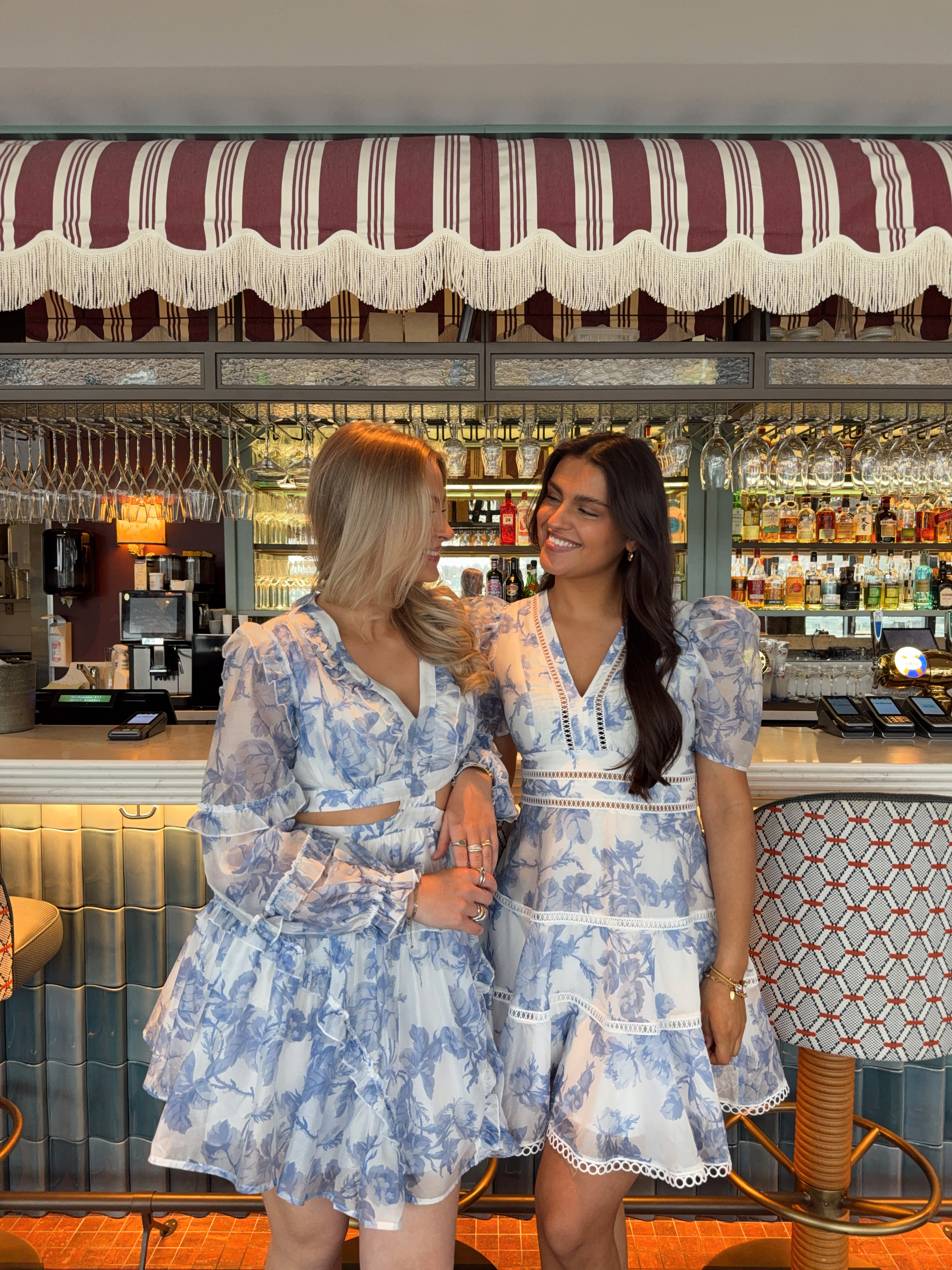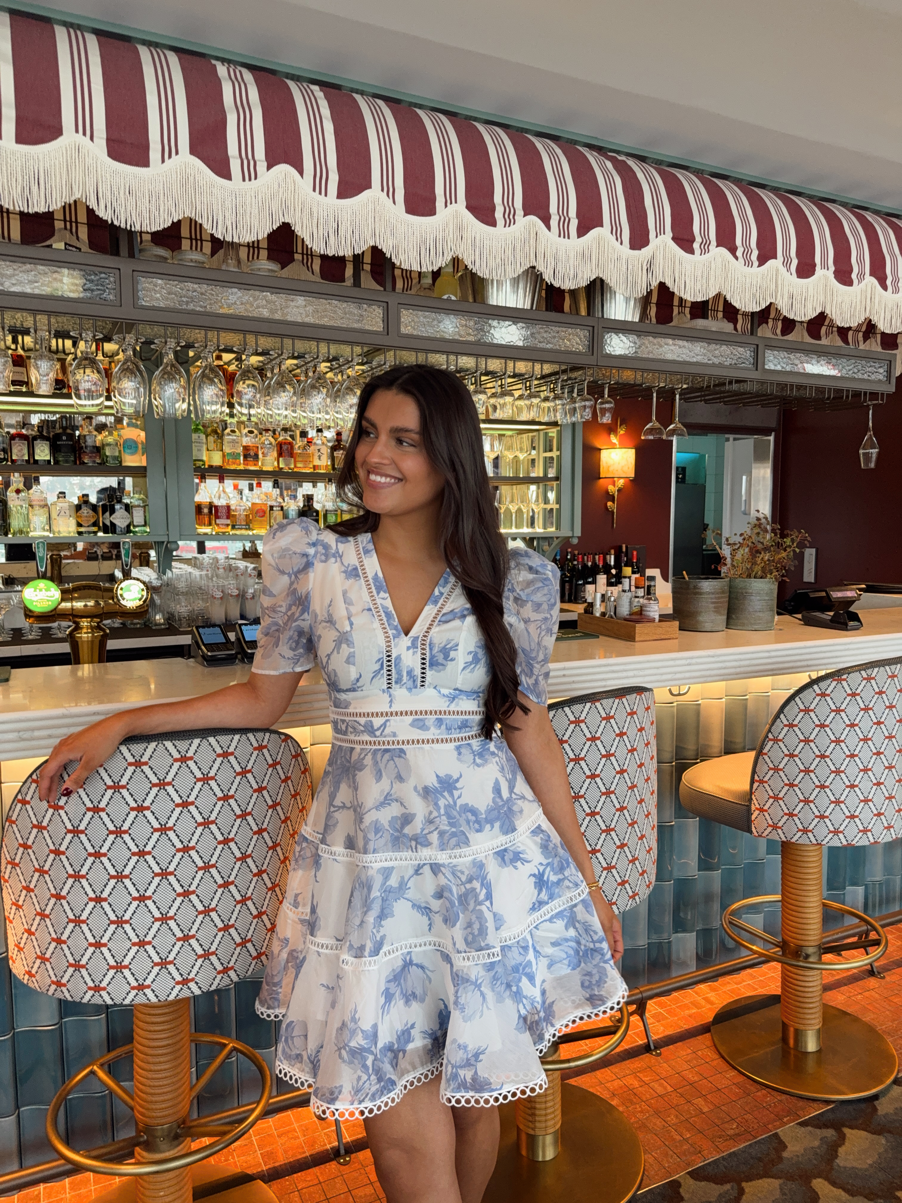 "Emie Mini Dress" fra Love Lolina. En sjarmerende minikjole med en skarp hvit base og et mykt blått blomstertrykk. Designet med en flatterende V-hals, puffermer og delikate blondedetaljer som fremhever midjen og lagene. Det flagrende skjørtet gir leken bevegelse – perfekt for sommerdager, hagefester og spesielle anledninger.