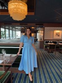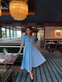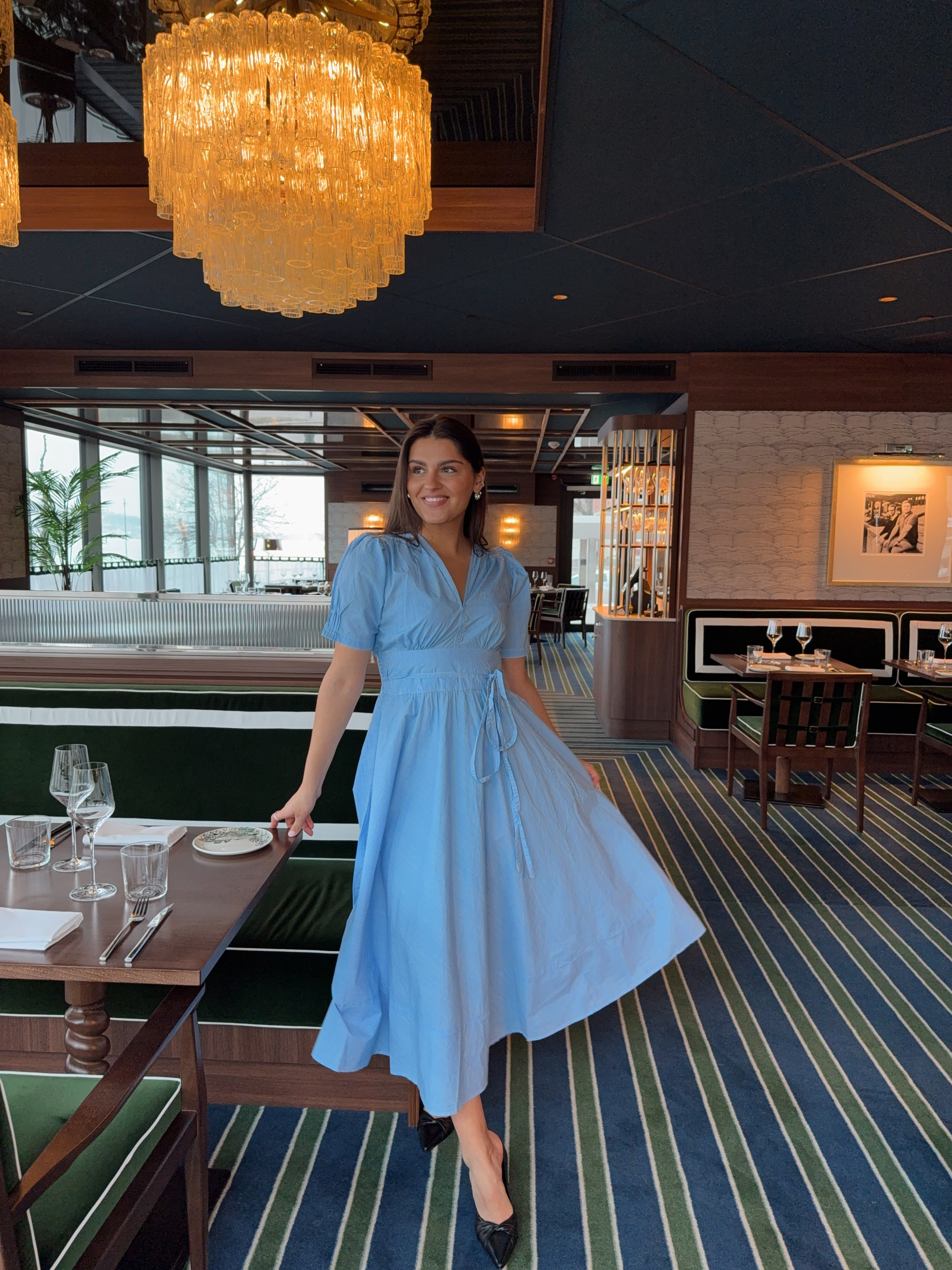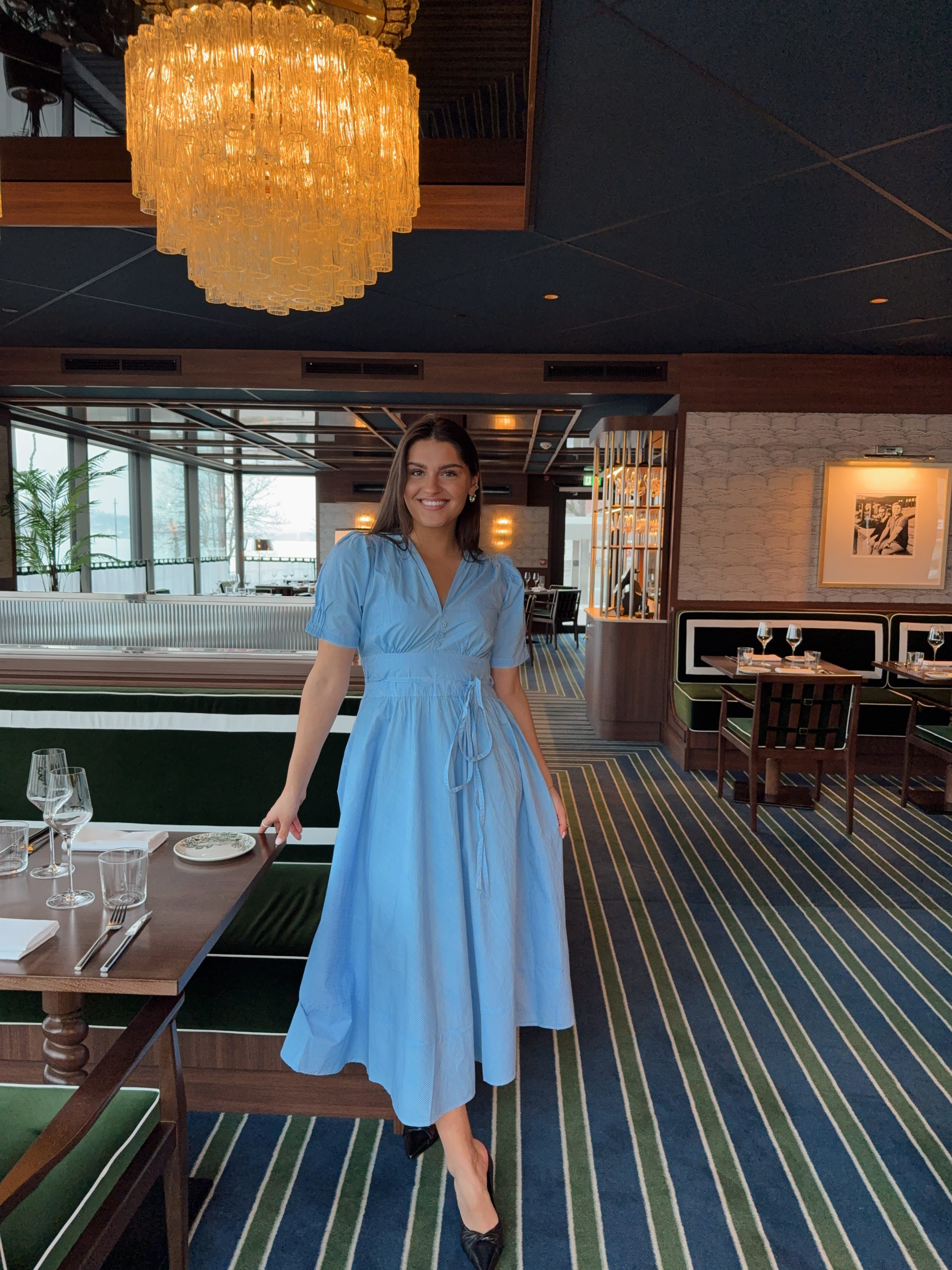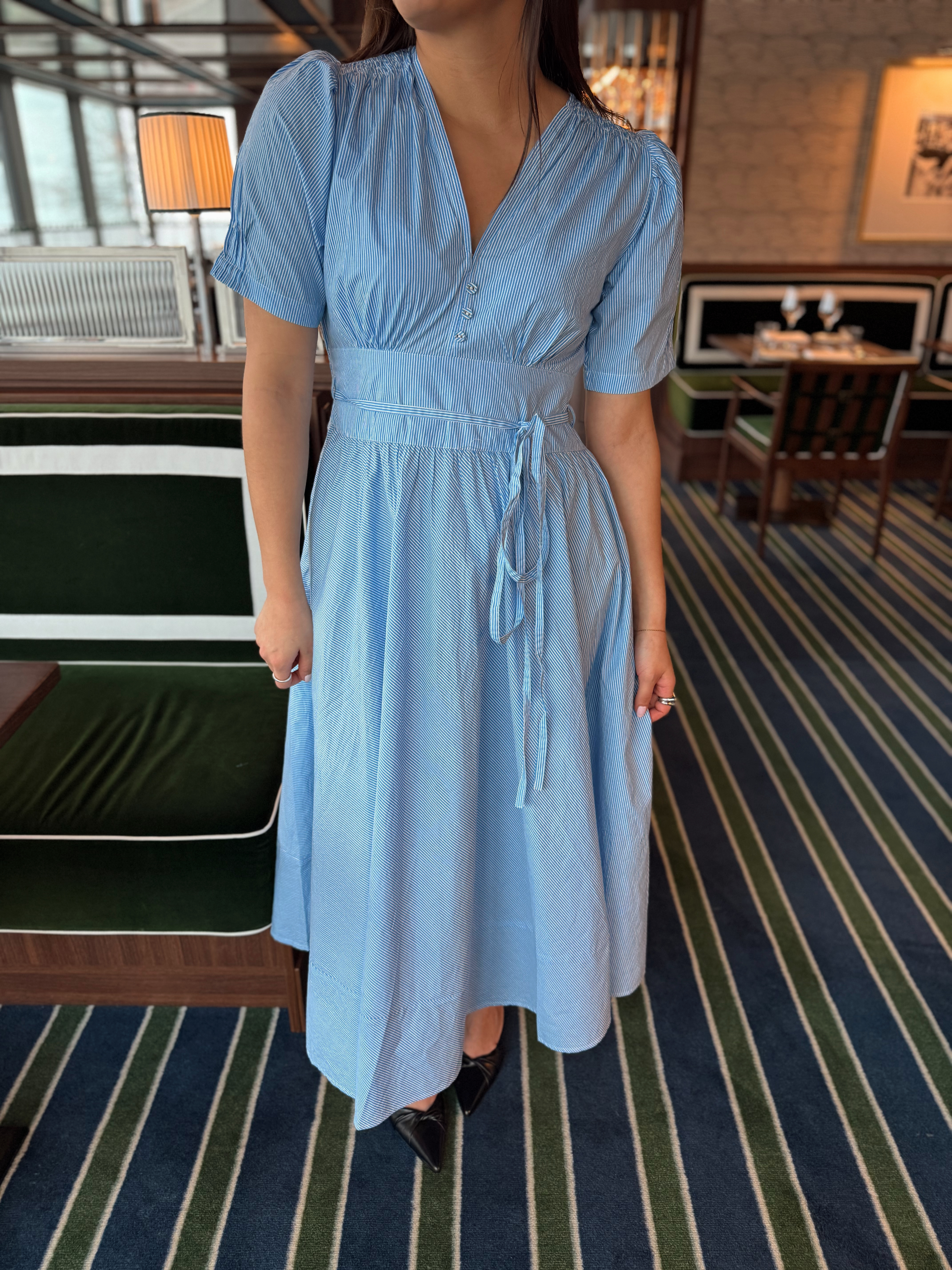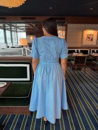 "Maria Dress" fra MissMaya er en sjarmerende nye kjole som gir garderoben din en følelse av uanstrengt eleganse. Kjolen er laget i sprø bomullspoplin og har delikate, korte puffermer samt en flatterende V-hals med påsydde knapper som gir et sofistikert uttrykk. Skjørtet har den populære silhuetten fra MissMaya sin Astrid-design, med høy fald, strikk bak for ekstra komfort og et avtagbart belte slik at du kan variere stilen. Perfekt for deg som elsker tidløs stil med en leken vri.