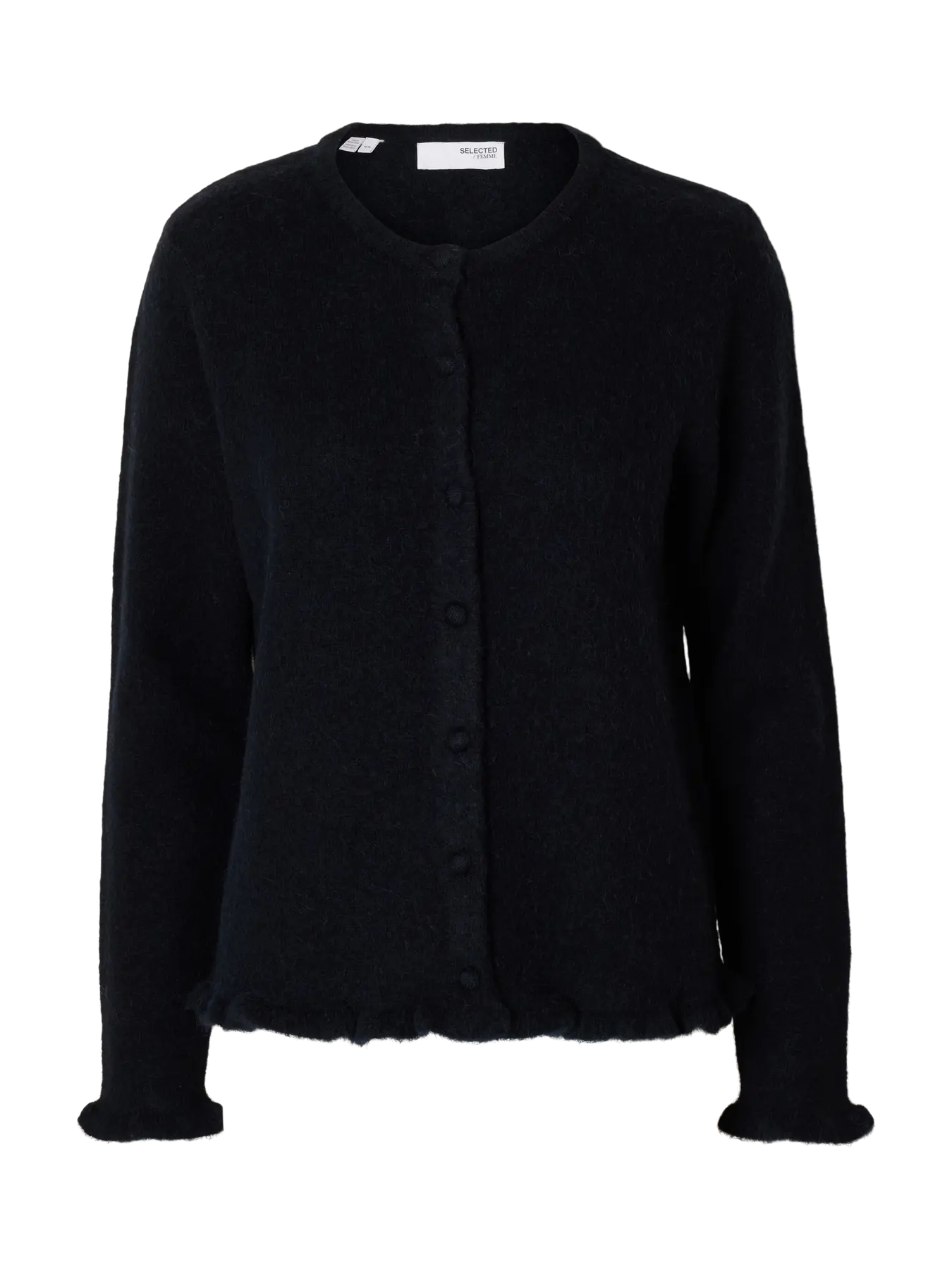 "Lulu Frill Knit Cardigan" fra Selected Femme. En feminin cardigan i myk, børstet kvalitet med delikate volanger langs kantene. Designet har rund hals, ton-i-ton knapper og rett passform som faller flatterende på kroppen. Lulu Frill Ls Knit Cardigan gir et romantisk uttrykk og passer perfekt over en enkel topp eller kjole.