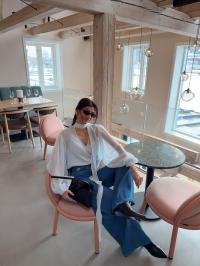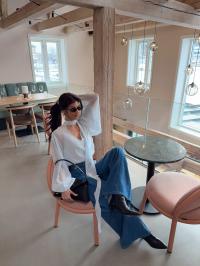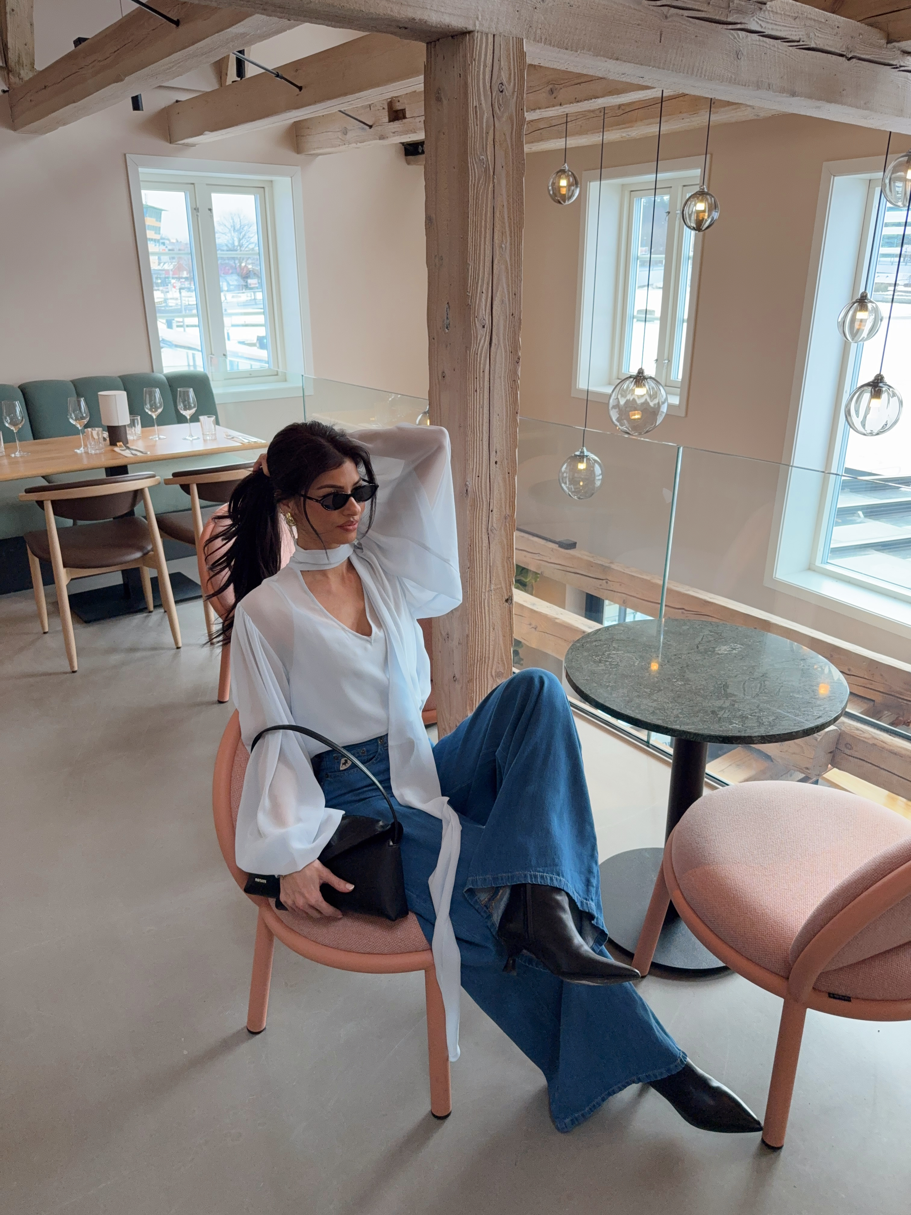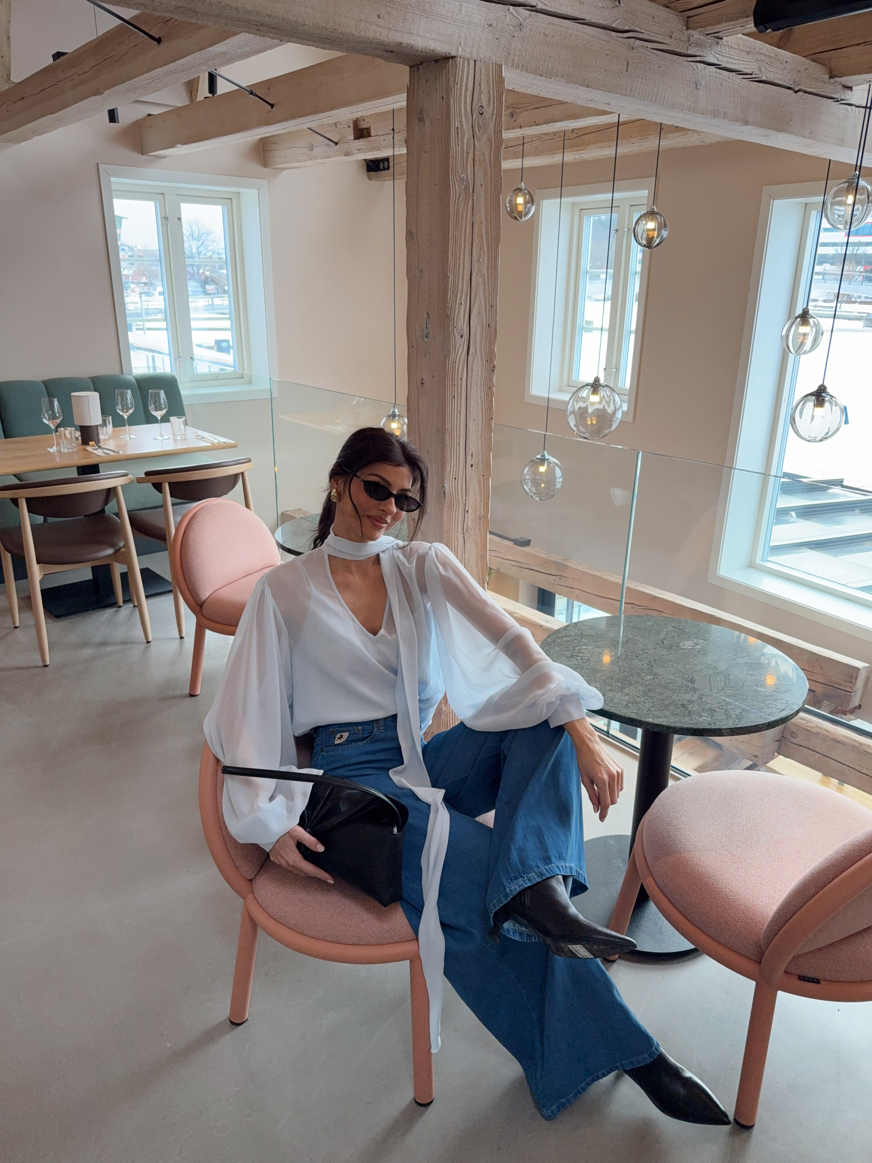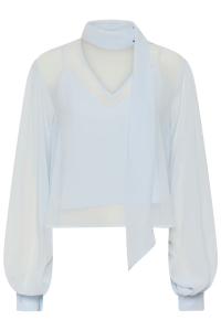 "Zurina Blouse" fra Gestuz. Transparent bluse med ledig passform, dyp V-utringning, lange volumiøse ermer med mansjetter og elegant halsdetalj. Komfortabel for hverdags- og selskapsbruk.