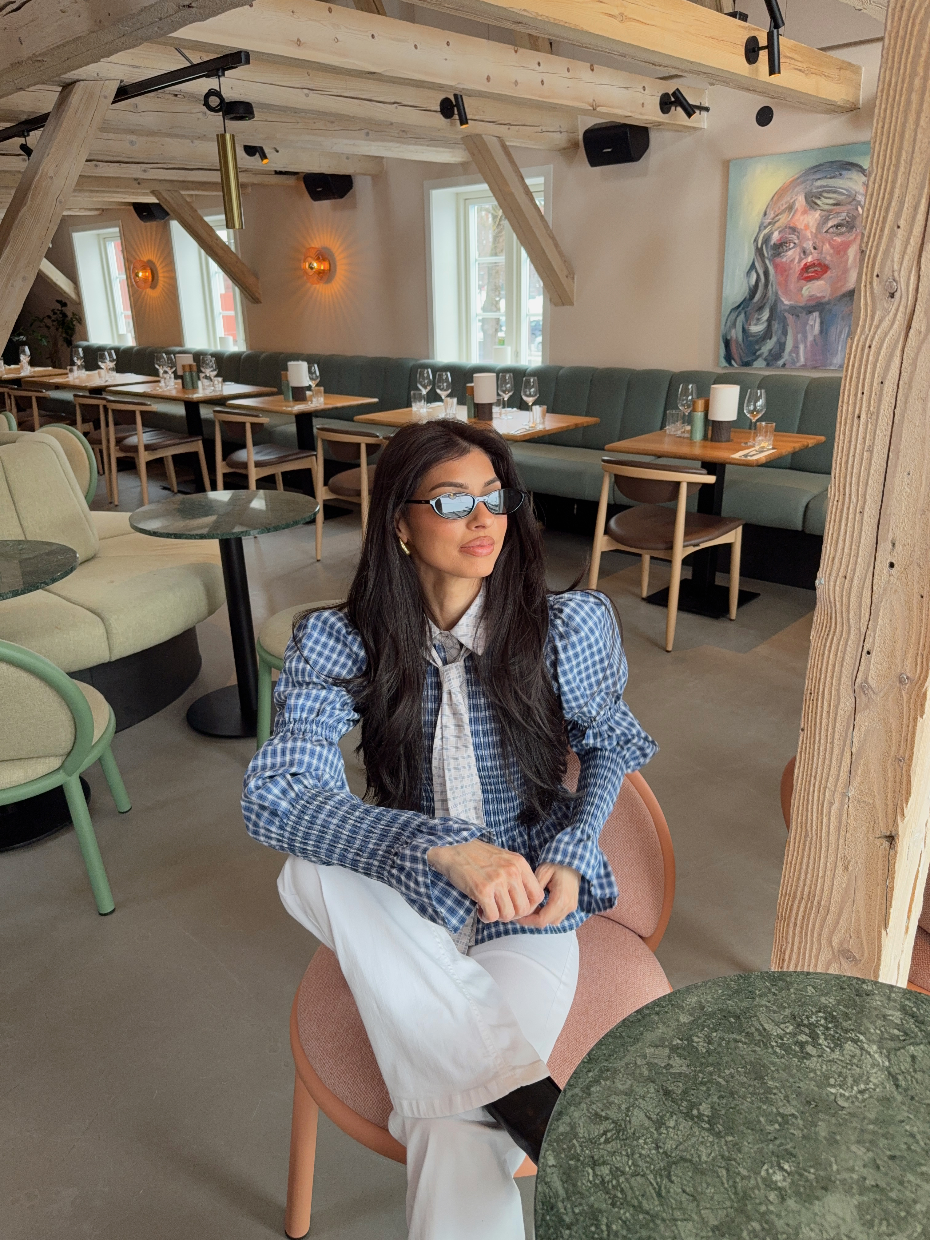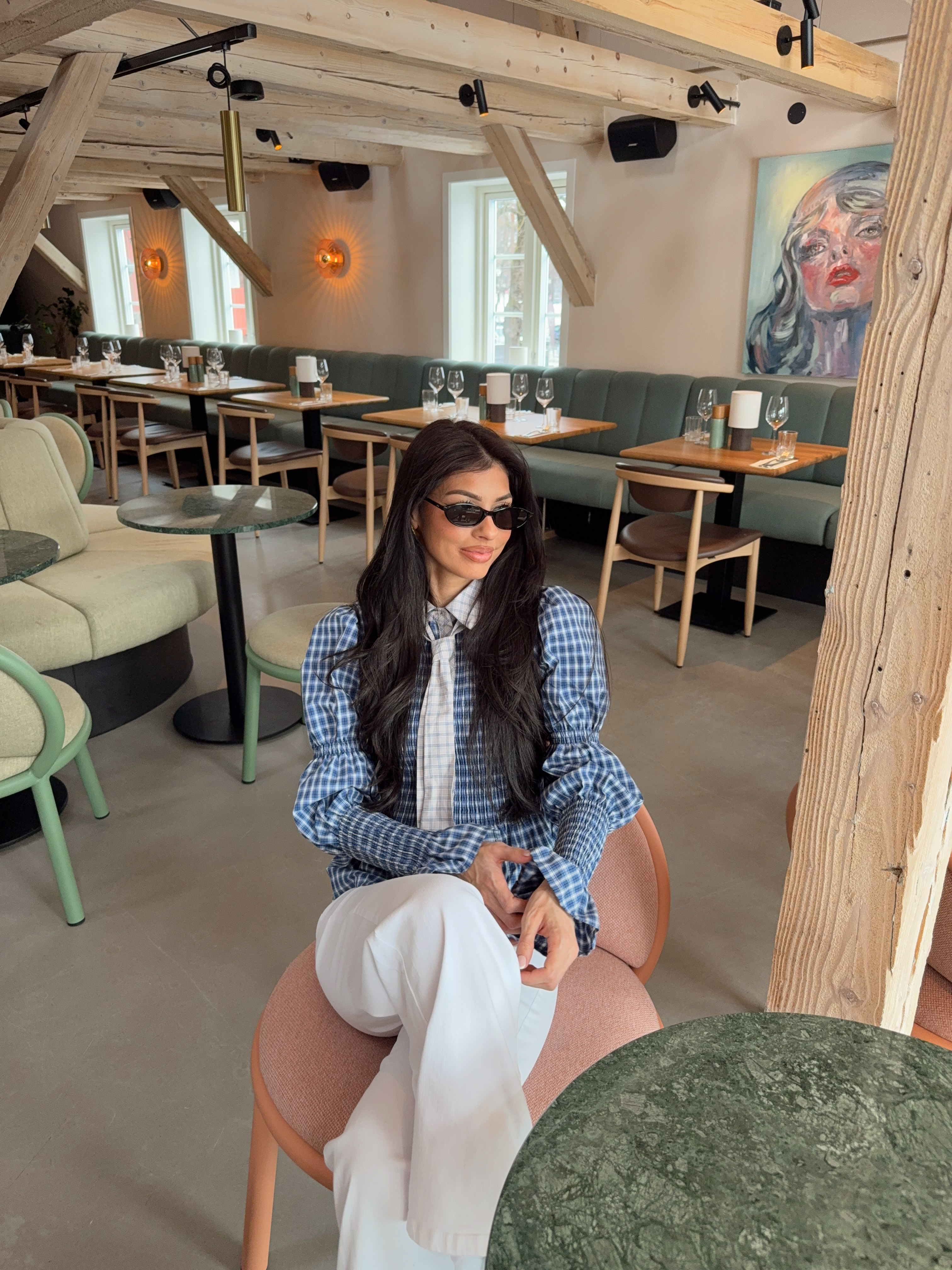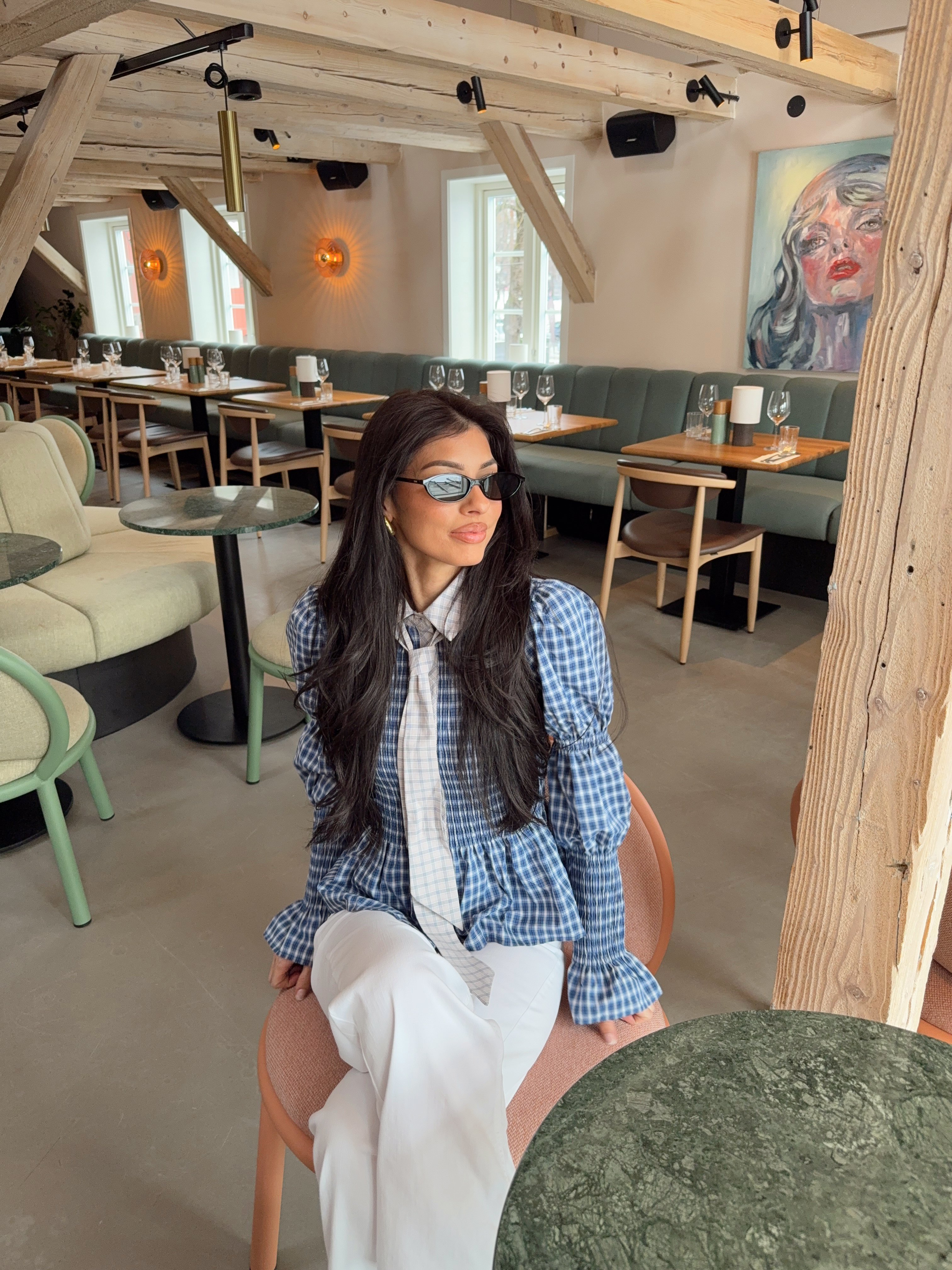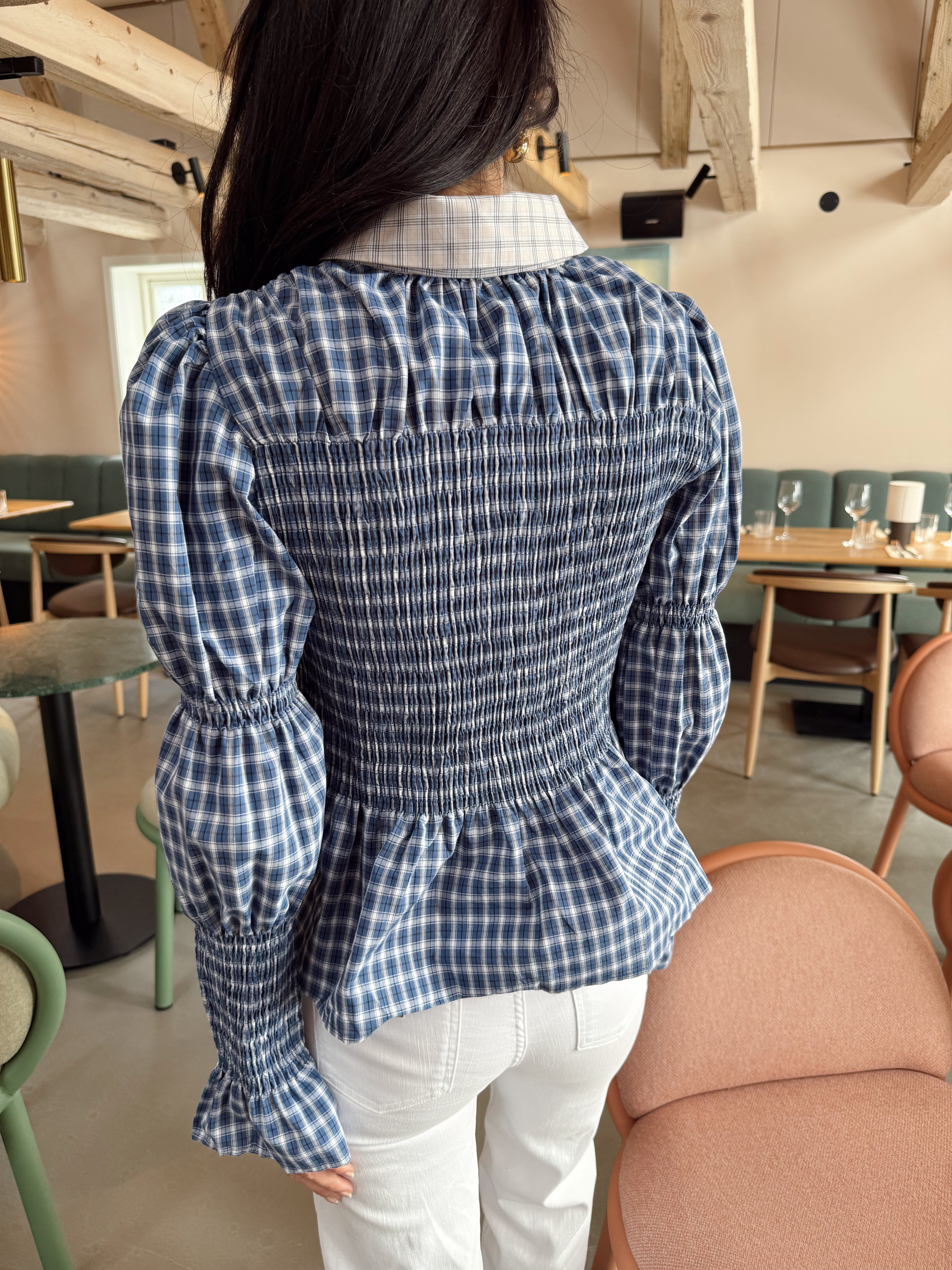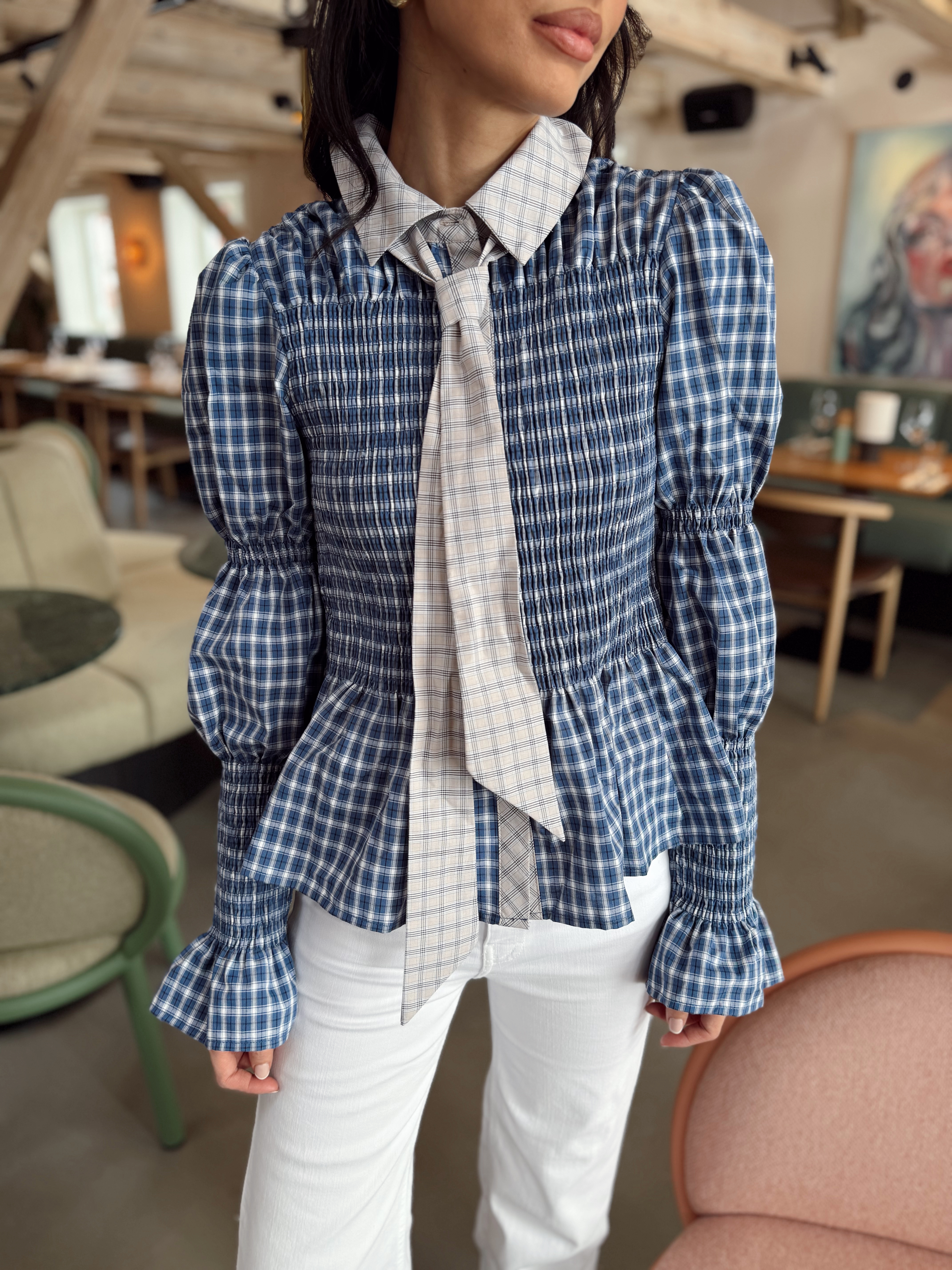 «Bekka Smock Shirt» fra Yas. Kul skjorte med smock detaljer, skjorte krage og lange ballong ermer med stramme mansjetter. Avtagbart slips/sløyfe i halsen!