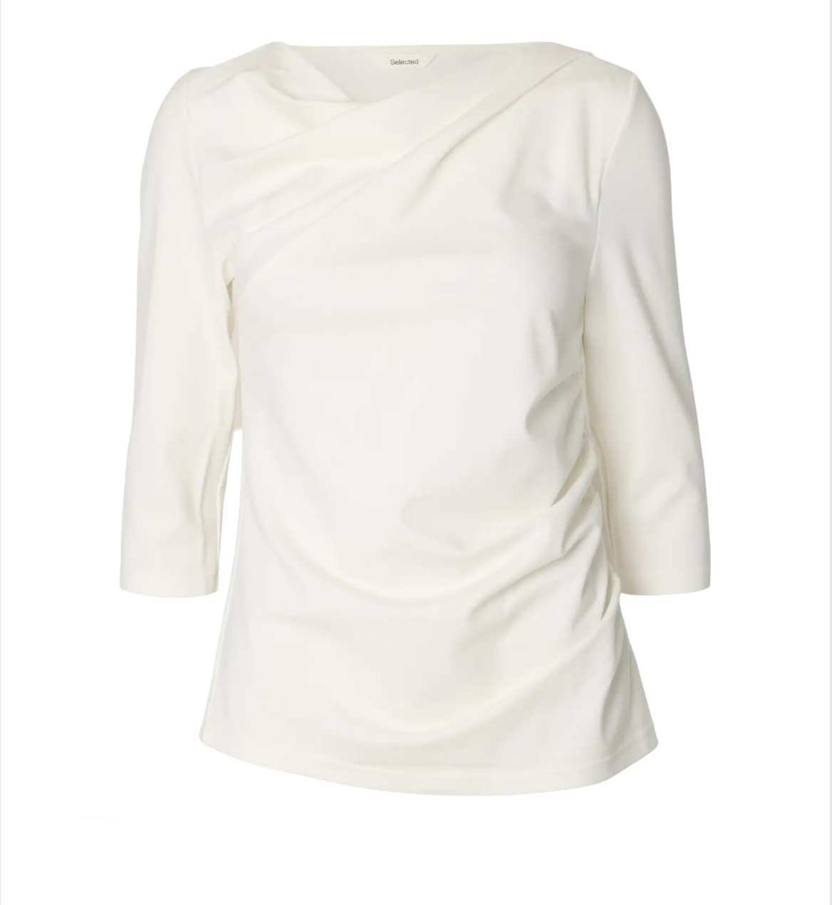 «Ira - Carolina 3/4 top» fra Selected Femme er en nydelig hvit topp med rund hals og halvlange ermer.