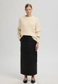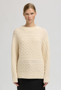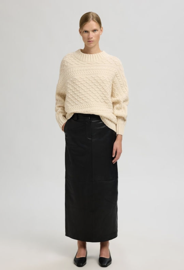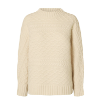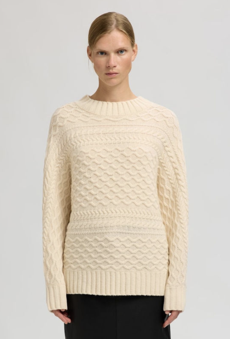 «Nelly cable batsleeve knit» fra Selected Femme er nydelig strikk med rundt hals og lang erm. Designet med avslappede ermer og et tidløst flettemønster.