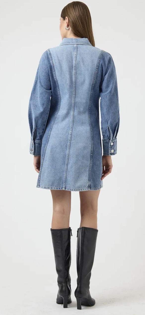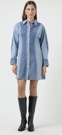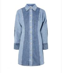 «Faro denim dress» fra Yas er en kul denim-kjole med krage, lang erm og lukkes med knapper.