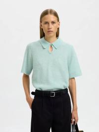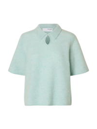 "Sia Ras 2/4 Knit Key Hole Collar Neck" fra Selected Femme. En feminin strikket topp i myk ullblanding med kort erm og nøkkelhullsåpning ved halsen. Den klassiske kragen gir et sofistikert preg, mens den lyse minttonen tilfører et friskt uttrykk. Perfekt både alene og under blazer for en moderne, elegant look.