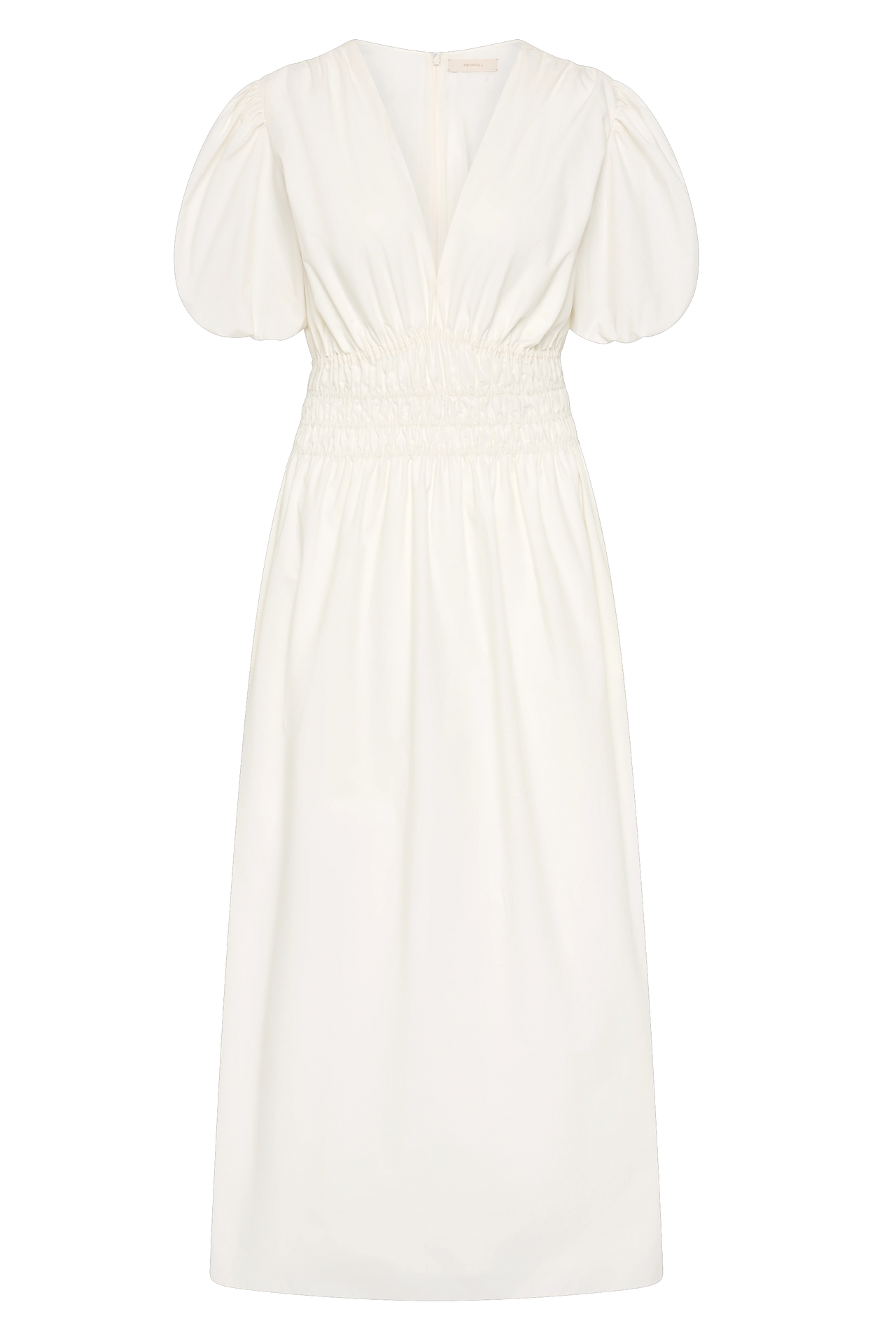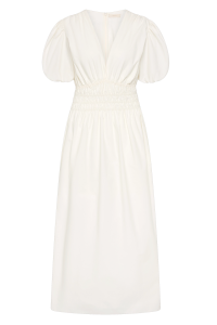"Grace midi dress" fra Faithfull the brand er en nydelig hvit midi-kjole I deilig lett bomull. Kjolen har dyp v-hals og korte ermer. Strikk i midjen.