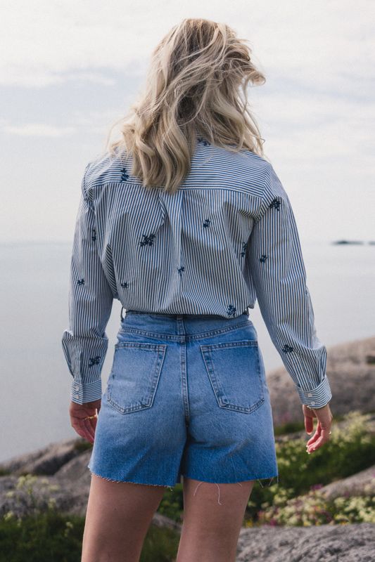 "Ida Maja" fra RAUS er den perfekte vår- og sommerblusen, og et must-have i garderoben! Skjorten har et klassisk og feminint uttrykk med smale blå striper og brodert blomstermønster. Den har lange ermer med mansjetter, knappelukking hele veien ned i front og en rett passform som gir et tidløst uttrykk. Laget i en lett og myk kvalitet som føles behagelig mot huden - perfekt både til hverdags og mer pyntede anledninger.