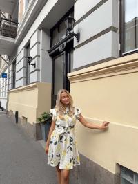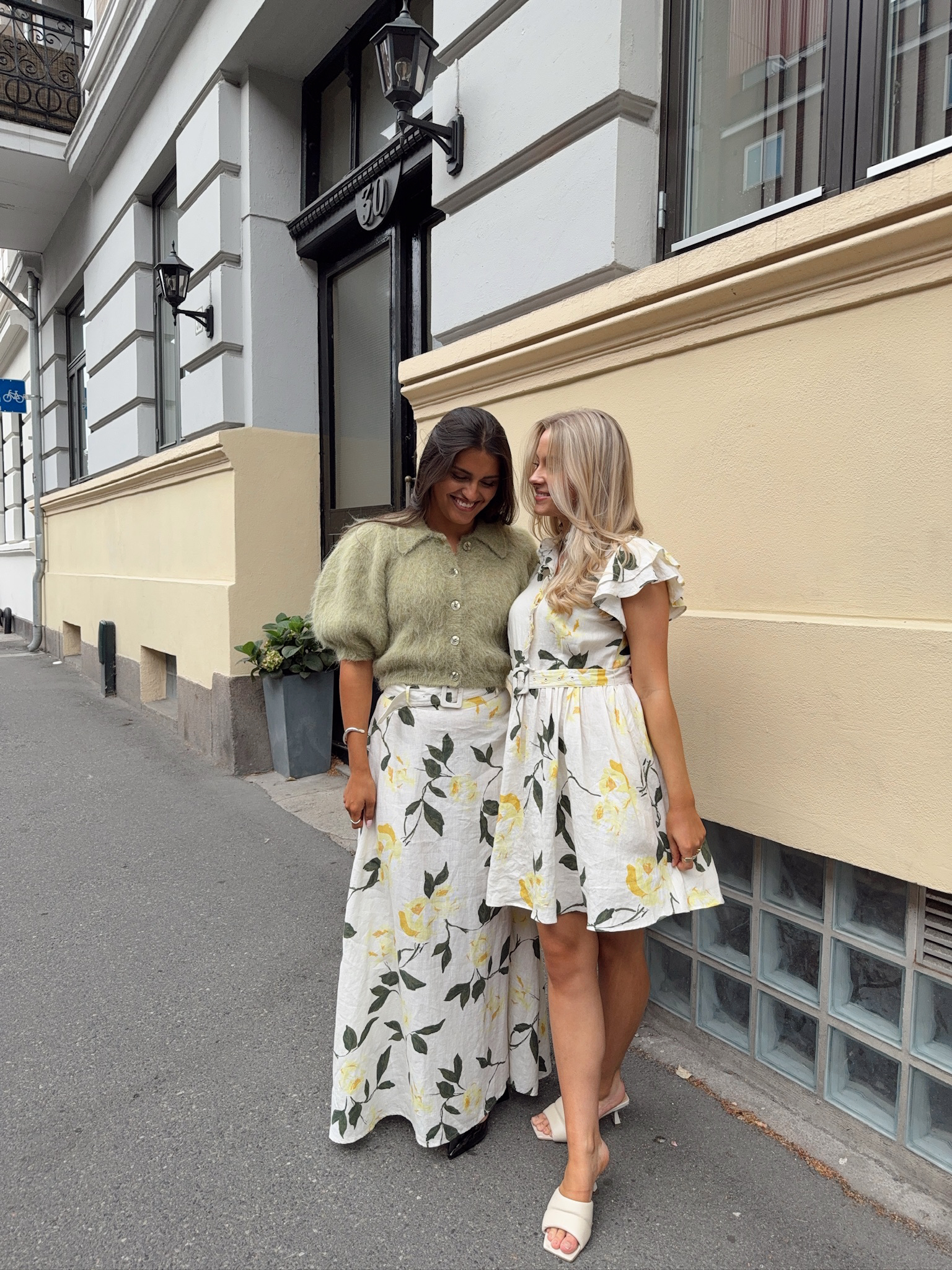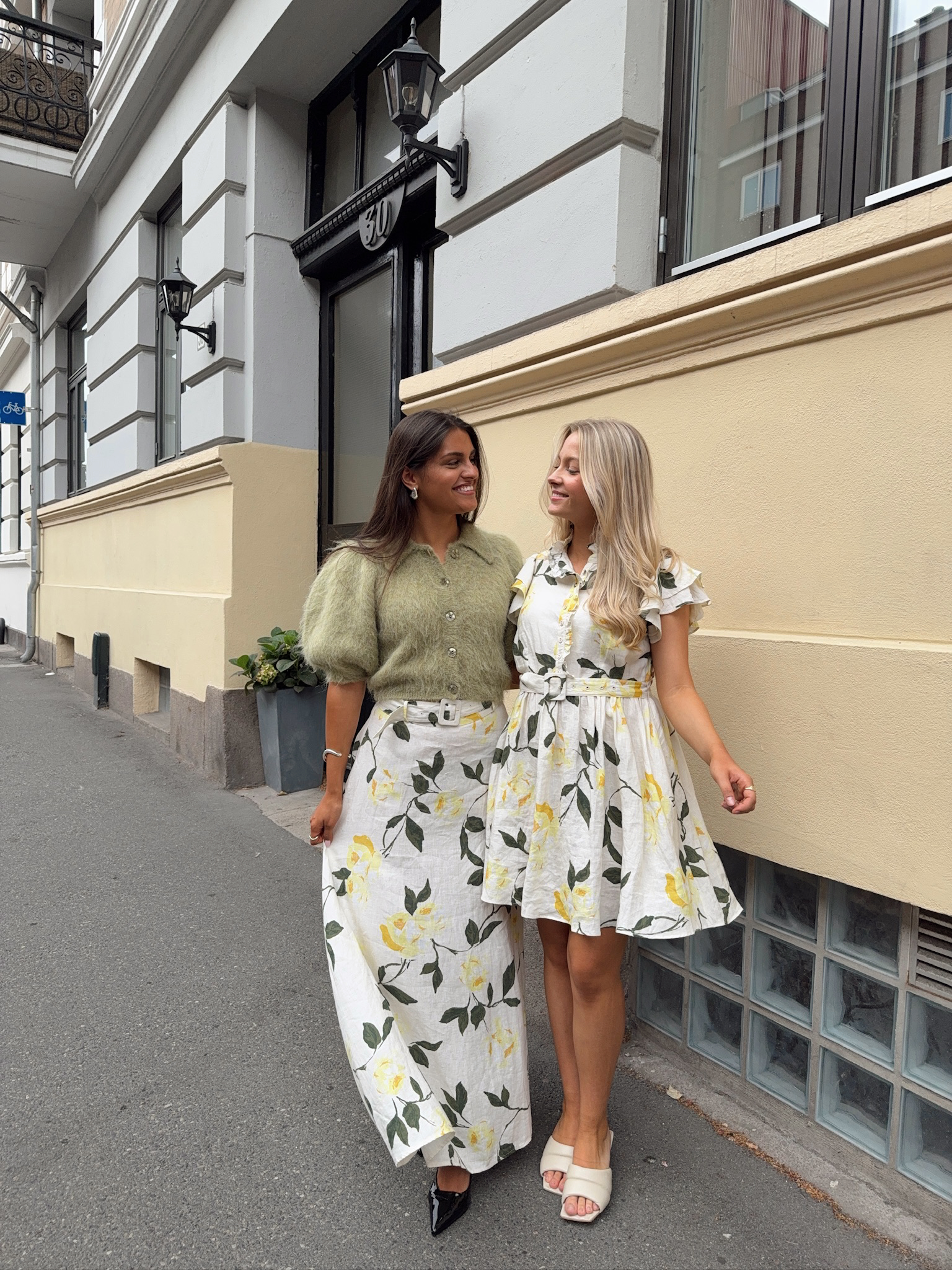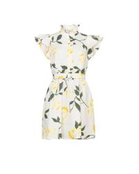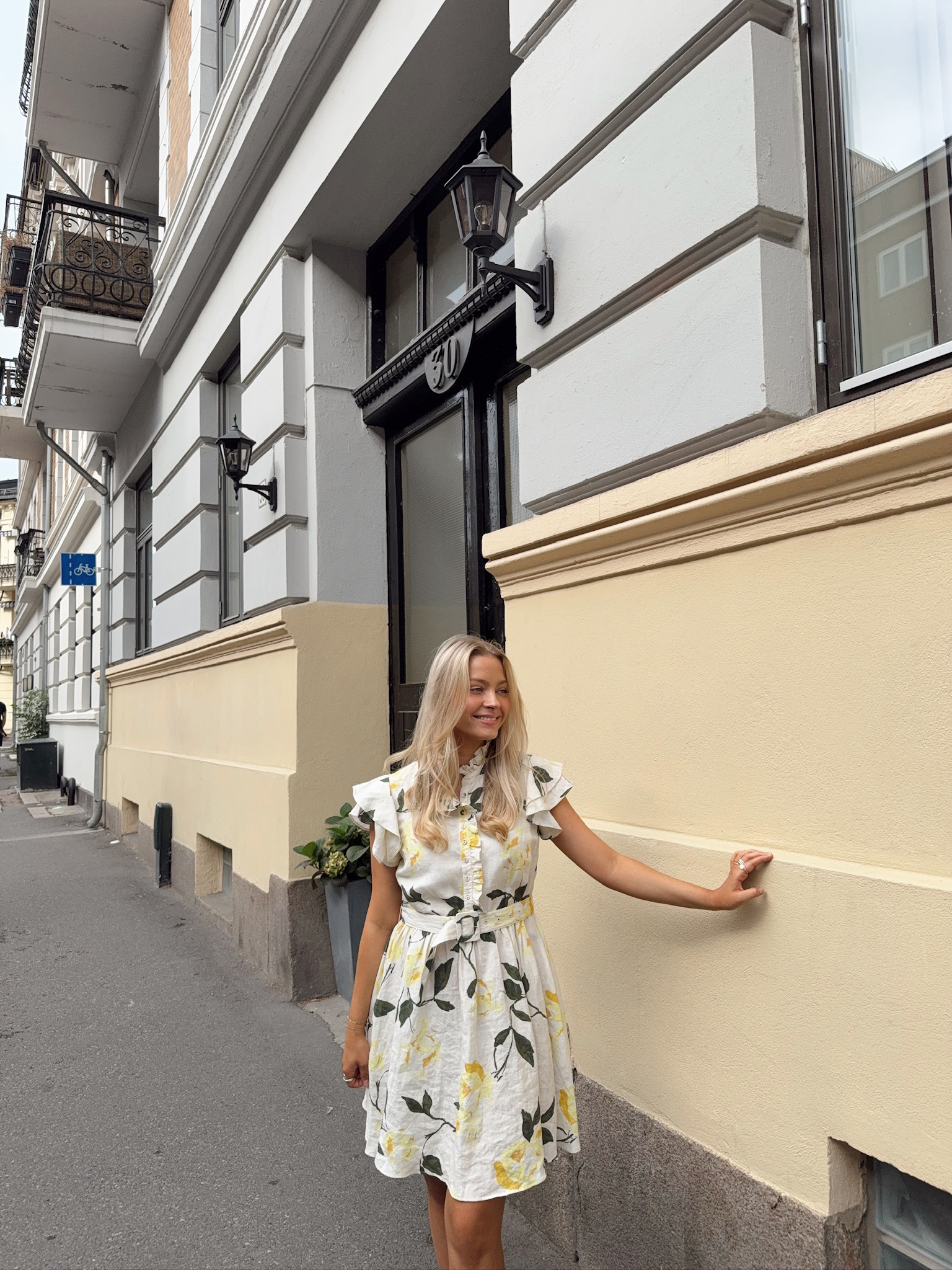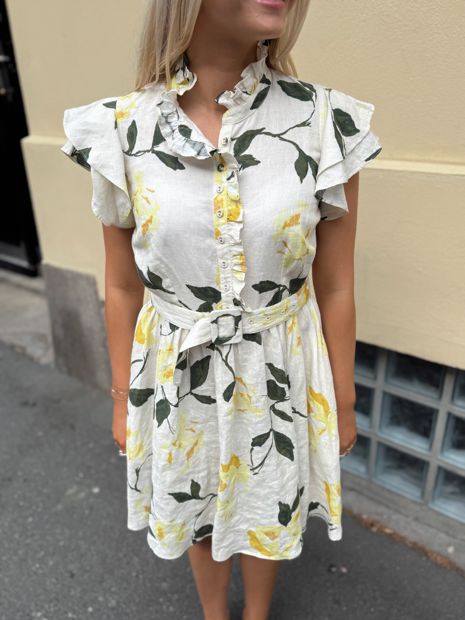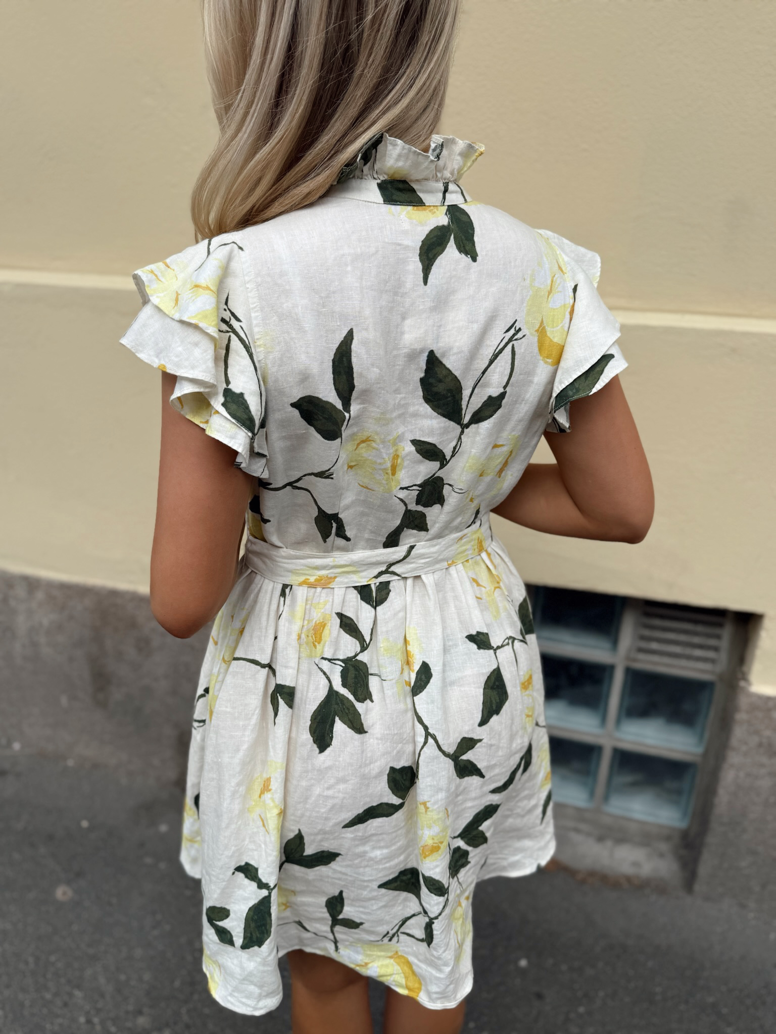 "Linen Ruffle Dress" fra byTiMo. Linkjolen med volanger er laget av byTiMos fine kvalitet, OEKO-TEX-sertifiserte lin. Kjolen har en minilengde, tettsittende midje, mandarinkrage med volangdetaljer, knapper nedover brystet og skuldrene laget av volanger. Den leveres med et matchende belte og har glidelåslukking på siden.