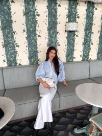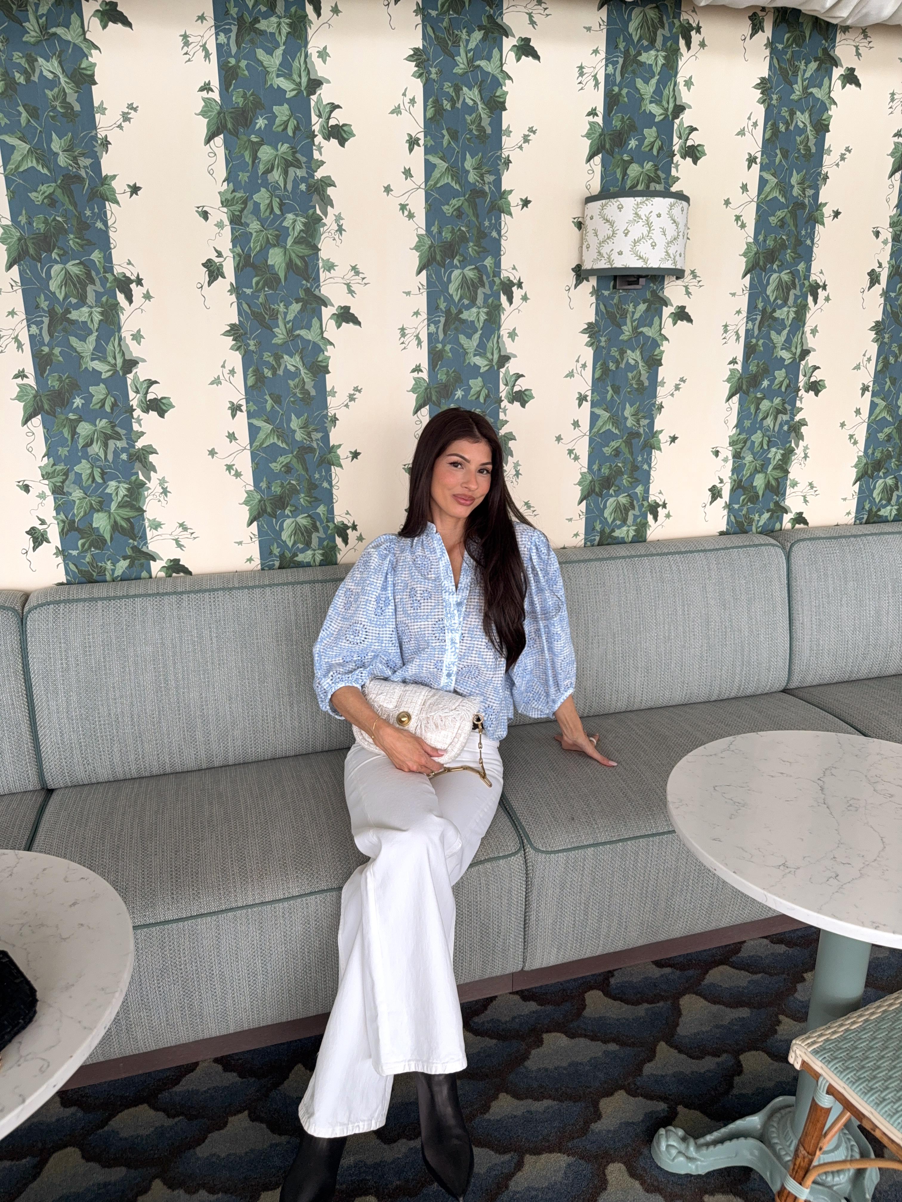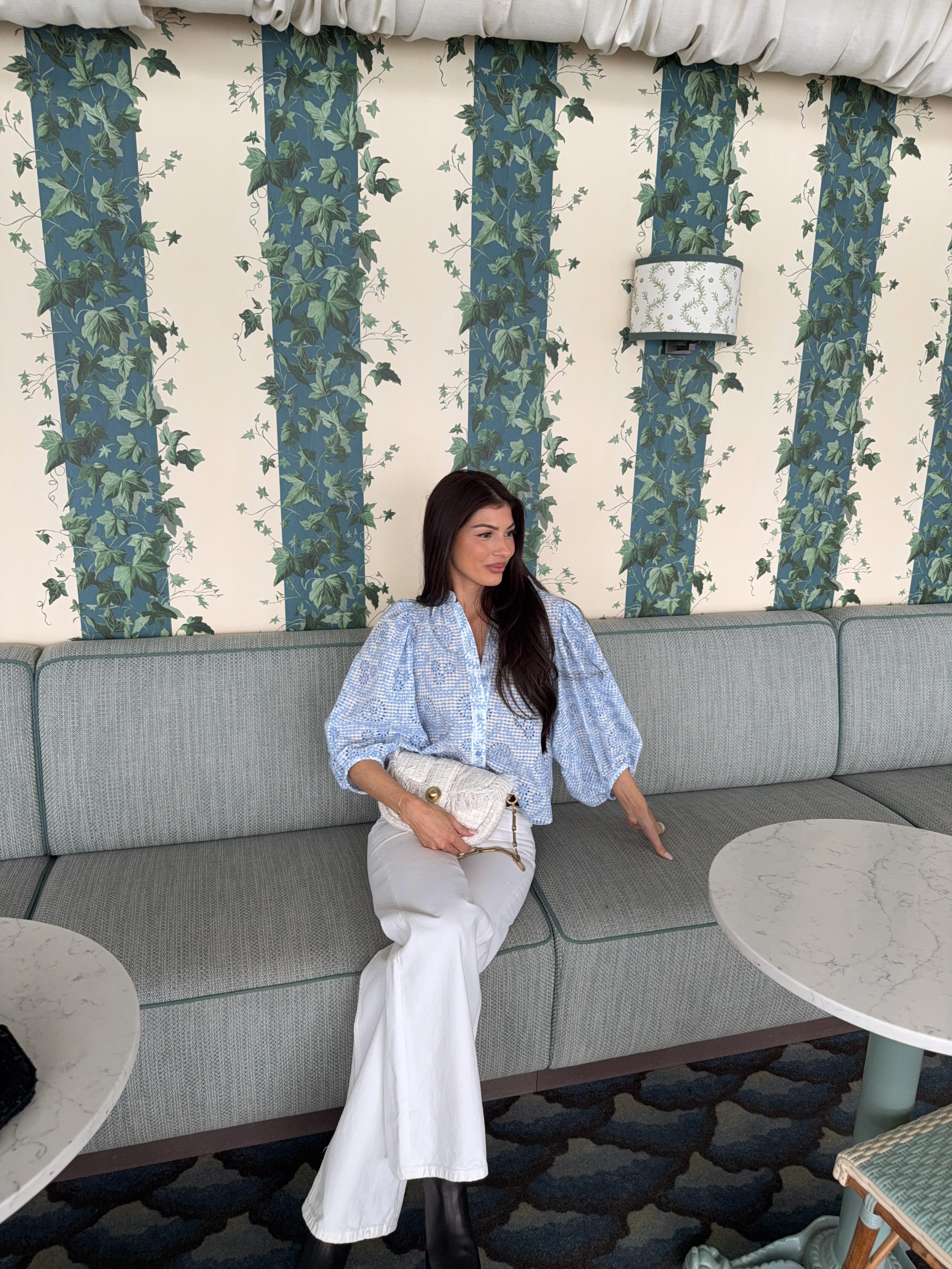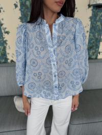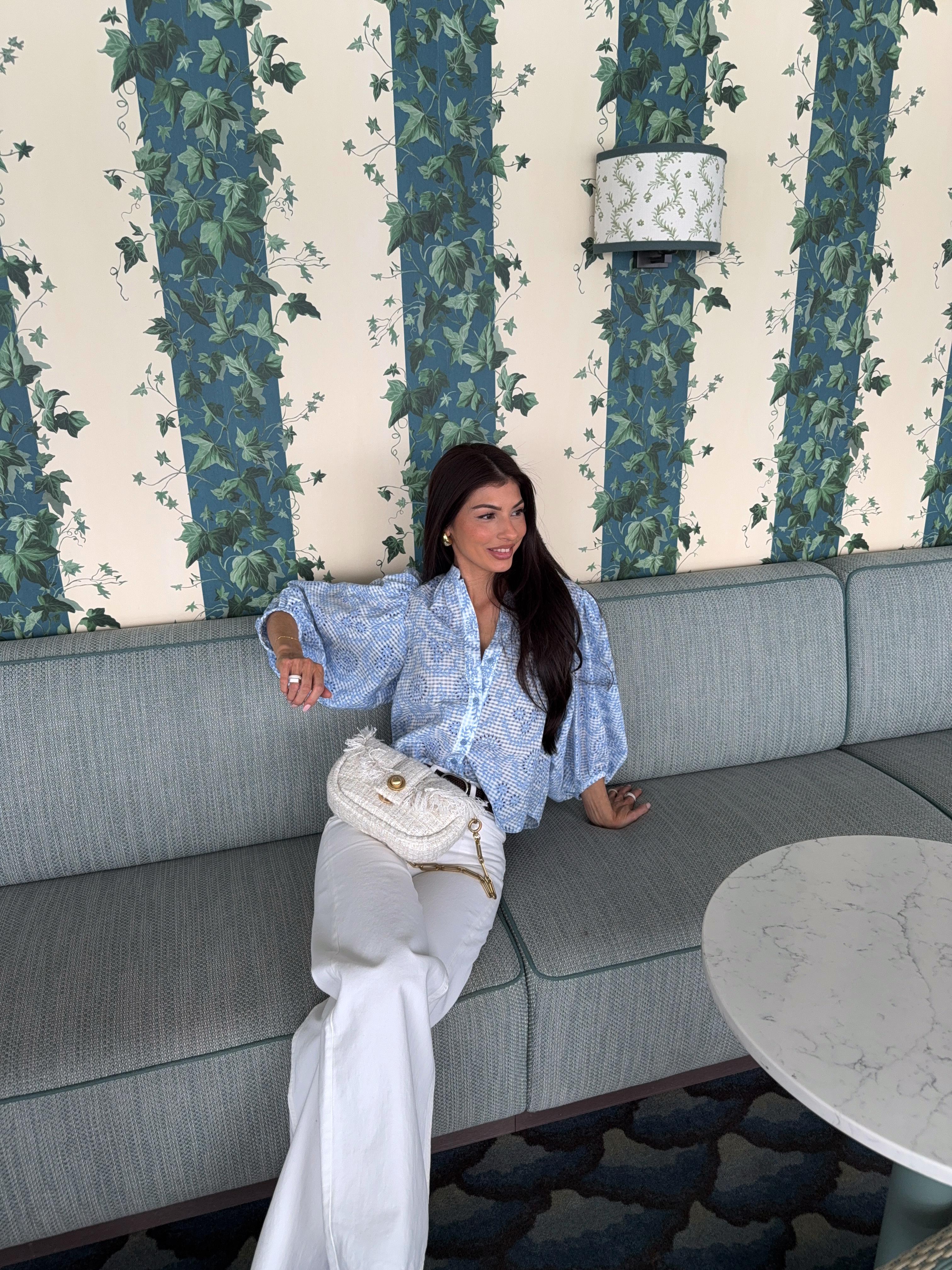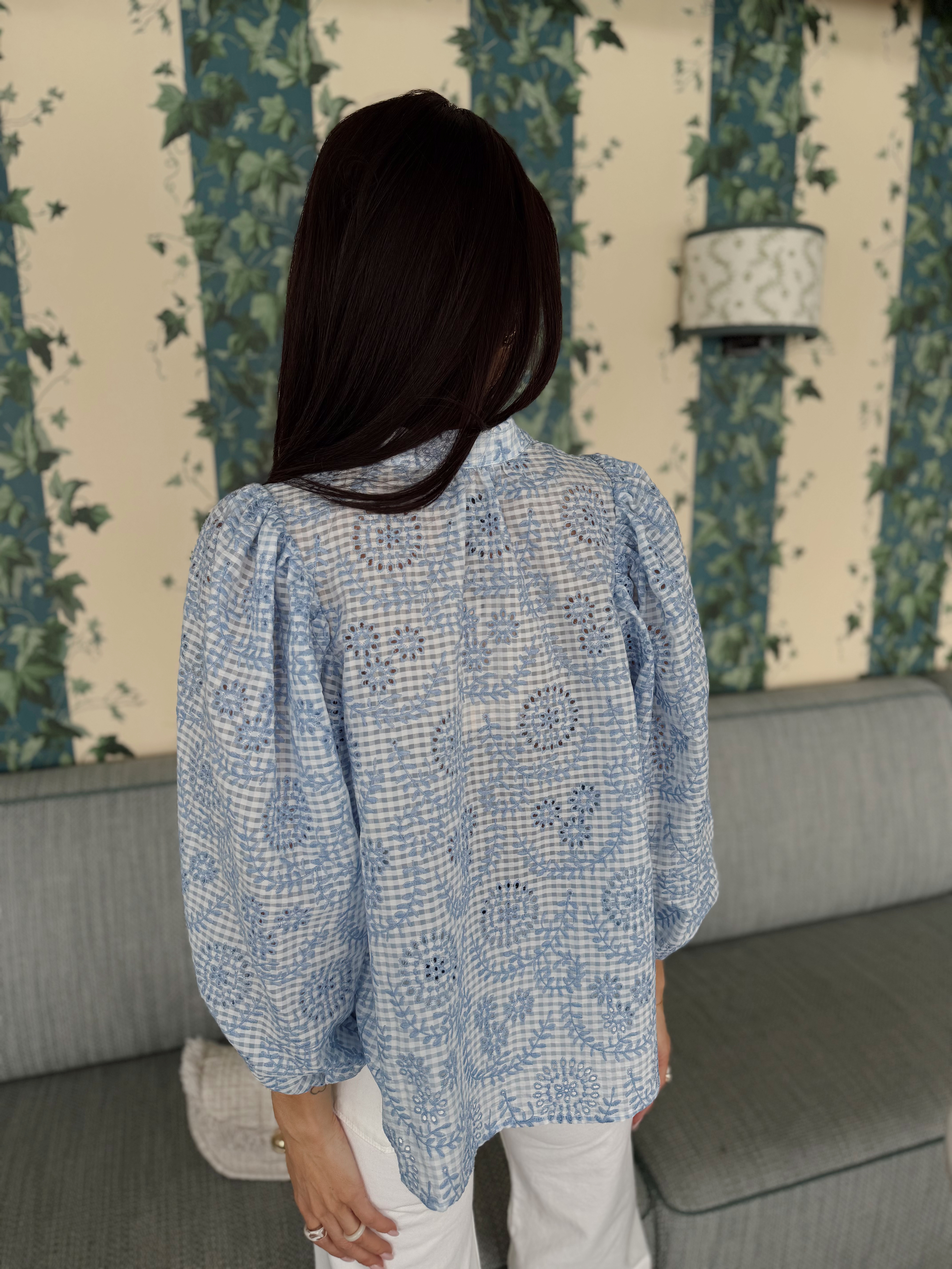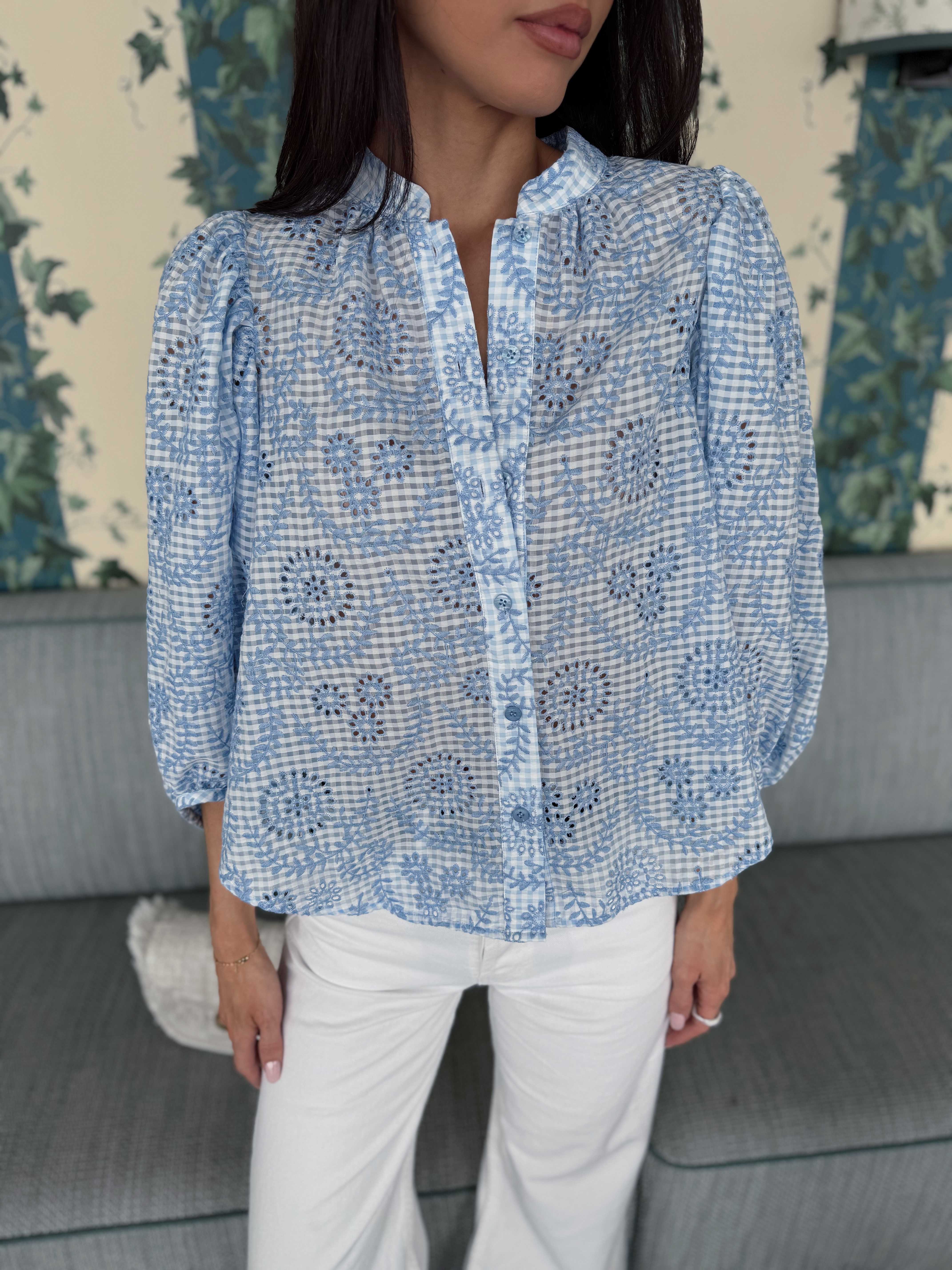 "Checks Blouse " fra byTiMo. Checks-blusen er laget i byTiMos myke og lette GRS-sertifiserte stoff, med fine broderidetaljer. Blusen har en avslappet silhuett, mandarinkrage og voluminøse trekvartlange ermer. Den har knapper hele veien ned foran.