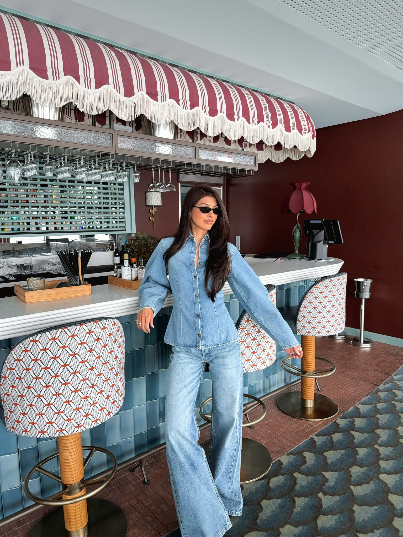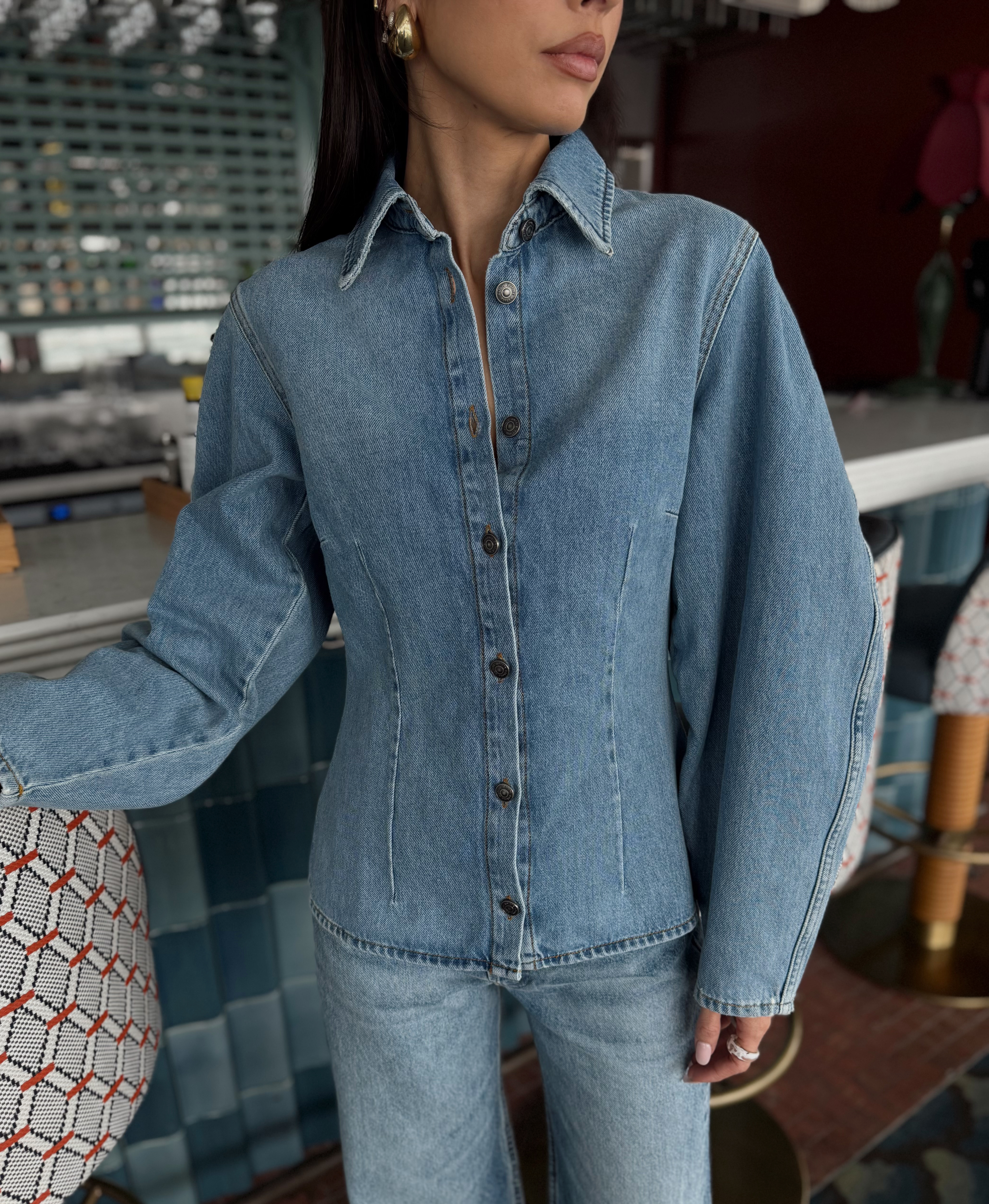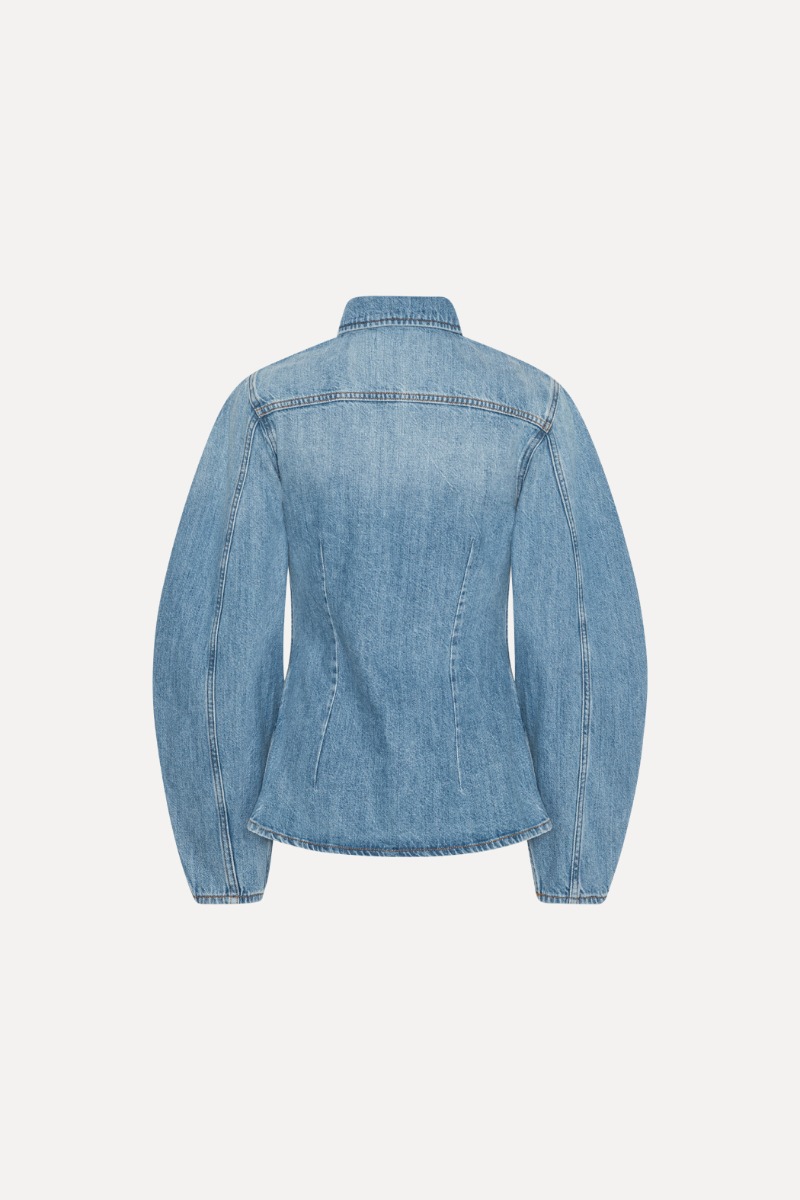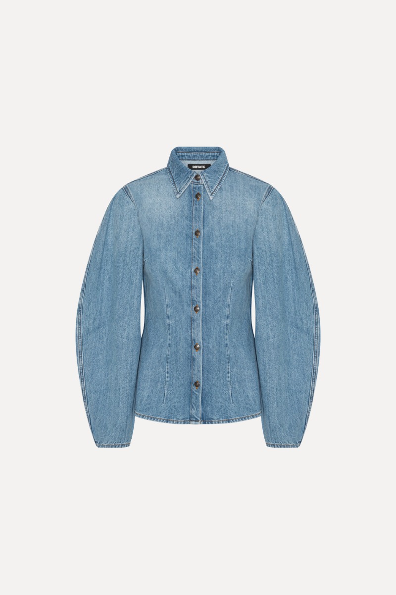 «Denim Fitted Shirt» fra Rotate. En figursydd denimskjorte med markert midje og strukturert passform som fremhever silhuetten. Den har klassisk spiss krage, lange ermer og metallknapper i front, mens formsydde sømmer foran og bak gir en flatterende, skreddersydd look. Den lyse vasken skaper et rent og tidløst uttrykk som passer til både hverdag og mer pyntede anledninger.