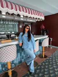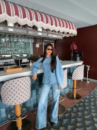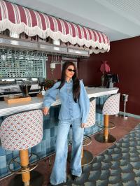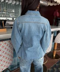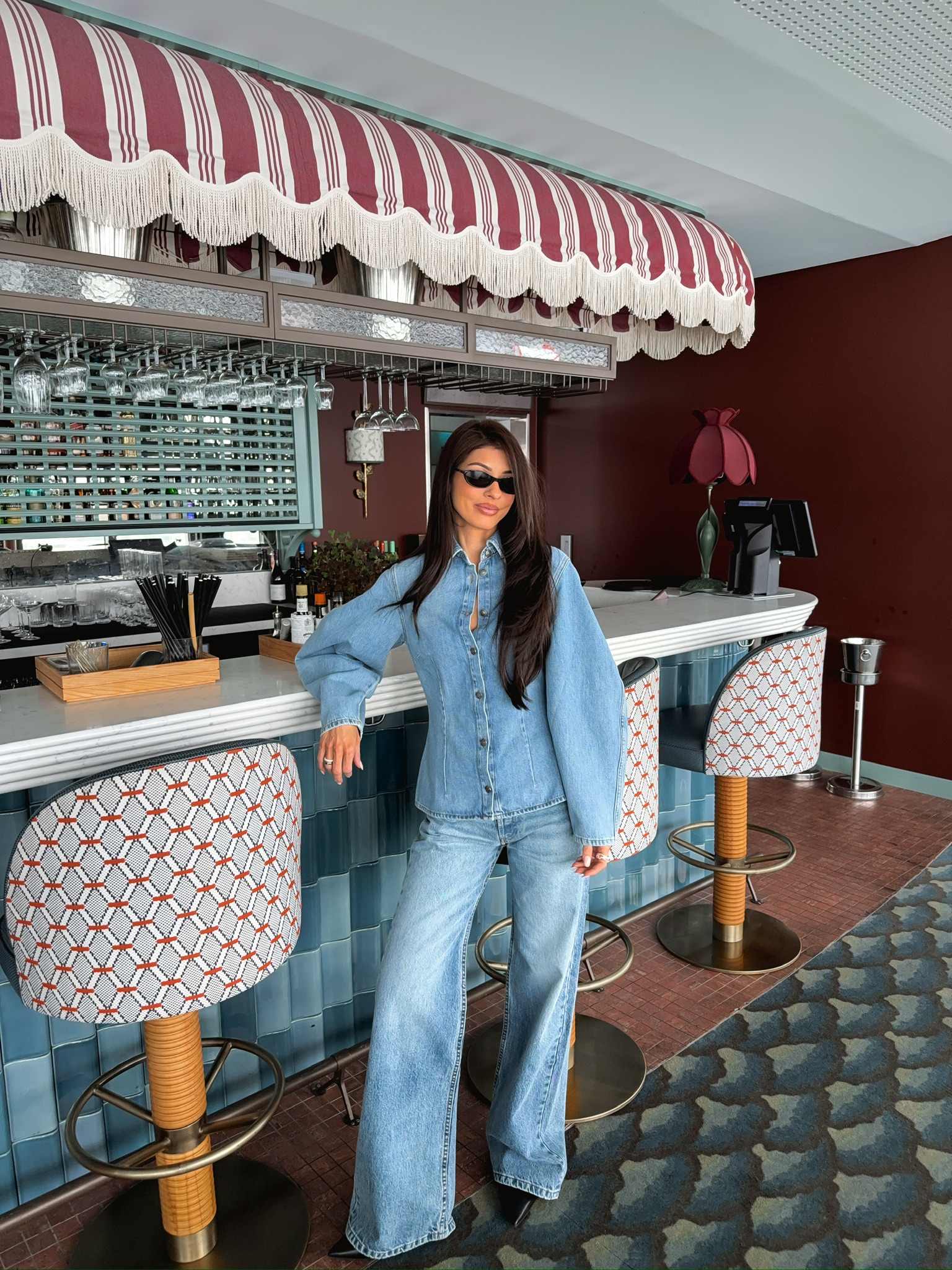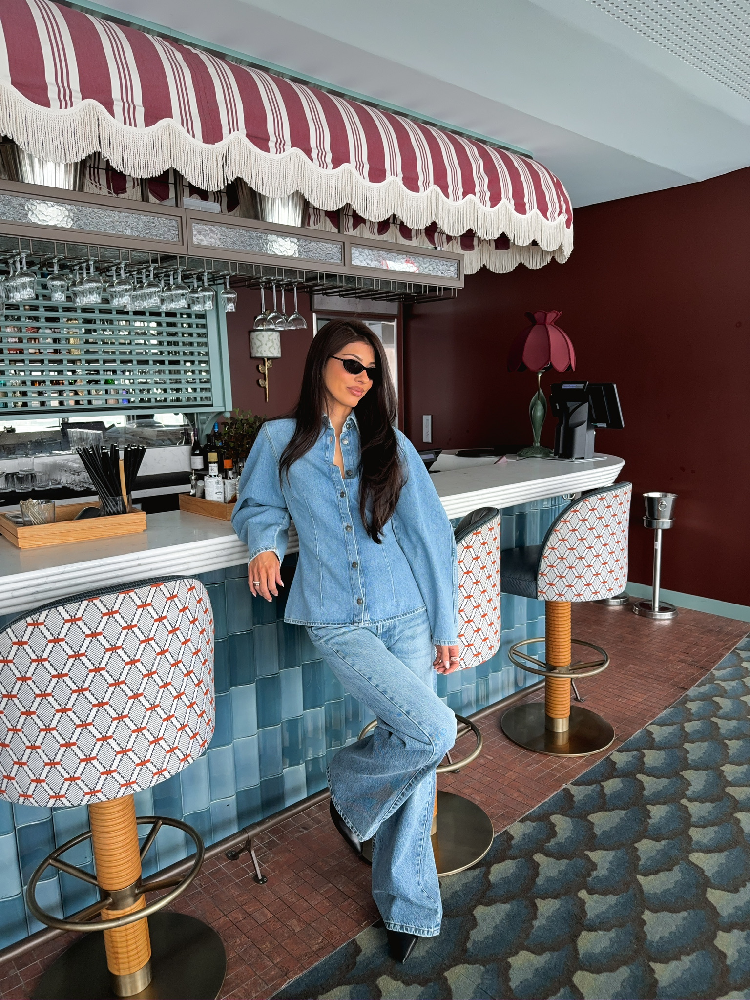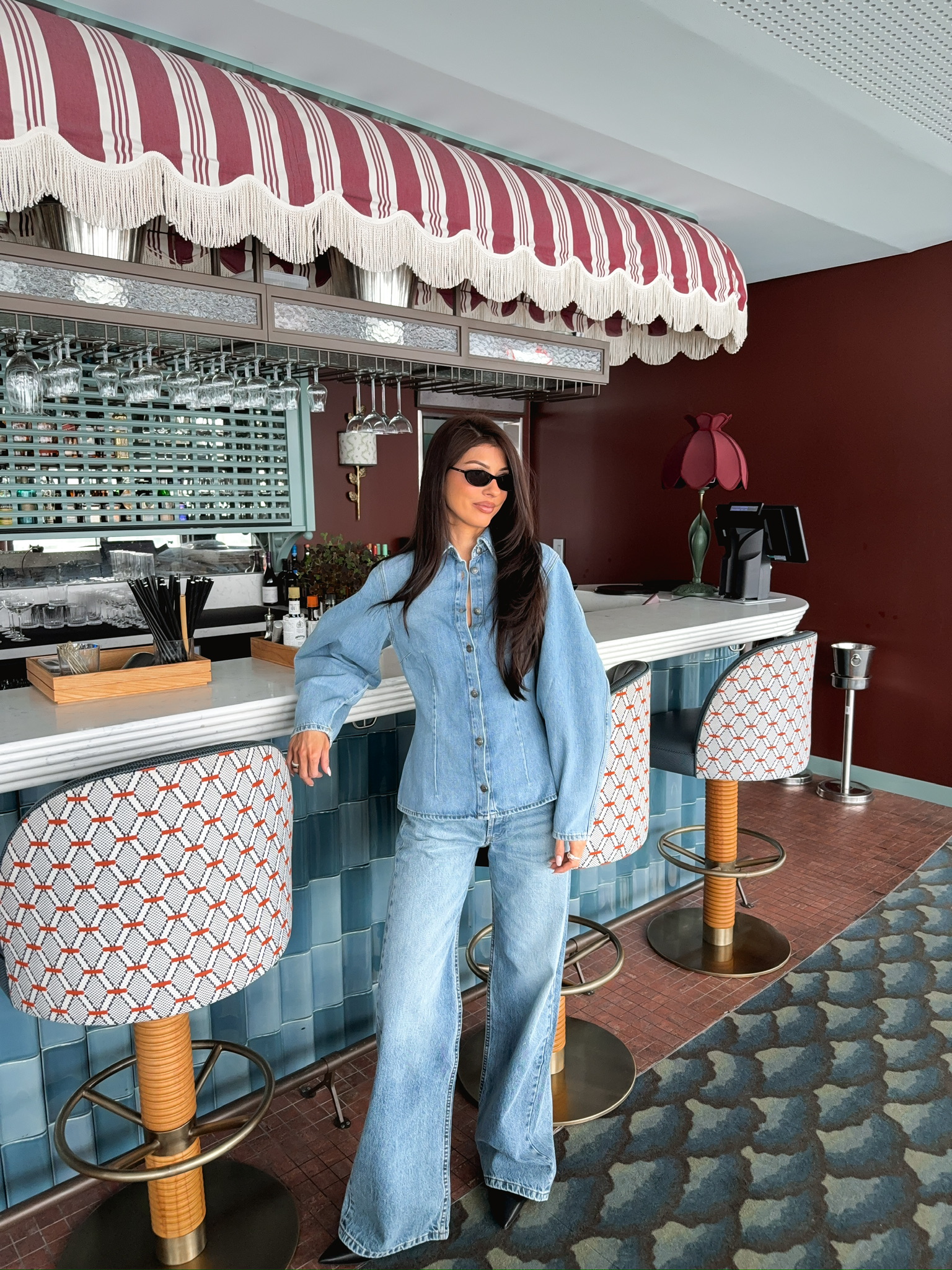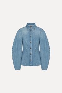 «Denim Fitted Shirt» fra Rotate. En figursydd denimskjorte med markert midje og strukturert passform som fremhever silhuetten. Den har klassisk spiss krage, lange ermer og metallknapper i front, mens formsydde sømmer foran og bak gir en flatterende, skreddersydd look. Den lyse vasken skaper et rent og tidløst uttrykk som passer til både hverdag og mer pyntede anledninger.