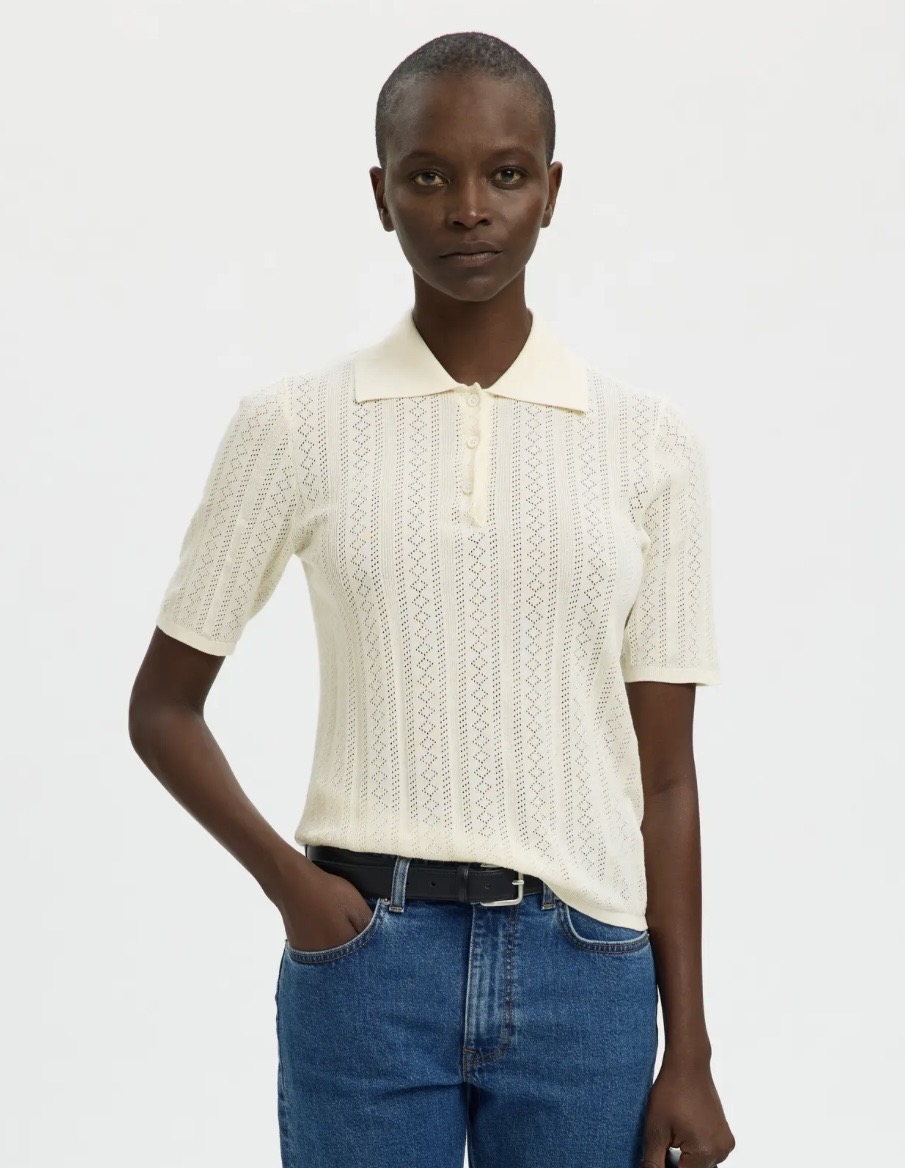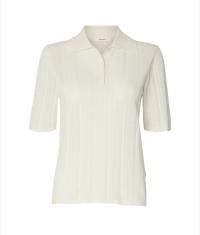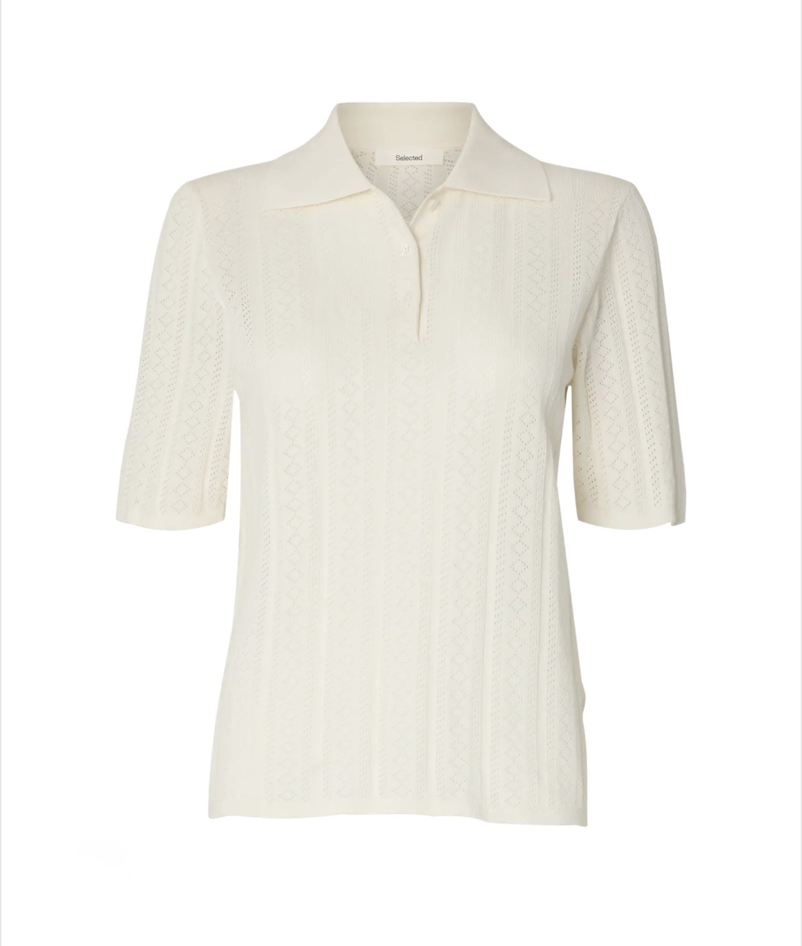 »Toledo structure 2/4 knit polo neck» fra Selected Femme. Klassisk hvit polo med krage og kort erm.