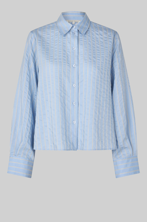 "Syracuse new shirt" fra Second Female er en oversized stripete skjorte. Den har krage, lang erm og lukkes med knapper.
