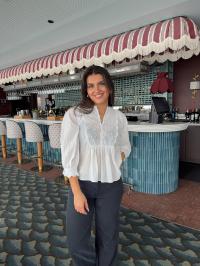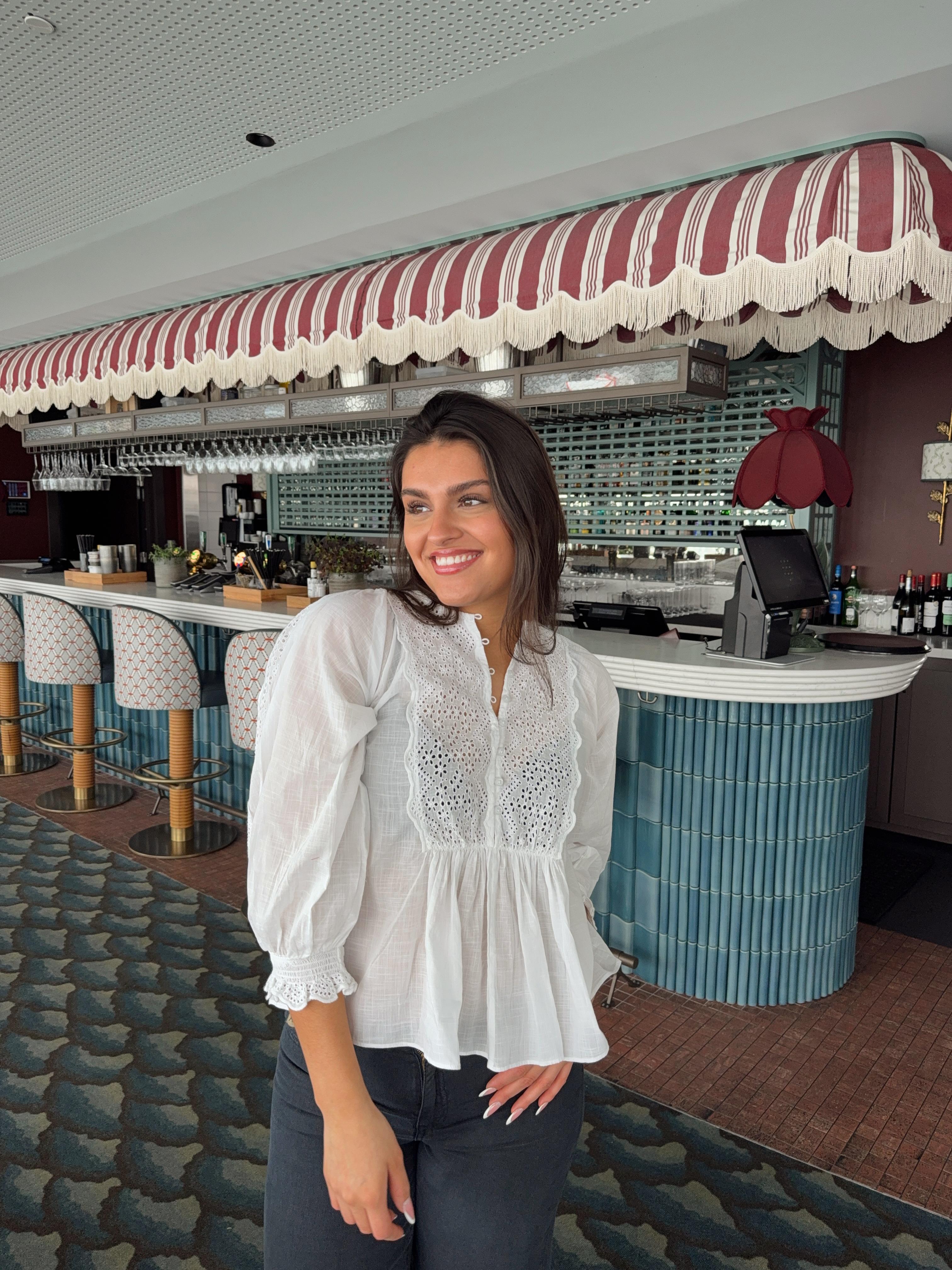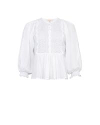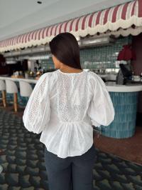«Cotton Slub Blouse» fra byTiMo. Blusen er laget i byTiMo sin lette og myke, GOTS-sertifiserte kvalitet, med slub-detaljer i stoffet. Blusen har en avslappet silhuett med oversized, vintageinspirerte ermer med elastiske mansjetter. Den har rund hals og knapper nedover brystet. Blusen har vakre broderie anglaise-detaljer på brystet, ermene og mansjettene.