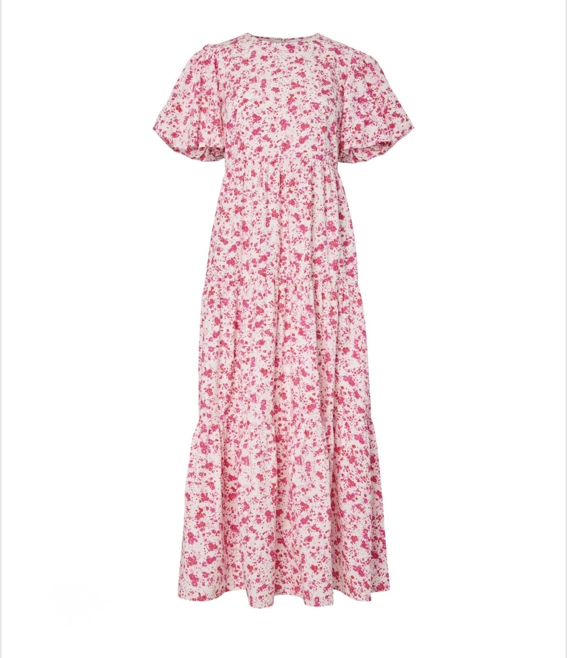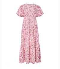 «Colea ankle dress» fra YAS er en vakker midi-kjole i nydelig print. Kjolen har rund hals og store korte puffermer. Lukkes knapper bak.
