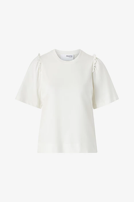 «Penelope 2/4 ruffle tee» fra Selected Femme er en T-skjorte med søte ruffle på ermene.
