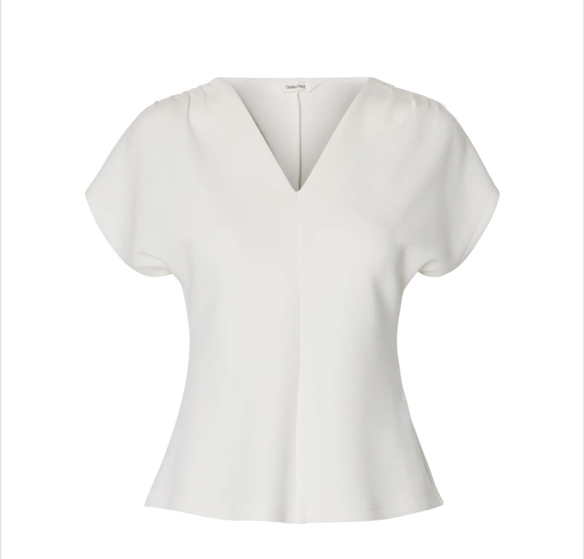 »Tenny v-neck gathered top» fra Selected Femme er en nydelig top i mørkeblå. Den har v-hals og kort erm. Innsving i midjen.