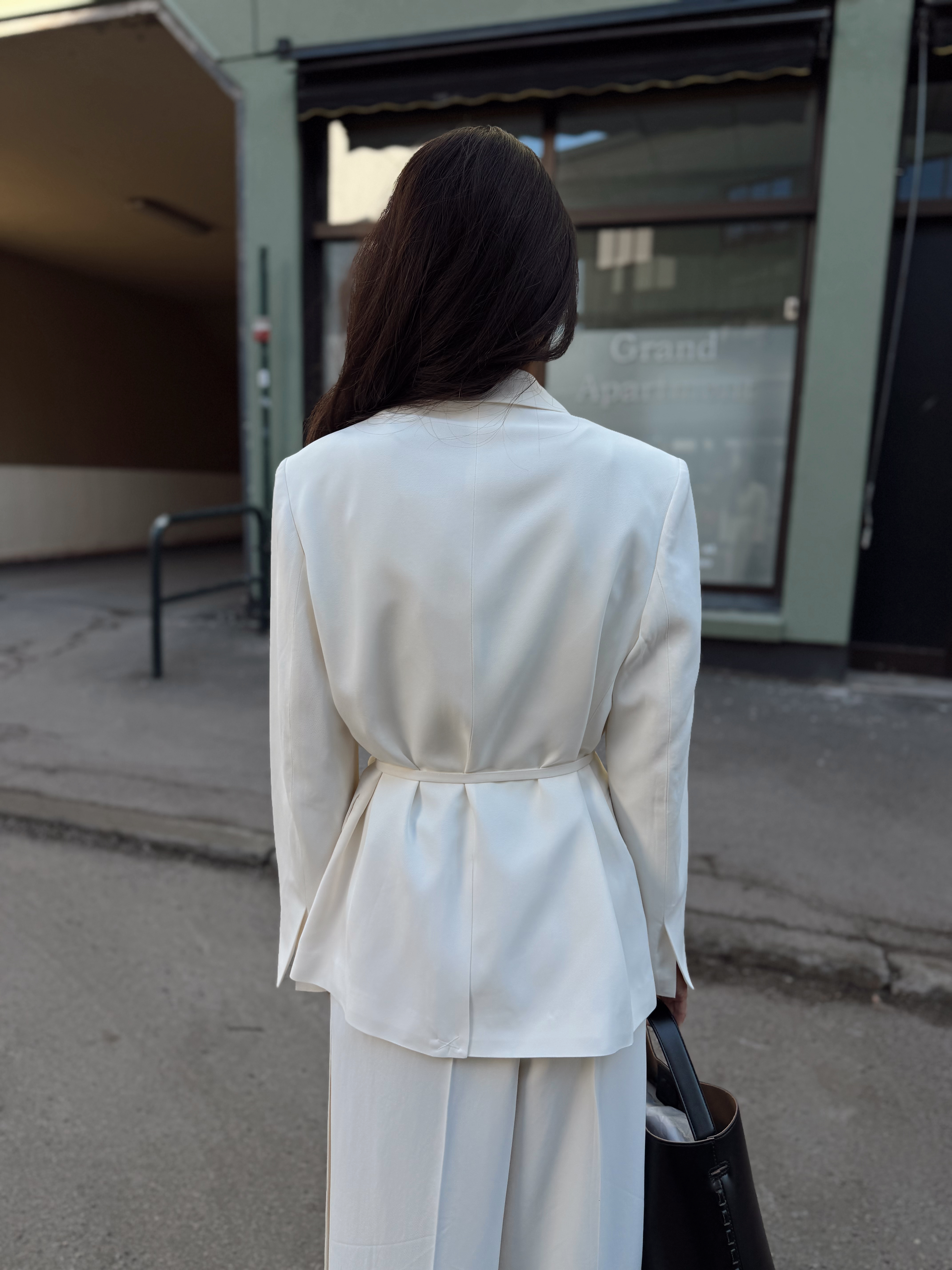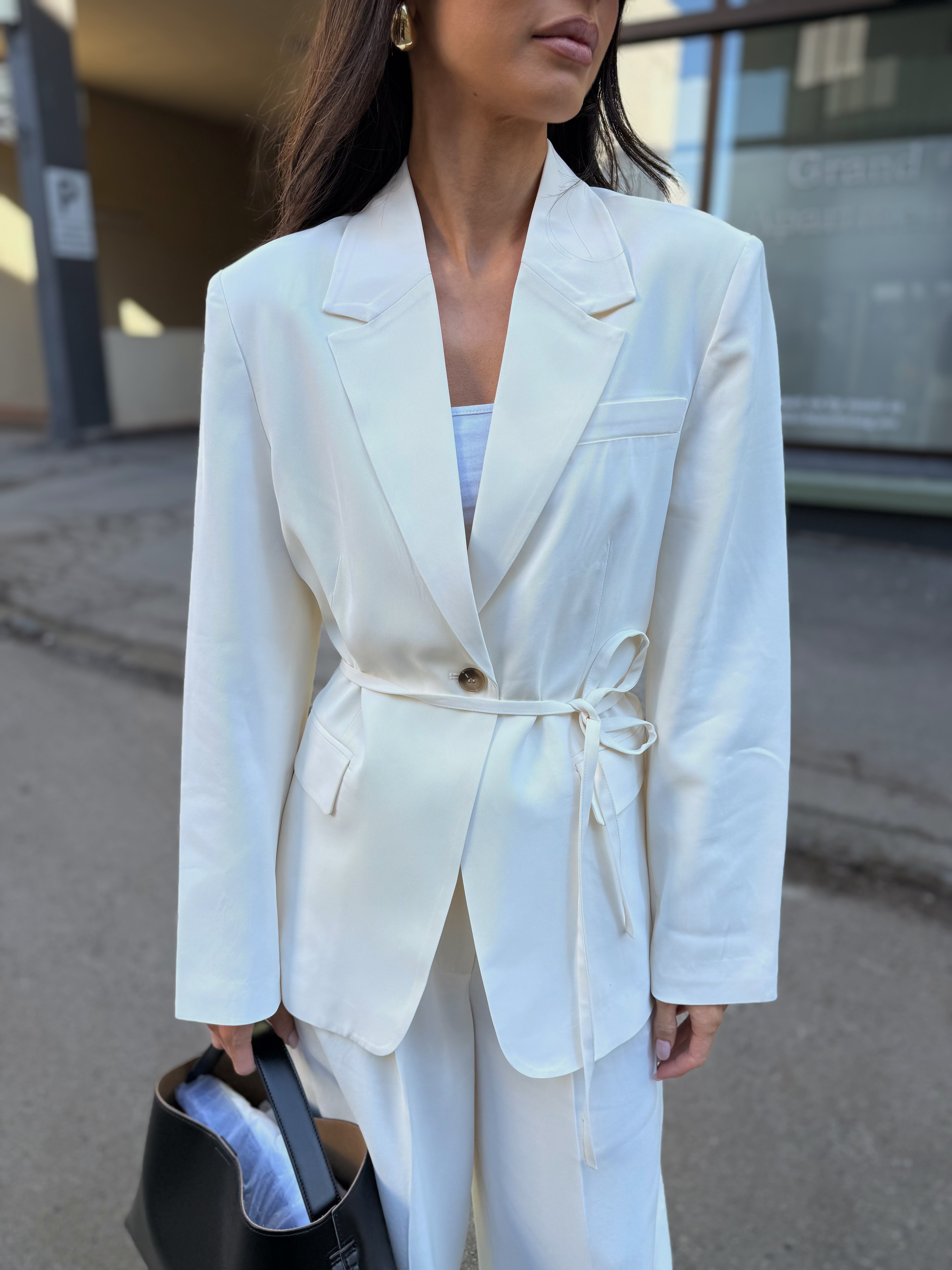 «Ellie blazer» fra Selected Femme er en rålekker hvit blazer med skulderputer og knyting i midjen. Lukkes med knapper.
