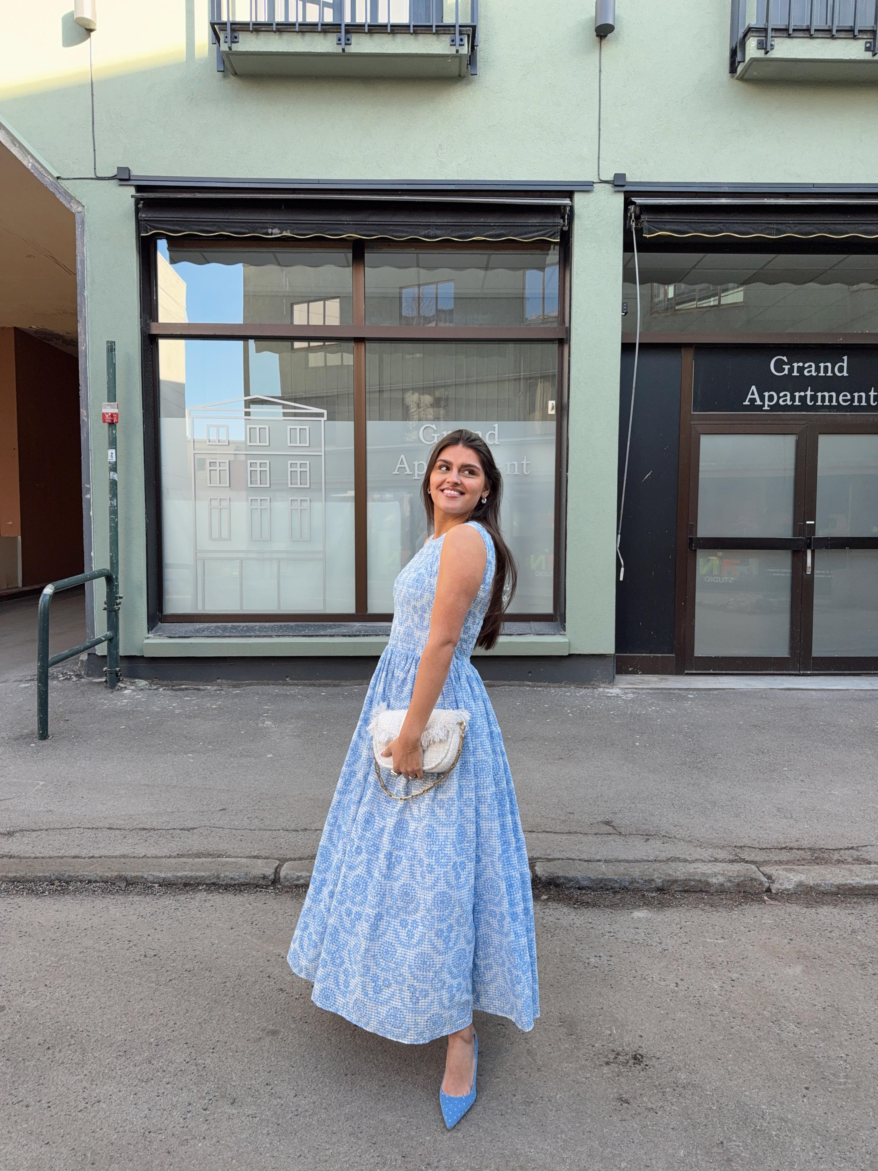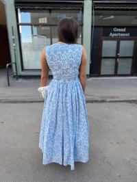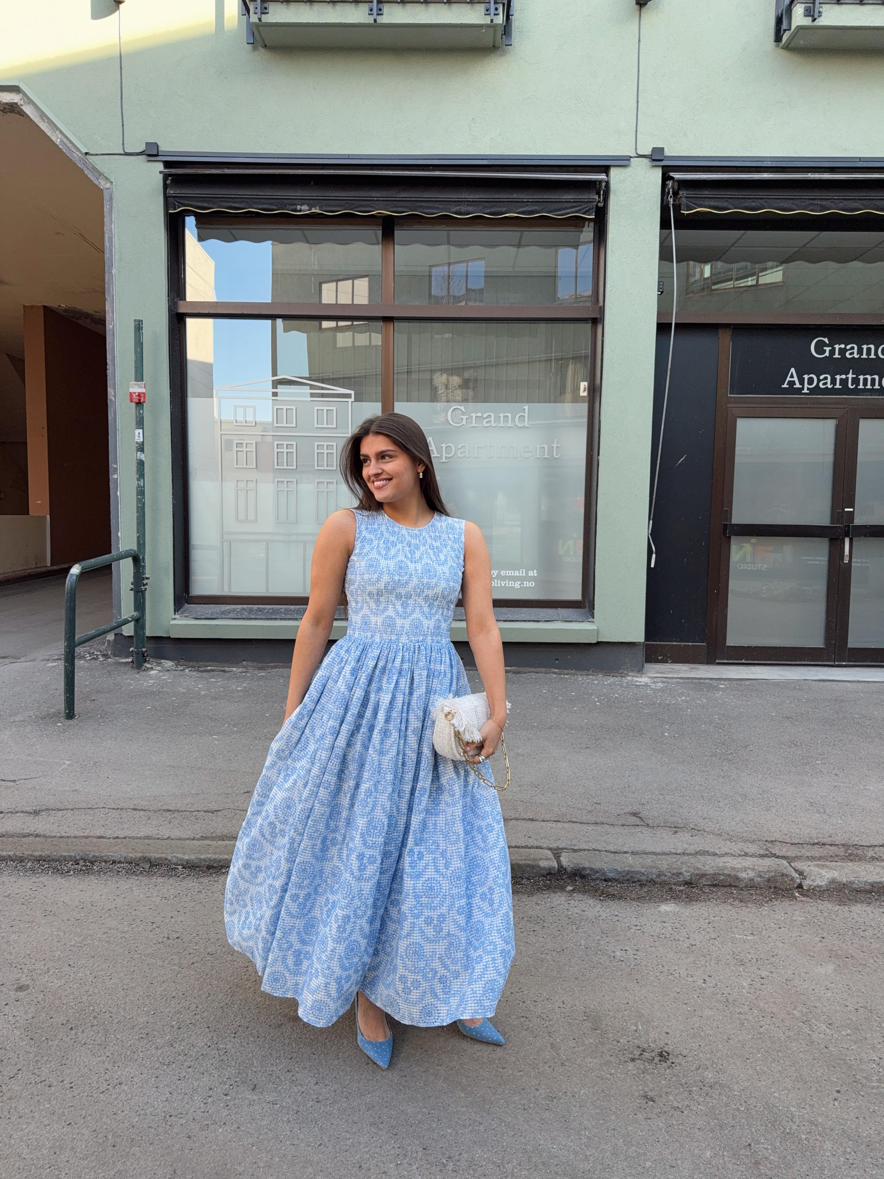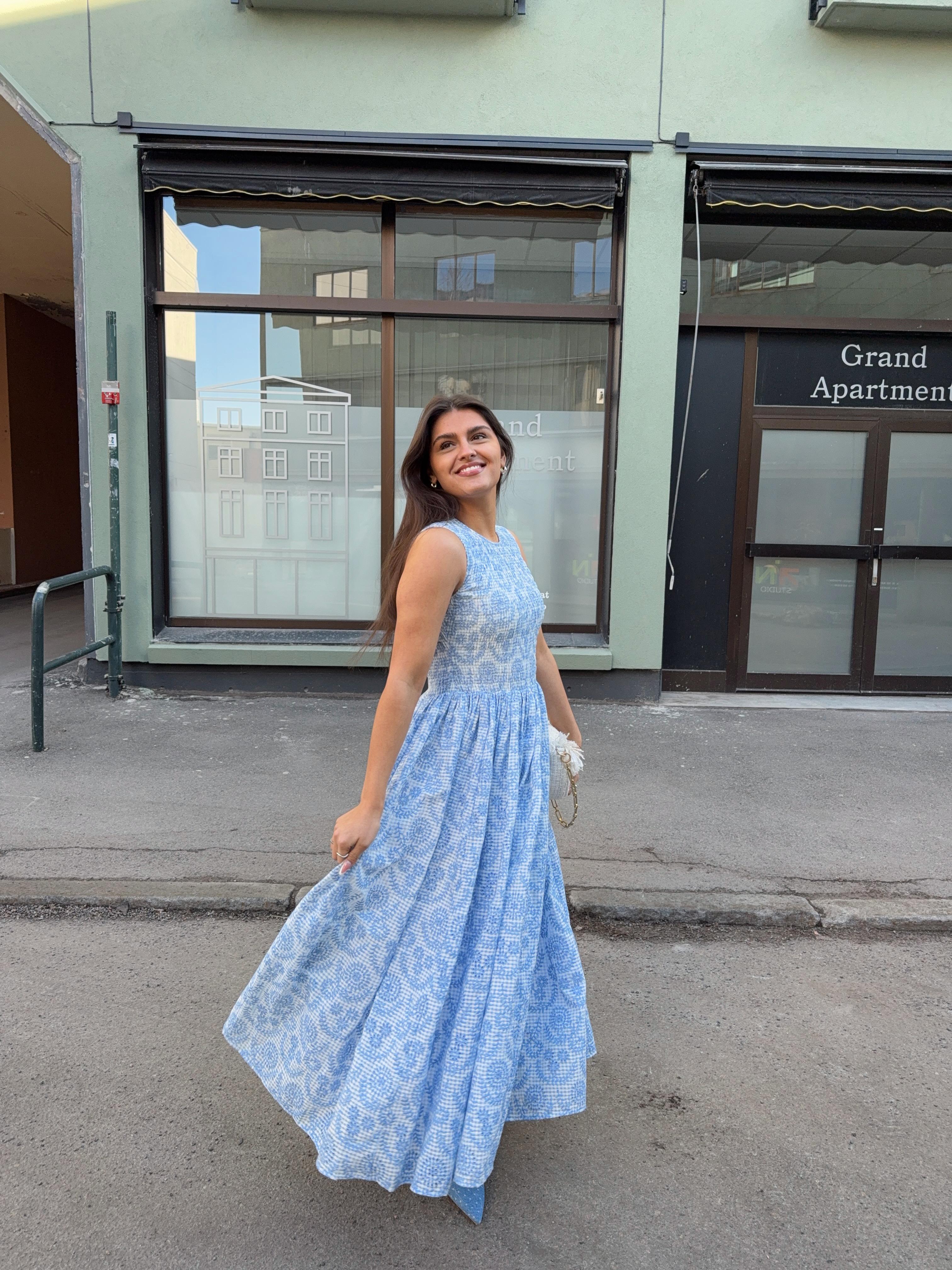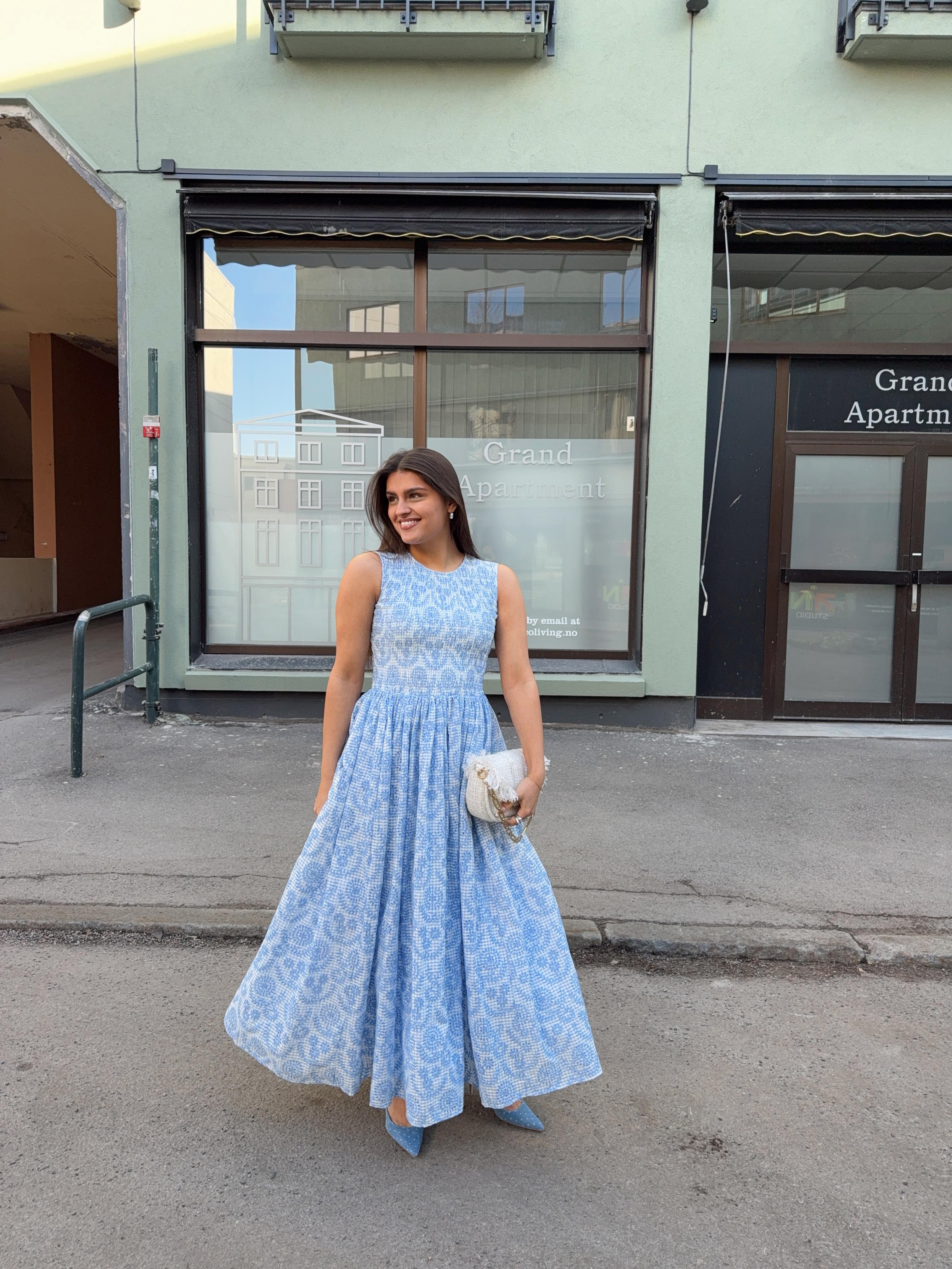 "Checks Maxi Dress" fra byTiMo er en kjoledrøm uten ermer. Den er lang med rund hals og en overdel med smocking effekt, Skjørtet har rynking i midjen som gir volum og bevegelse.