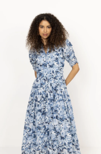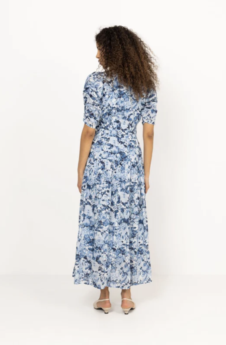 Fabienne Dress fra MISSMAYA er en vakker og luftig midikjole i nydelige blåtoner. Kjolen med sin normale passform og V-hals gjør den til et perfekt plagg som passer til både hverdag og festlige anledninger. Kjolen har korte ballongermer med strikk i enden og et rynket, elastisk parti i midjen som gir en flatterende silhuett. Skjørtet faller løst til midt på leggen, og består av flere lag som gir den et elegant volum.