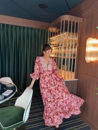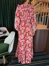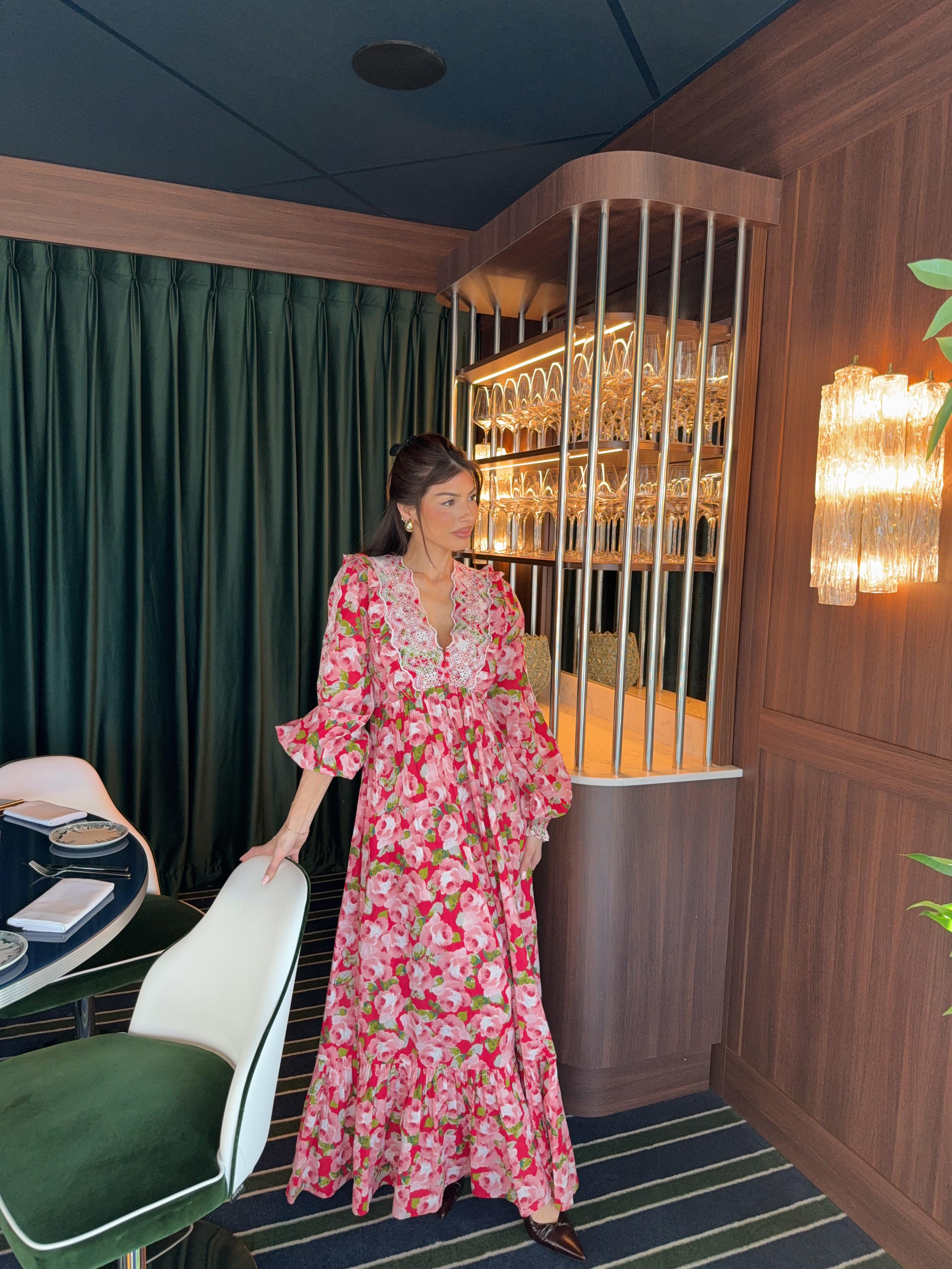 "Cotton Slub Maxi Dress" fra byTimo. Super fin maxi kjole med flere kapper på skjørtet, kjolen har v-hals og vakker brodering på!