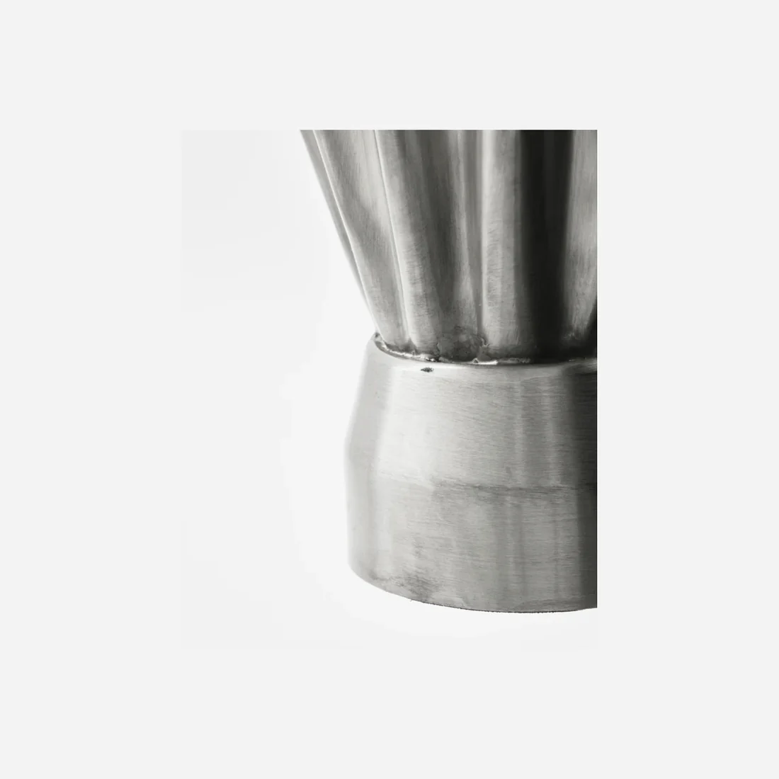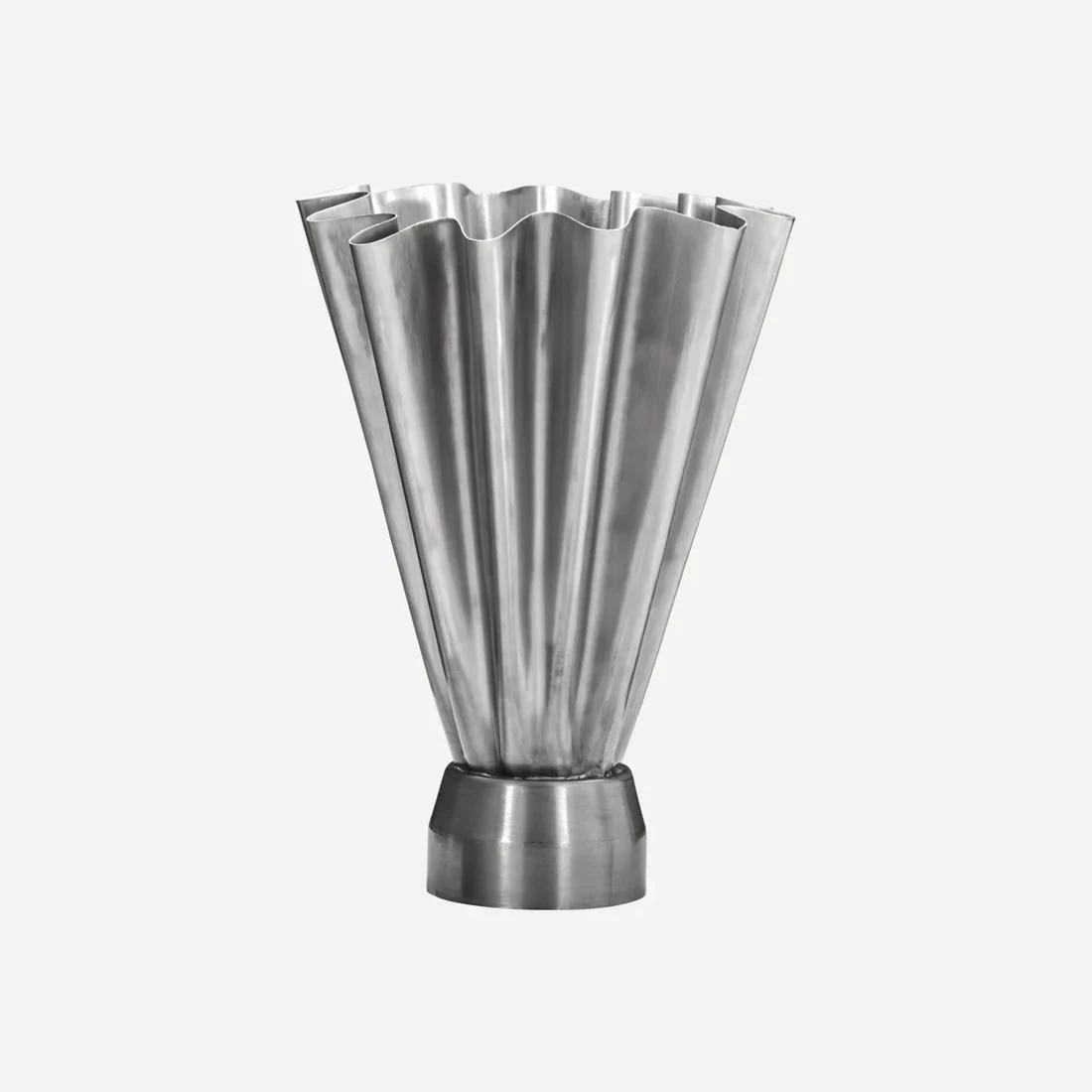 Et blikkfang som forvandler enhver konsoll, spisebord eller hylle til et kunstnerisk utstillingsvindu. Den børstede sølvfinishen og den bølgete, håndformede formen gir vasen et moderne preg, samtidig som den tilfører interesse og dybde til innredningen din.