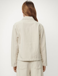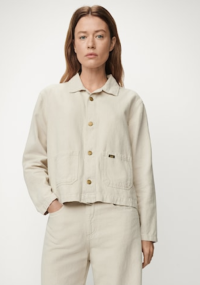 «Vega lino Naturel» fra Lois. Tøff kort sommerjakke med krage, to brystlommer samt knappelukking foran. Den er designet i en løs passform med legg bak ryggen.