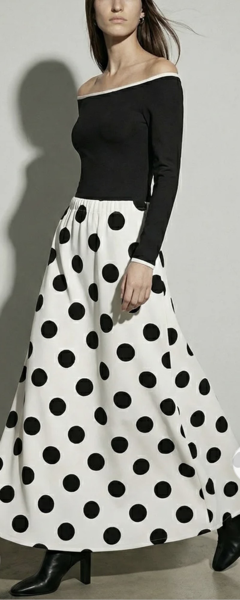"Enya Maxi Skirt" fra Hypedrop. Lekkert a-formet skjørt med en maxi lengde. Skjørtet har strikk i midjen og lekre prikkedetaljer over hele.