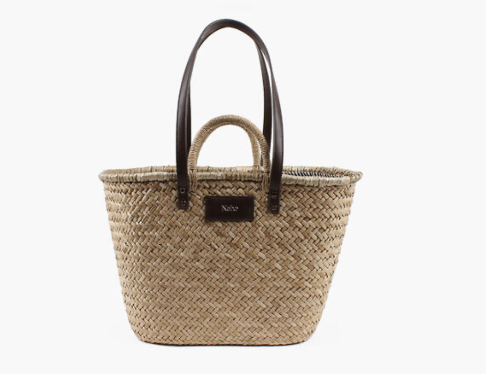 Vesken har en kompakt, kurvformet silhuett med solide håndtak og lengre skulderstropper i brunt skinn, som gjør den enkel å bære både i hånden og over skulderen. De varme skinn-detaljene skaper en fin kontrast til det naturlige strået og gir vesken et gjennomført og sofistikert preg. En diskret logo i front fullfører designet.