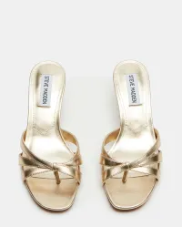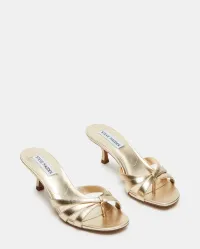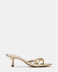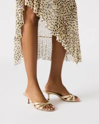 Cary er en elegant sandal i gullfarget skinn. Den strappy mule-silhuetten har slip-on design, smale kryssremmer og firkantet, åpen tå som gir et moderne uttrykk. En avsmalnende kitten-hæl løfter uten å kompromisse på komfort. Den tidløse gullfinishen gjør den perfekt til bryllup, sommerfester og kvelder ute – like fin til kjoler som til skreddersydde bukser.