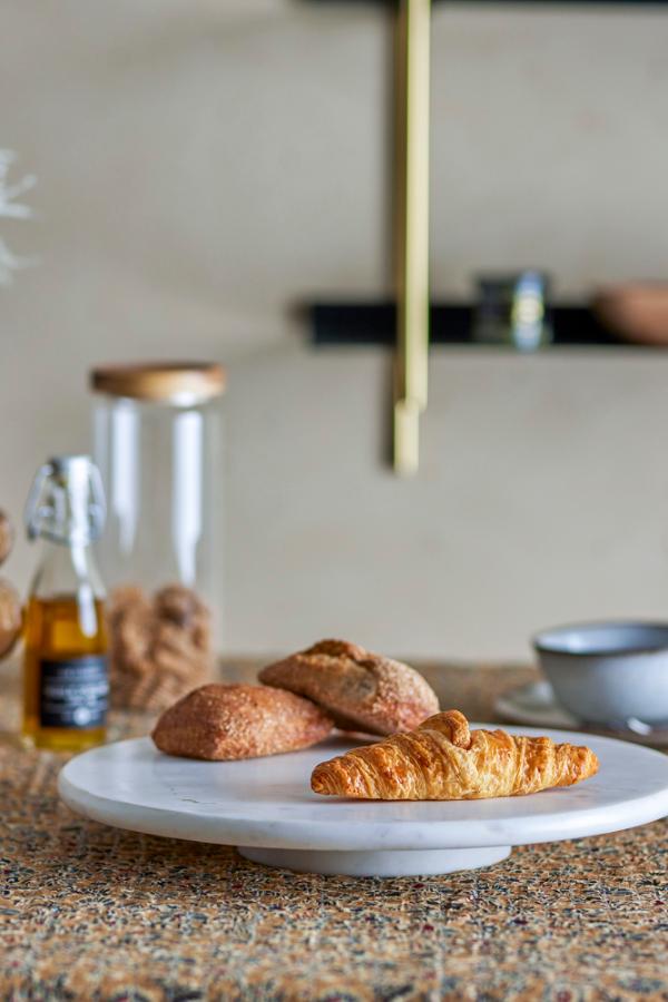 Denne enkle og elegante dreieskiven er laget i hvit marmor, noe som virkelig bidrar til den sofistikerte følelsen den gir. Den lave profilen og den brede, flate platen gjør denne dreieskiven perfekt for servering av tapas, kaker, ost eller annen mat som er vakker i seg selv og som trenger å bli behandlet og vist frem med respekt. Fordi denne dreieskiven ikke har noen hevede kanter, er det enkelt å skjære i maten du legger på den.
