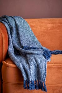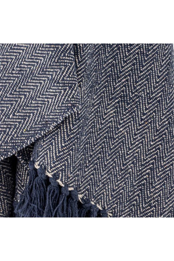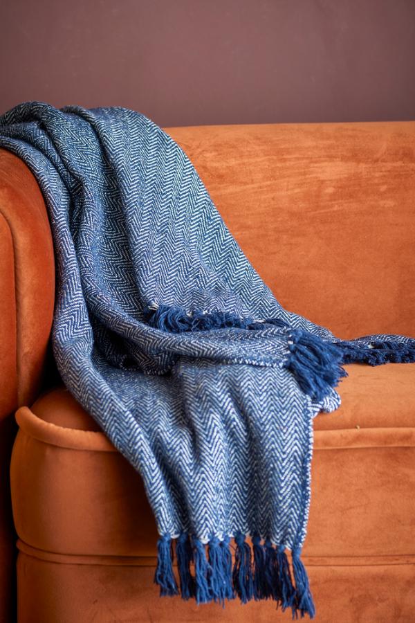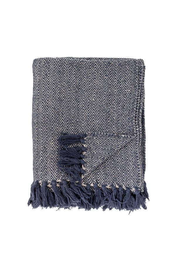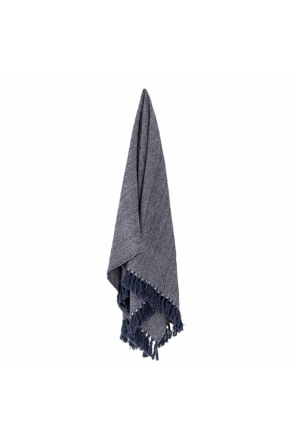 Fiskebensmønsteret fra Creative Collection er vevd av resirkulert bomull med et klassisk fiskebensmønster i dyp blått. De dekorative frynsene i endene understreker det myke og innbydende uttrykket.