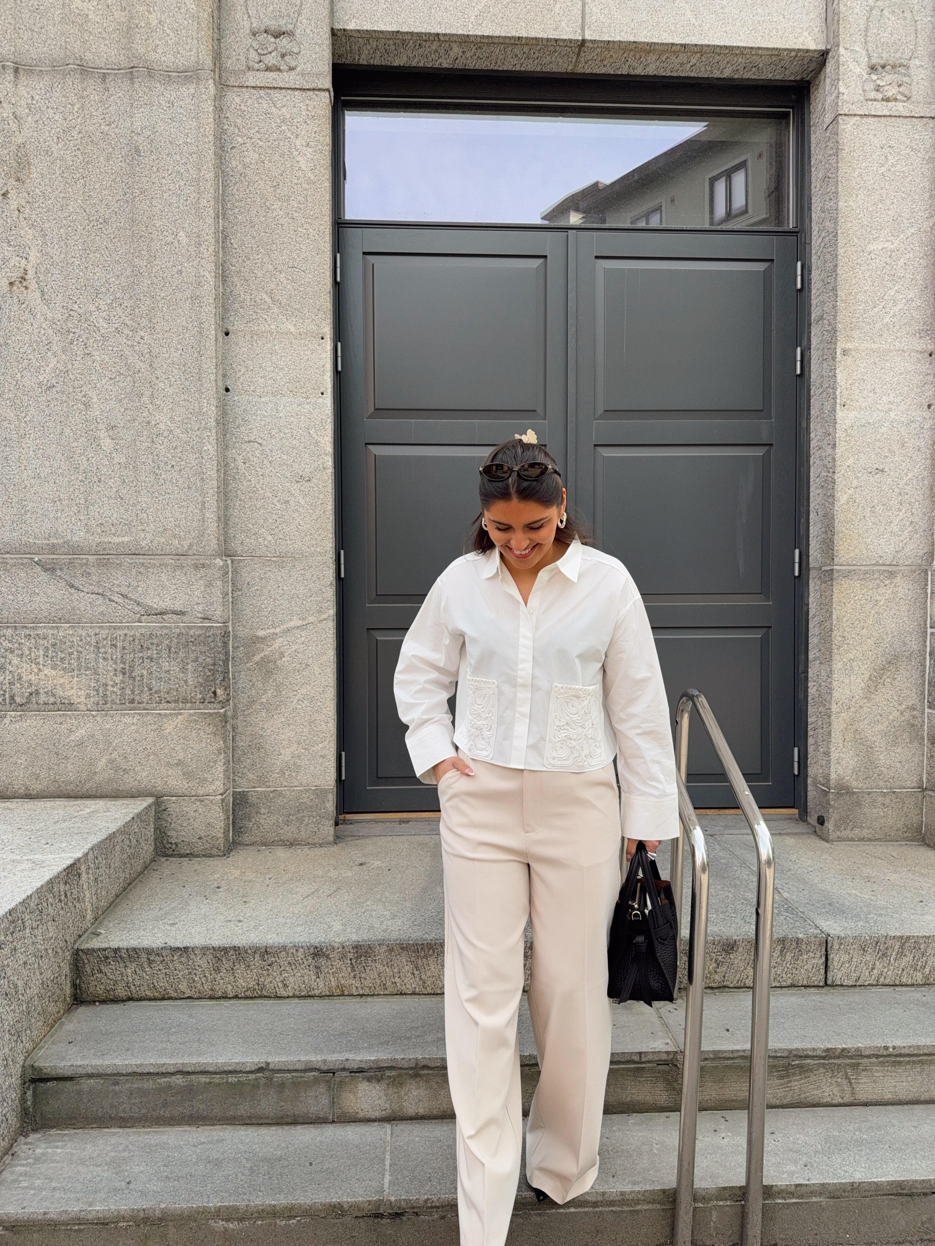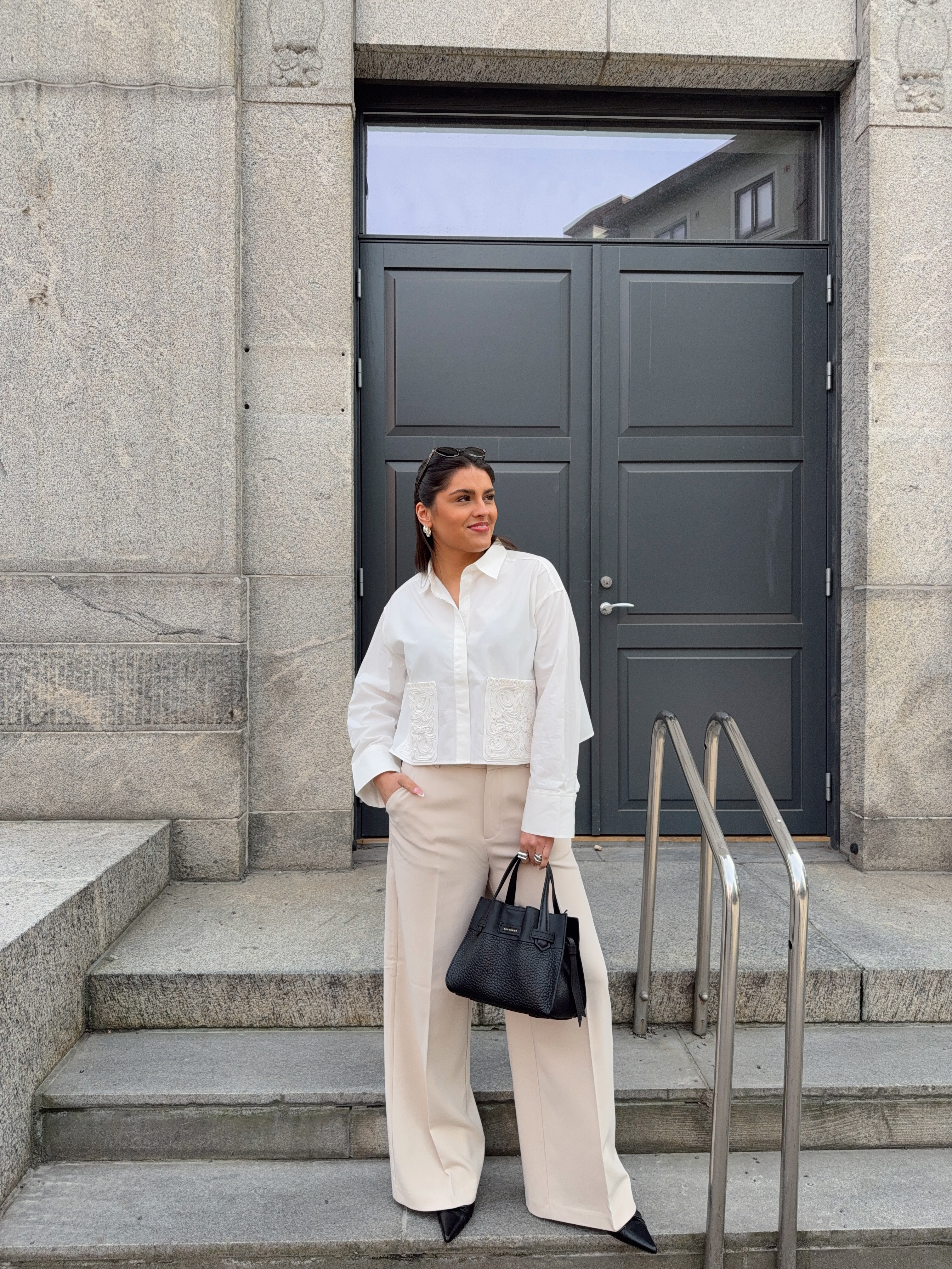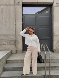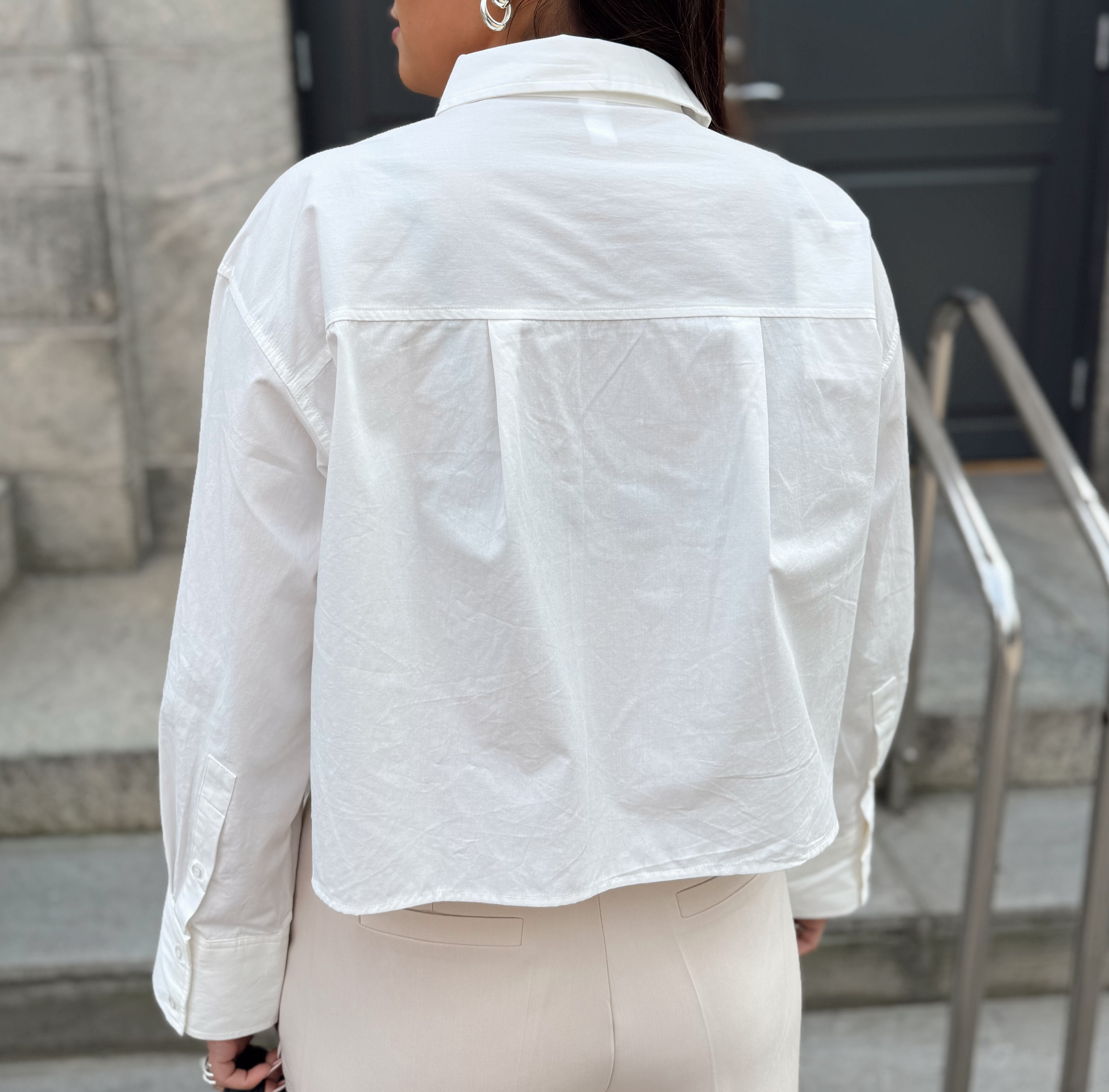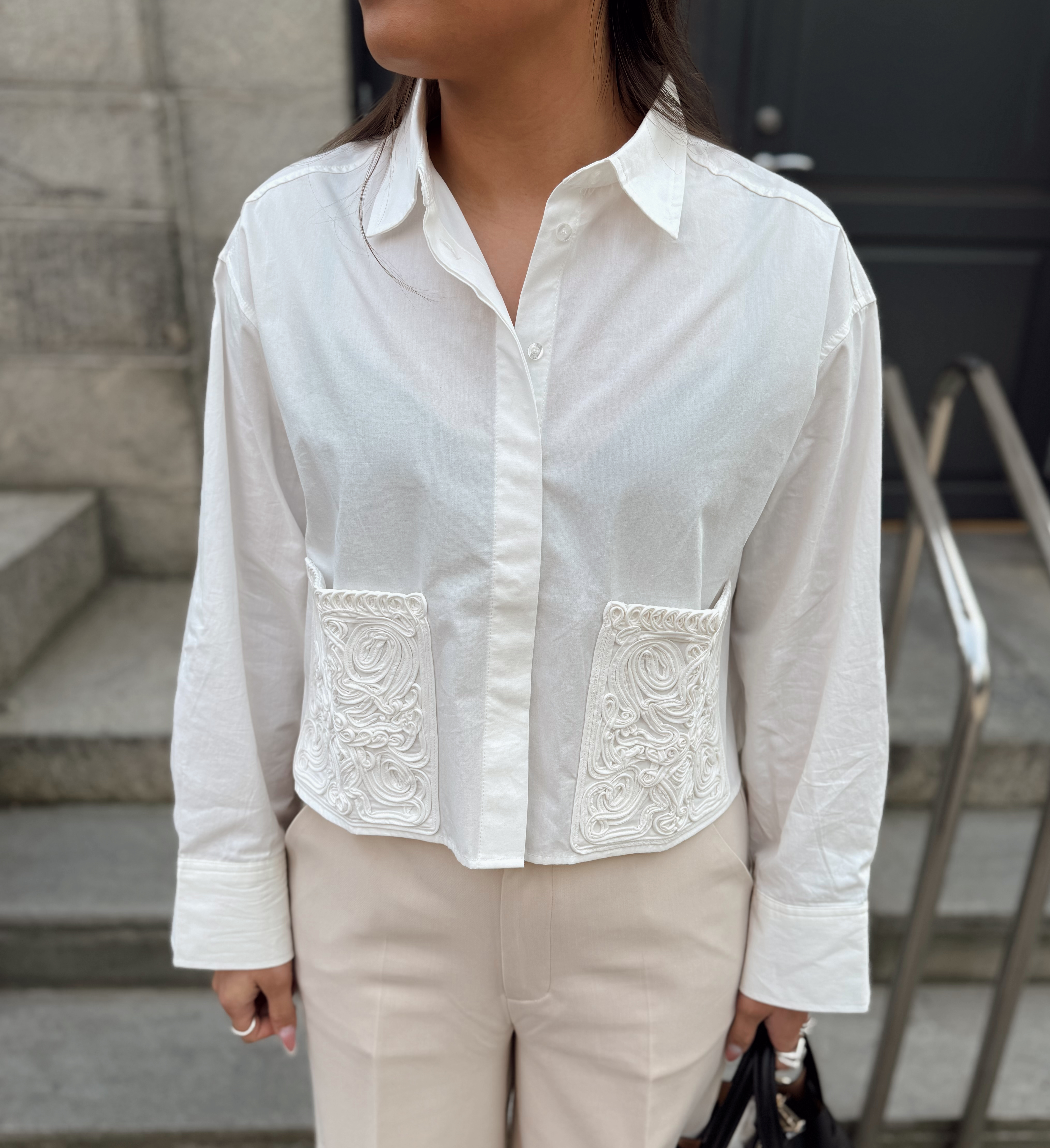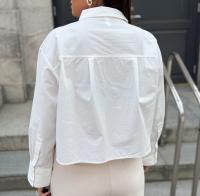 «Lee crochet short shirt» fra YAS er en hvit skjorte med krage og har lekre detaljer på lommene. Skjorten er kort i modellen.
