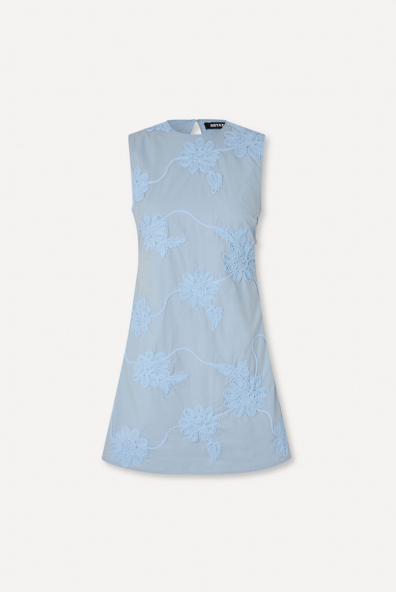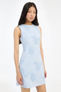 " Flower Mini Flared Dress" fra Rotate. Denne ermeløse minikjolen i fargen Italian Straw har et blomstermønster med broderte detaljer. Kjolen har en tettsittende passform, rund halsutskjæring og en delvis åpen rygg med knapp- og nøkkelhullslukking.