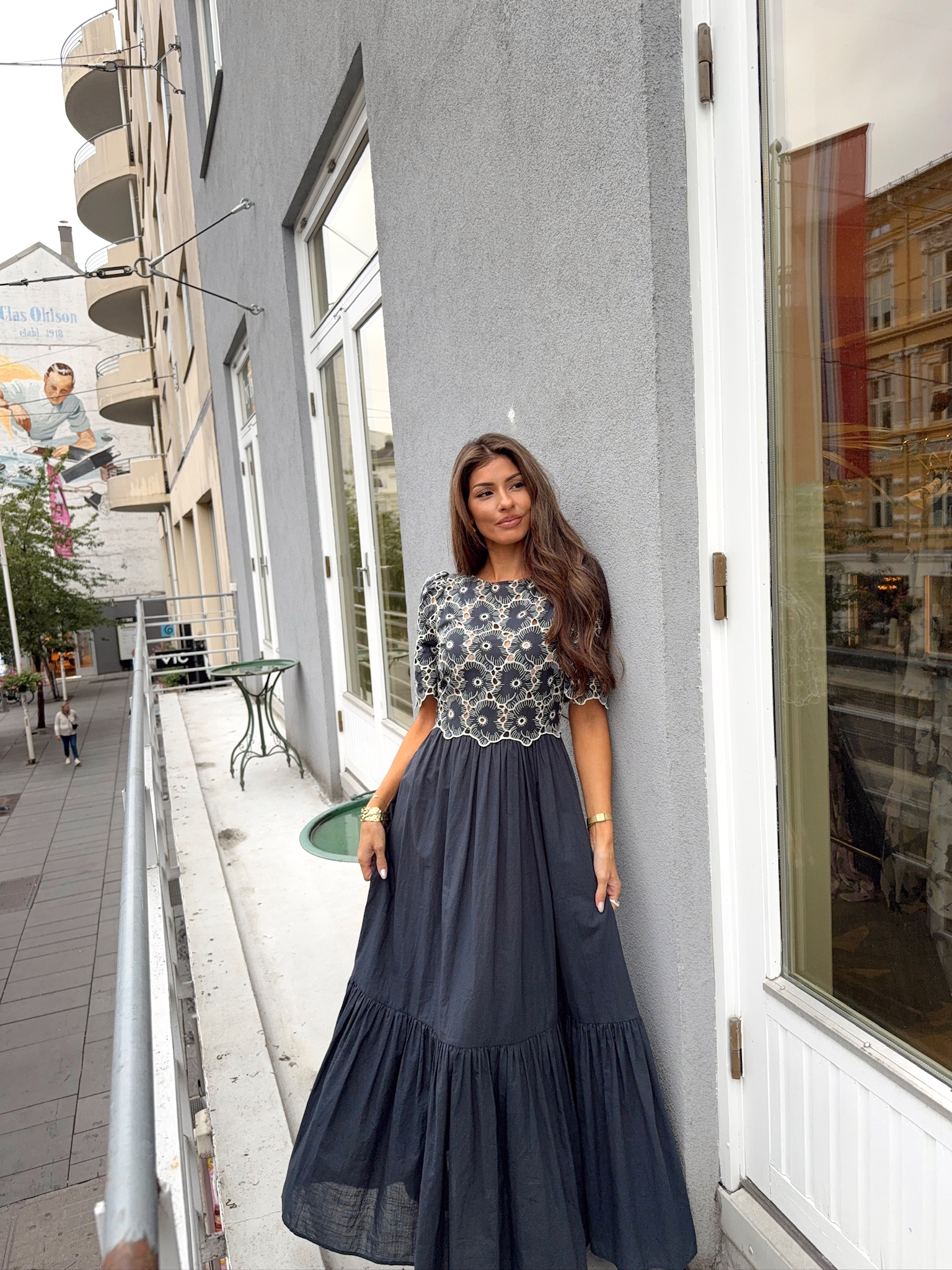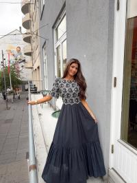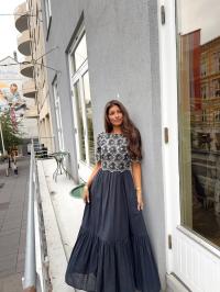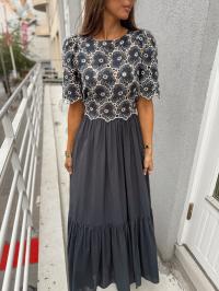 "Broderie Anglaise Maxi Dress" fra byTiMo. Denne kjolen er laget i byTiMo sin lette og myke GOTS-sertifiserte bomullskvalitet, med broderie anglaise-detaljer. Kjolen har maxilengde, en tettsittende overdel med rund hals, og ermer i albuelengde. Den har broderie anglaise-detaljer som dekker overdelen og ermene, samt en glidelås i siden.