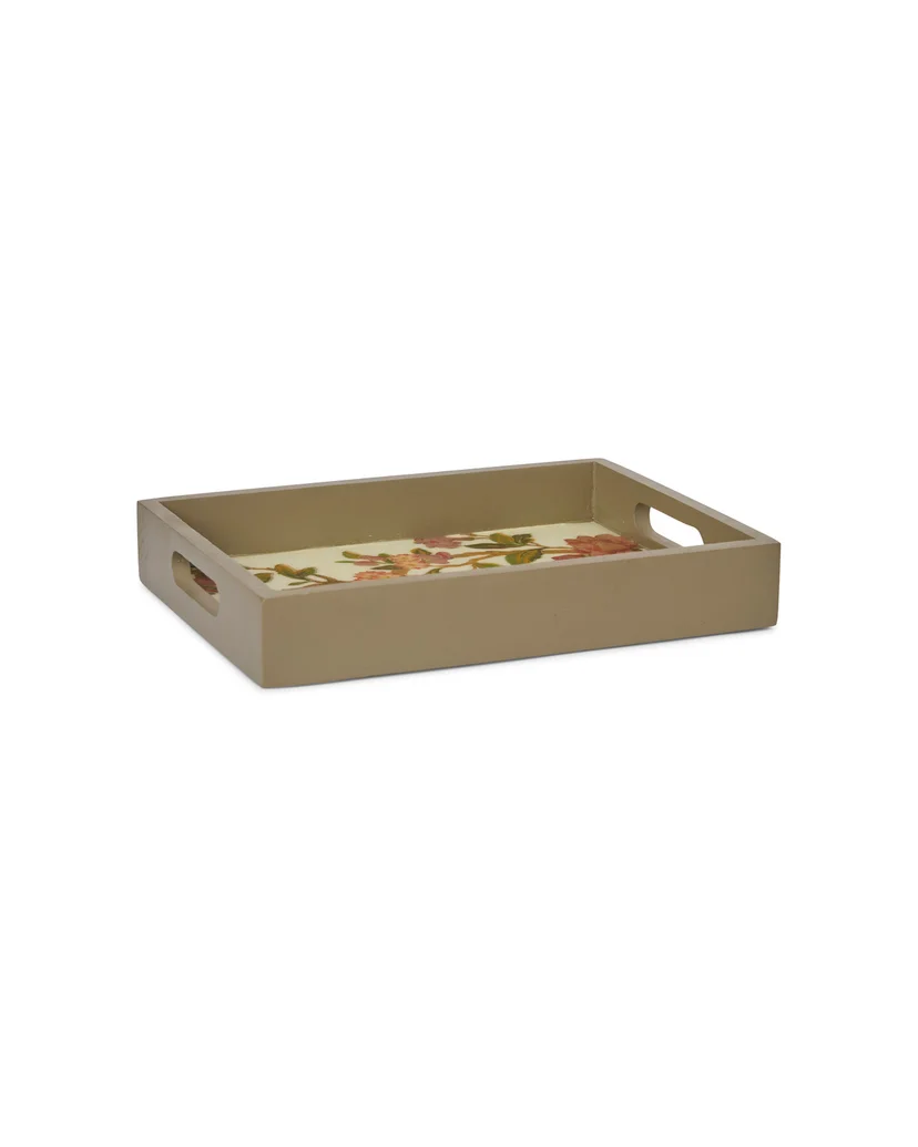 Vår trebrett er både dekorativt og funksjonelt. Laget av 100 % mangotre med en blank overflate inni, er det utsmykket med vårt romantiske blomstertrykk i varme toner av rosa, grønt og myke gyldne fargetoner mot en lysegrønn base.