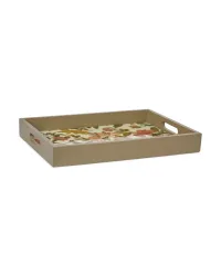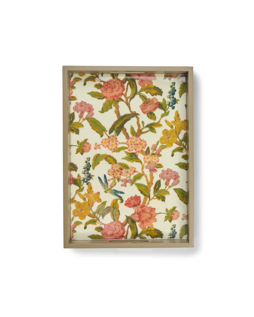 Vårt trebrett er både dekorativt og funksjonelt. Laget av 100 % mangotre med en blank overflate inni, er det utsmykket med vårt romantiske blomstertrykk i varme toner av rosa, grønt og myke gyldne fargetoner mot en lysegrønn base.