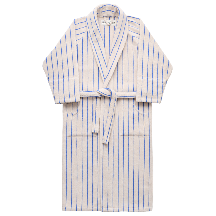 Badekåpen har sjalkrage, åpen front, beltelukking og to romslige lommer. Hvis du er høyere enn 176 cm eller foretrekker en oversized passform, anbefaler vi at du velger størrelse L/XL.