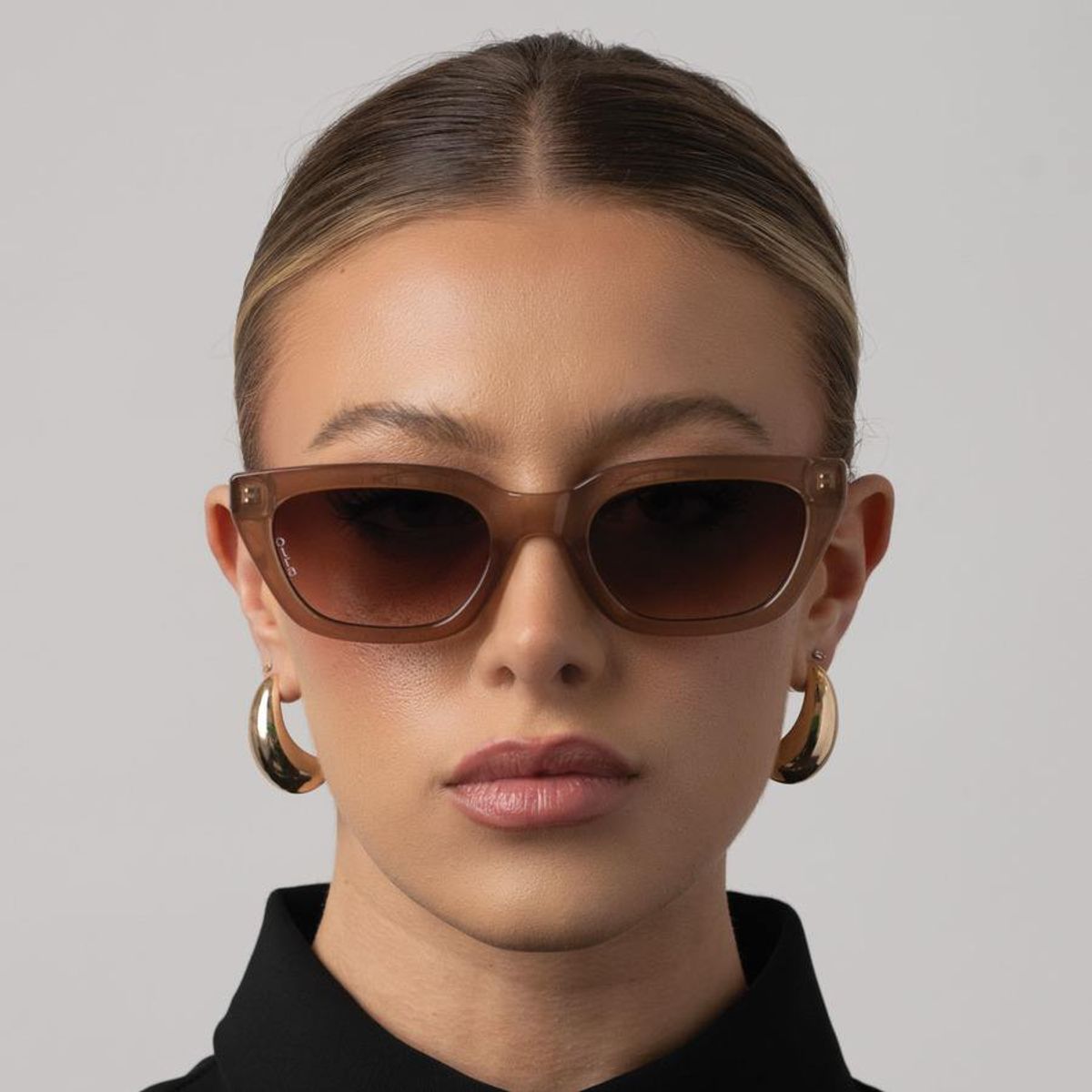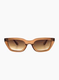 Nove fra Otra Eyewear er en trendy solbrille med en slank cat-eye fasong. Tynn ramme i brun farge og sotede linser. 100% UV beskyttelse.